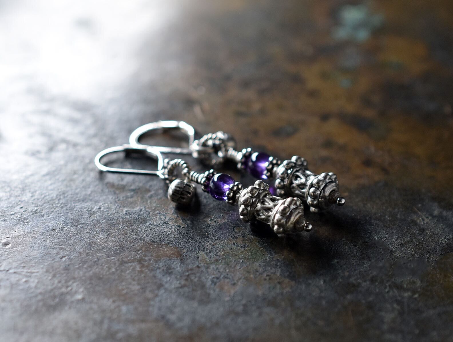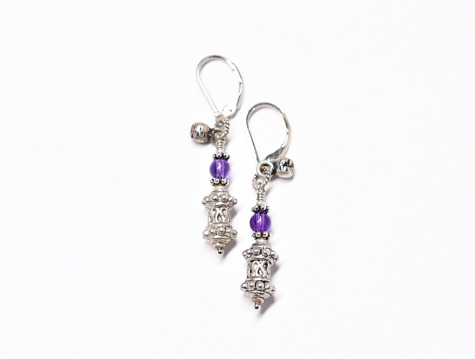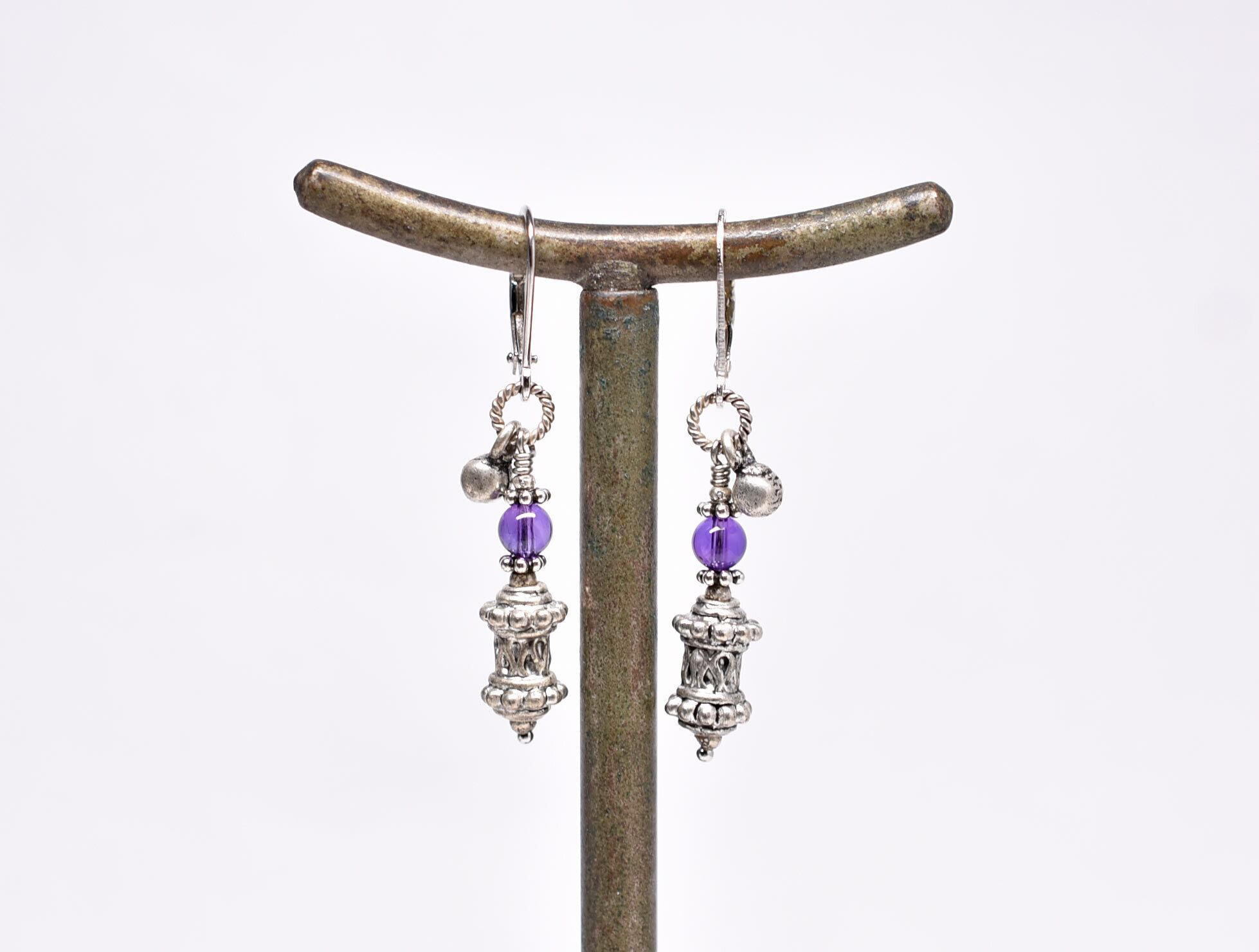 ランタンのようなインドピューター繊細細工パーツとアメジスト、小さなインド鈴のリングピアス