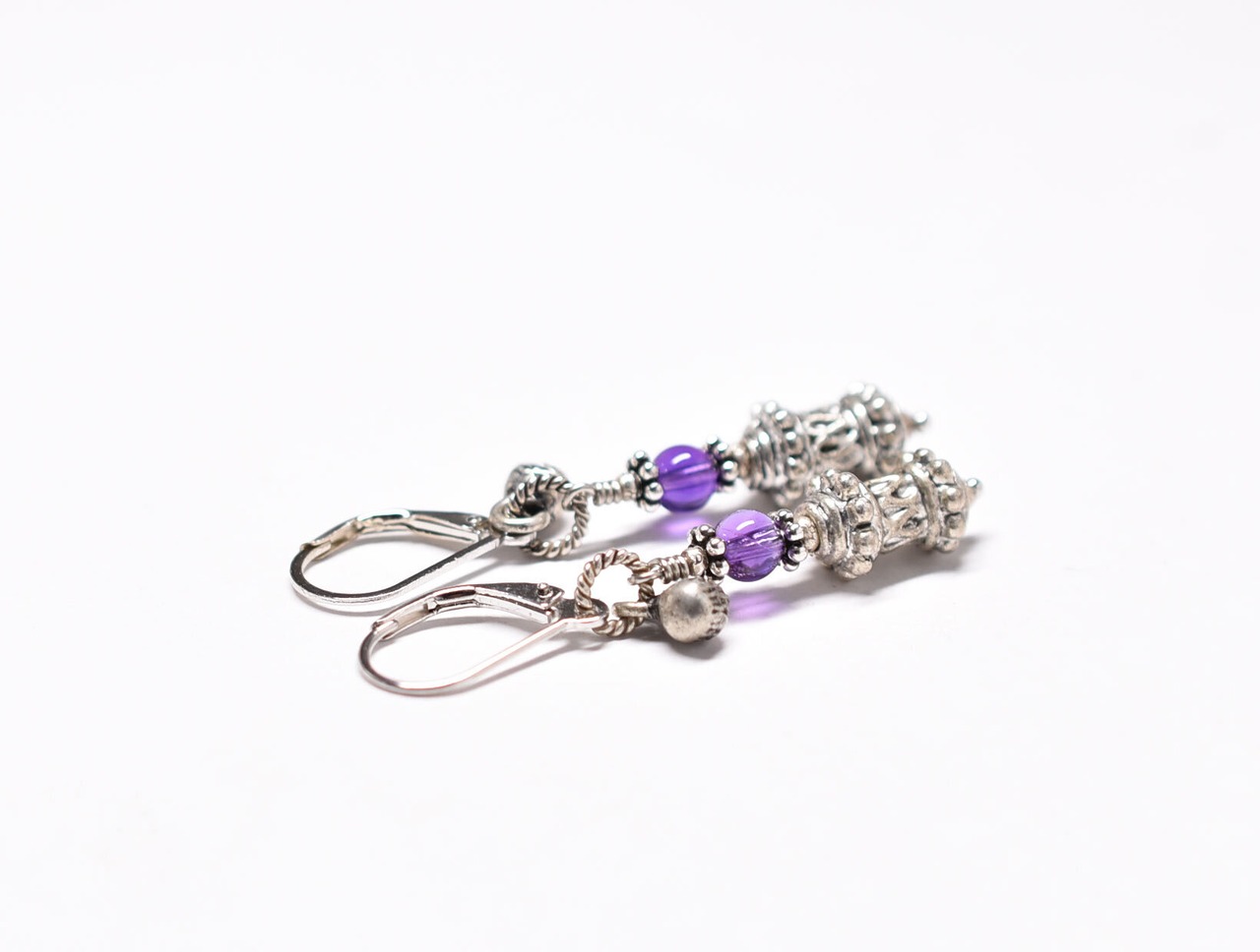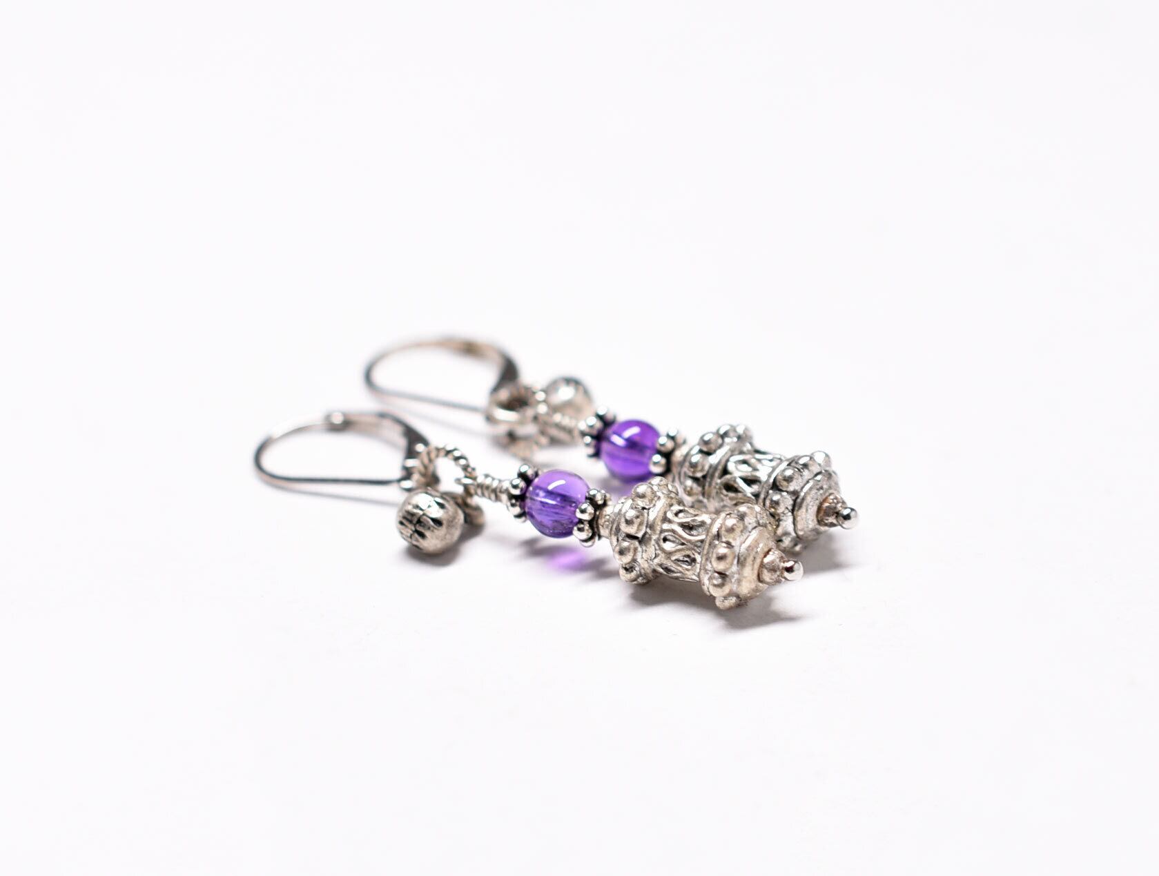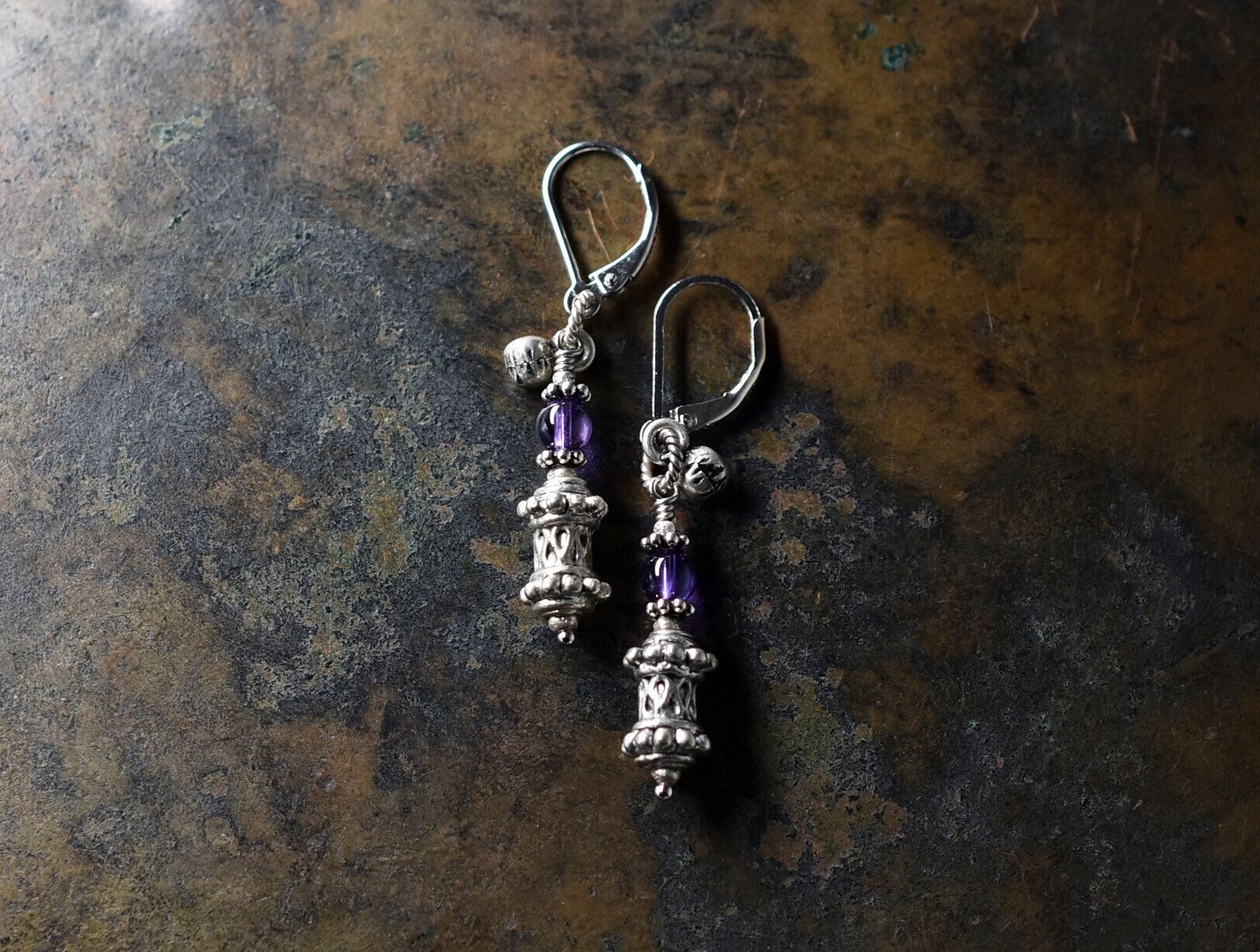 ランタンのようなインドピューター繊細細工パーツとアメジスト、小さなインド鈴のリングピアス