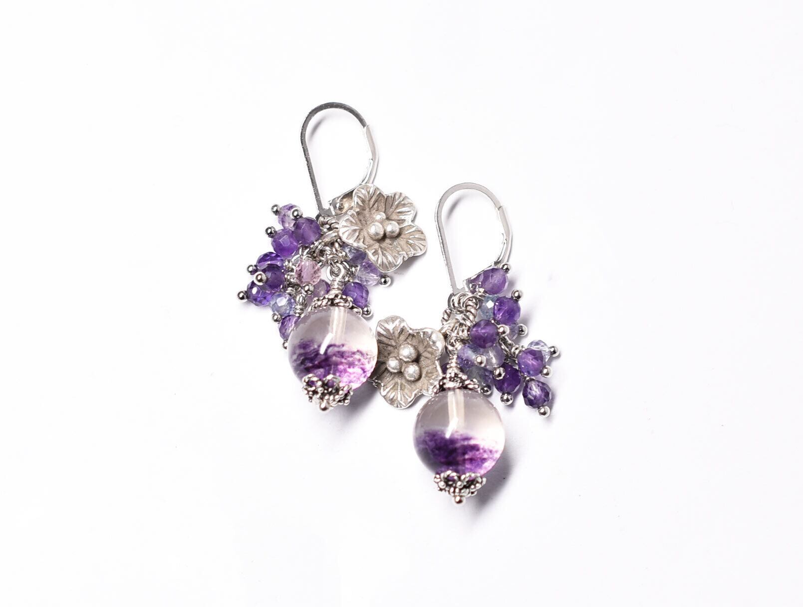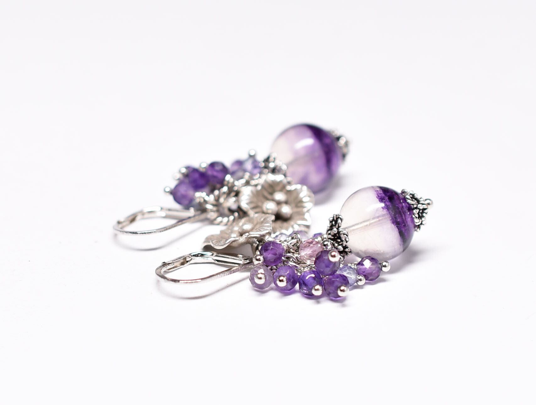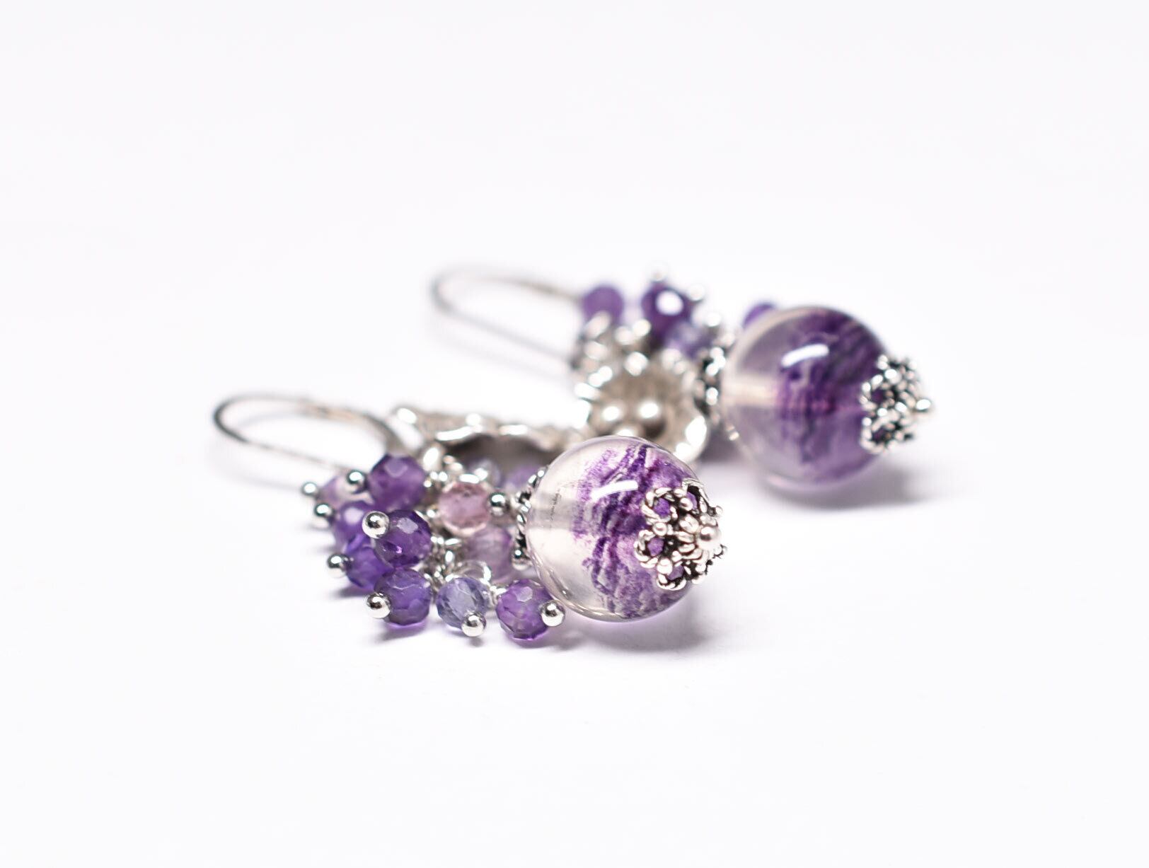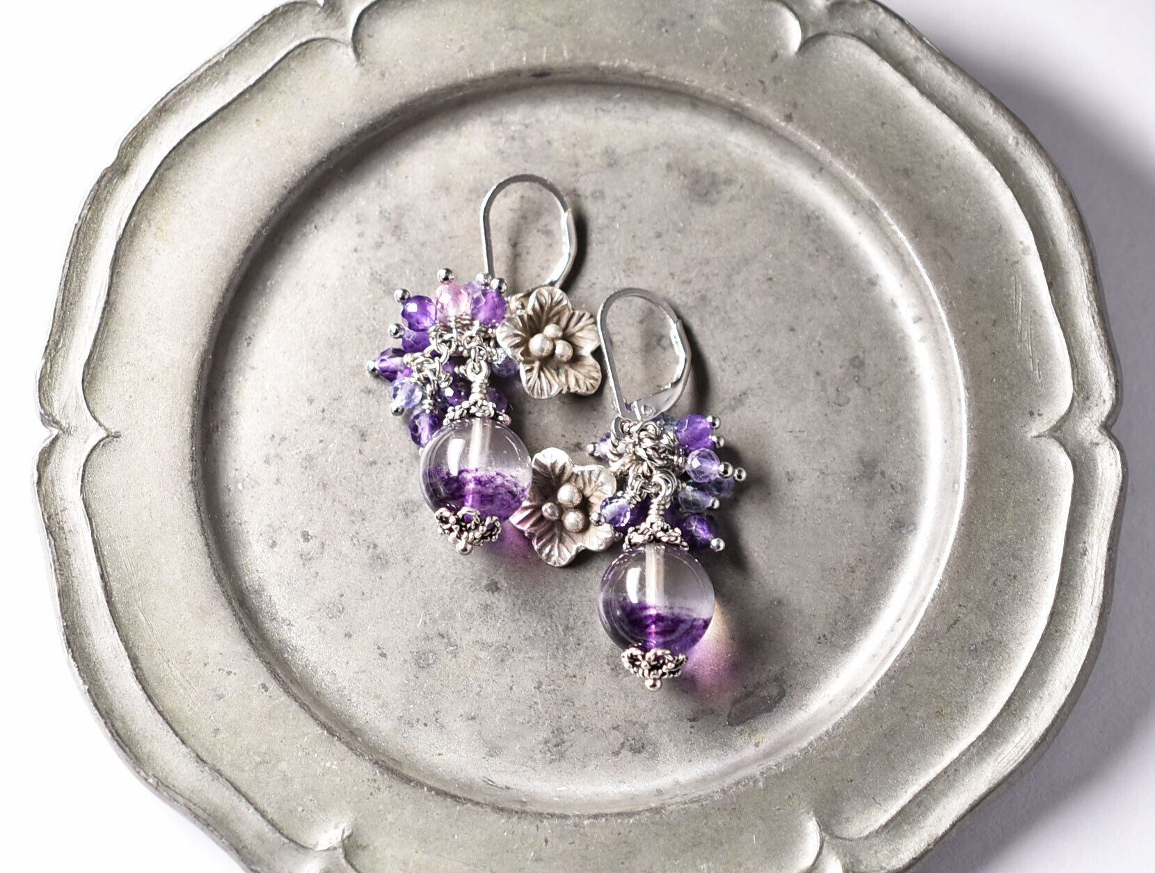 まん丸フローライトと小さなアメジスト&フローライト、カレンシルバーのお花ピアス