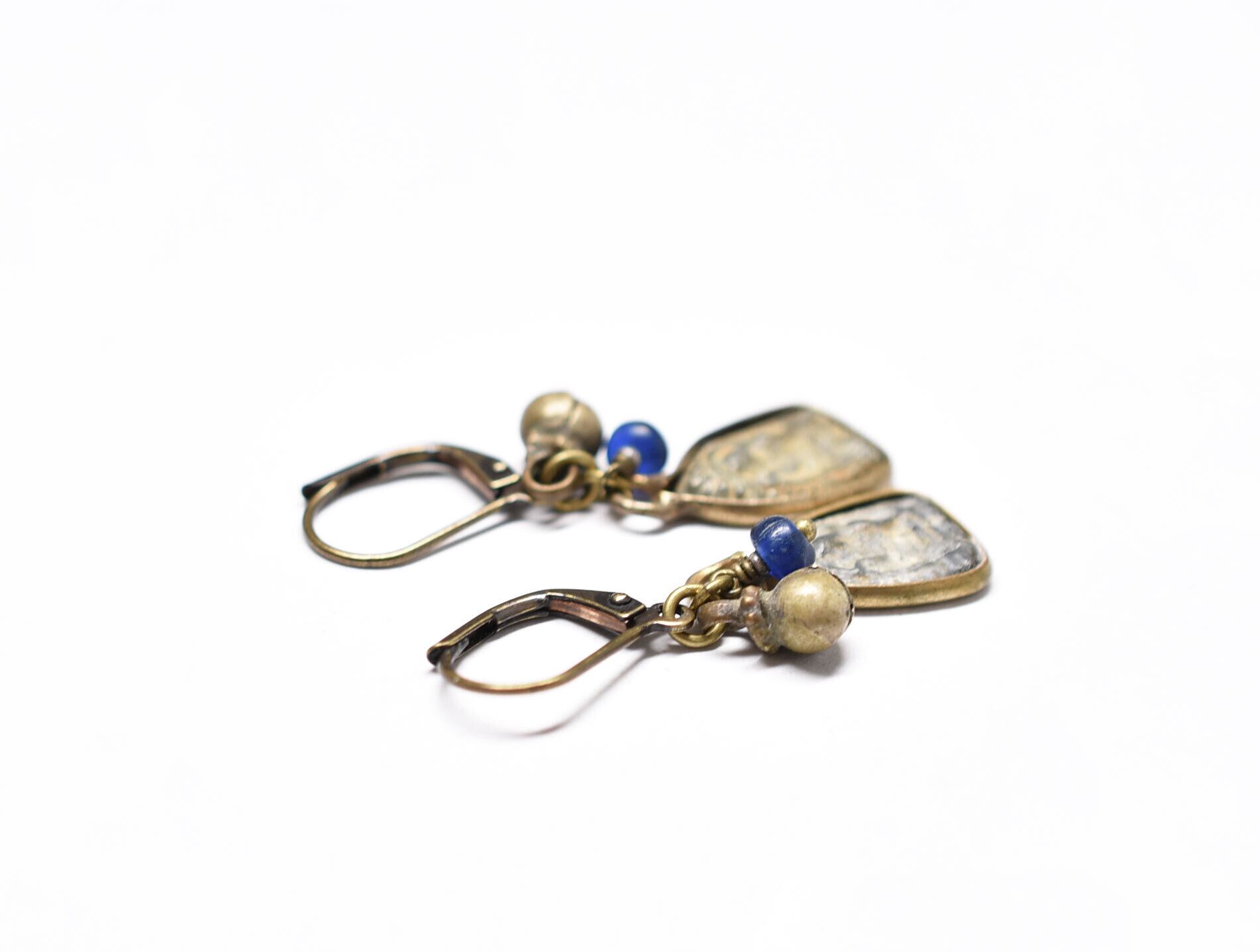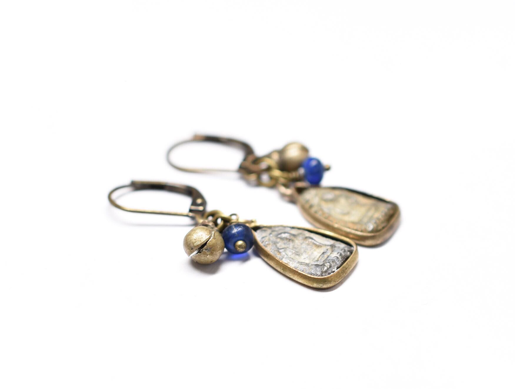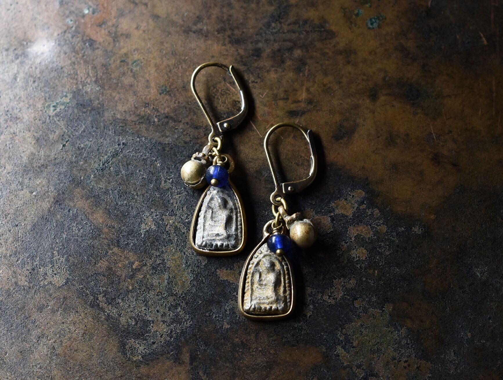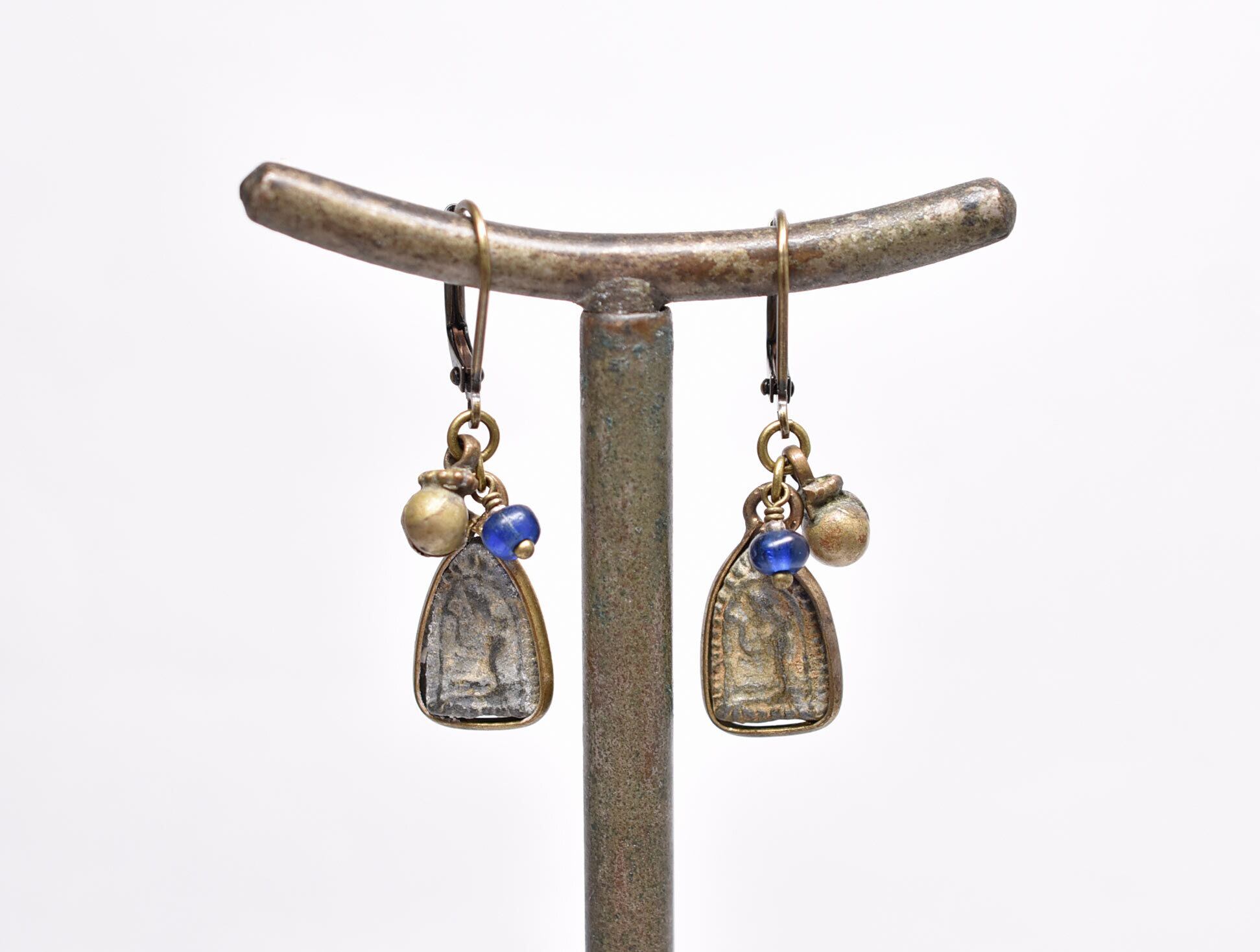 プラクルアンとブルーアンティークビーズ、民族鈴を繋いだピアスです。
