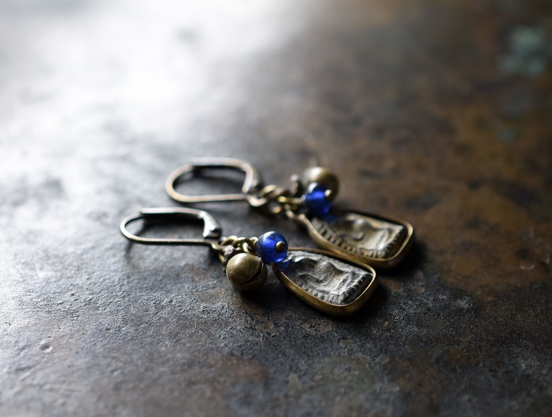 プラクルアンとブルーアンティークビーズ、民族鈴のピアス