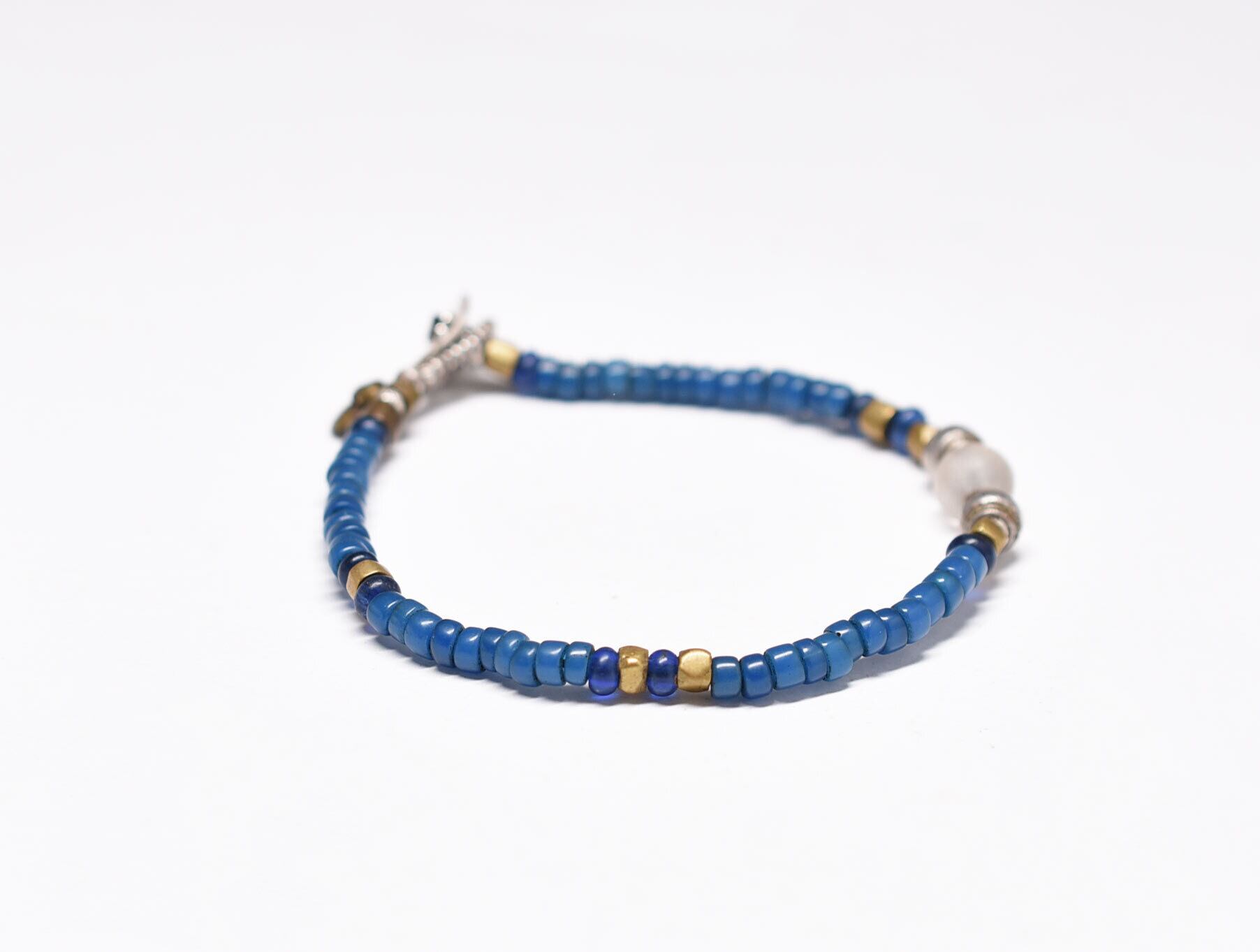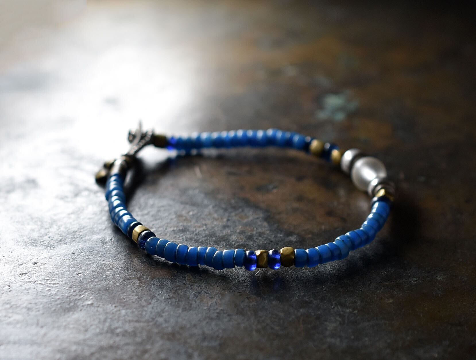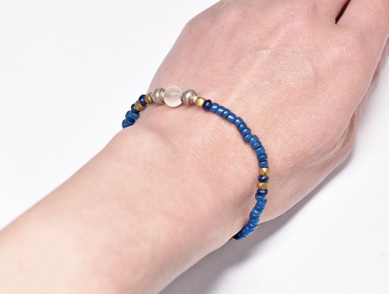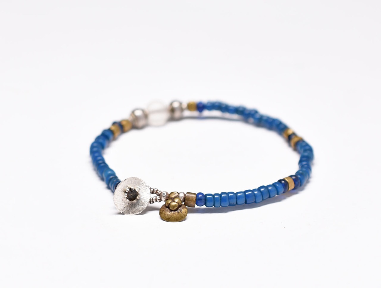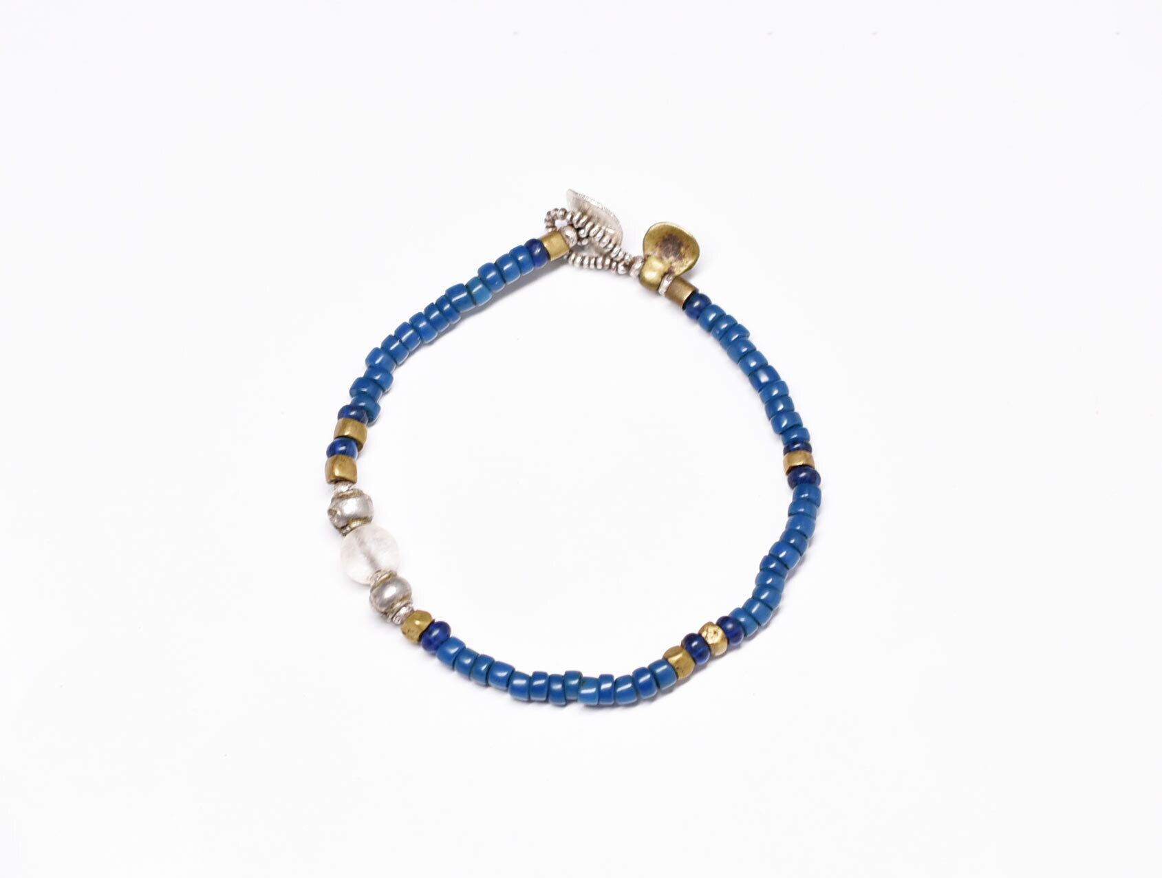 まん丸古代水晶とoldチンシルバー&オリッサブラス、アンティークサックスブルー&ブルービーズのブレス