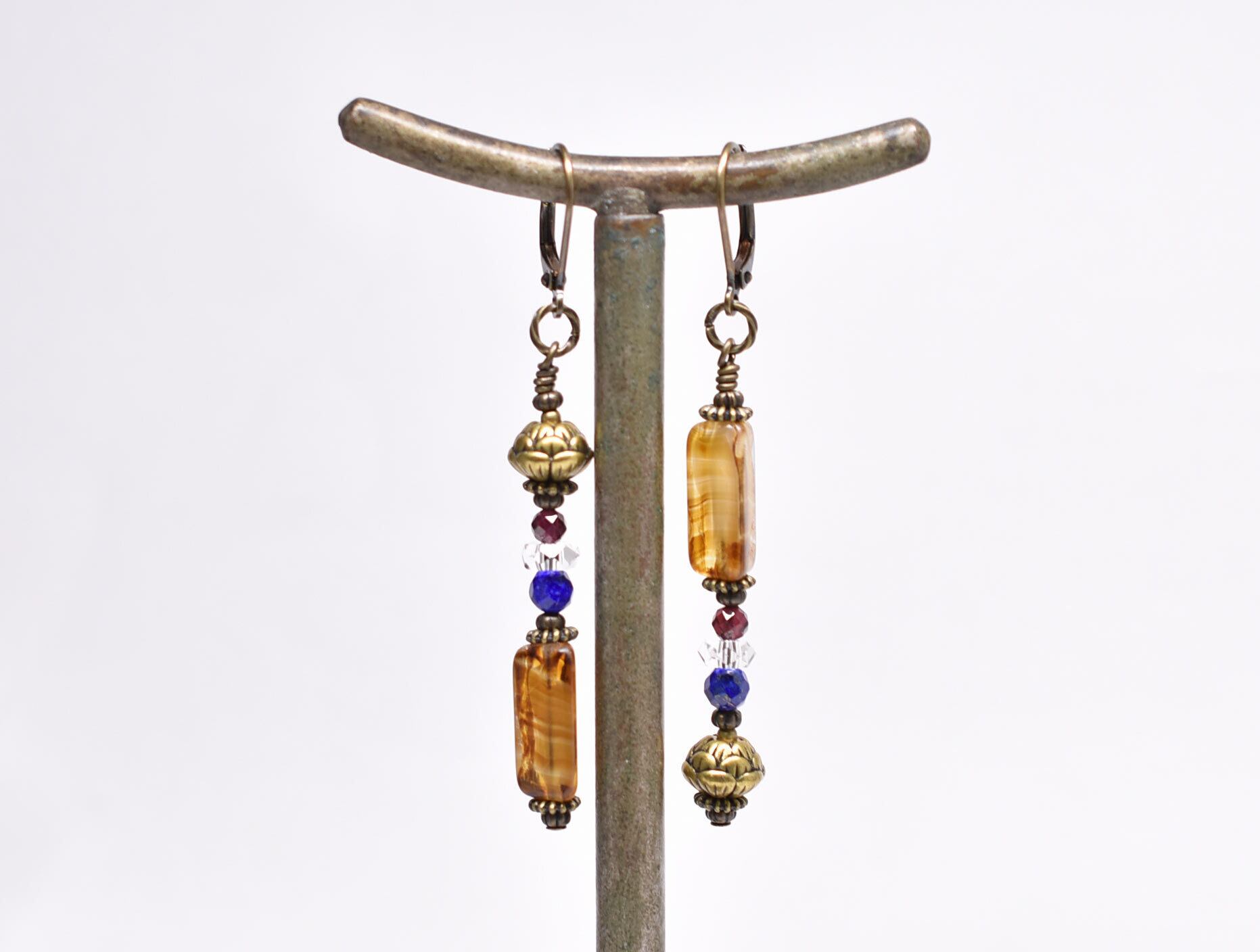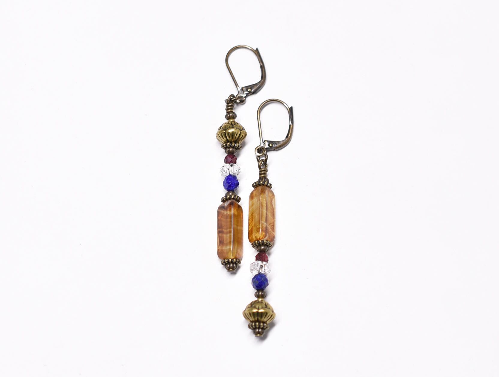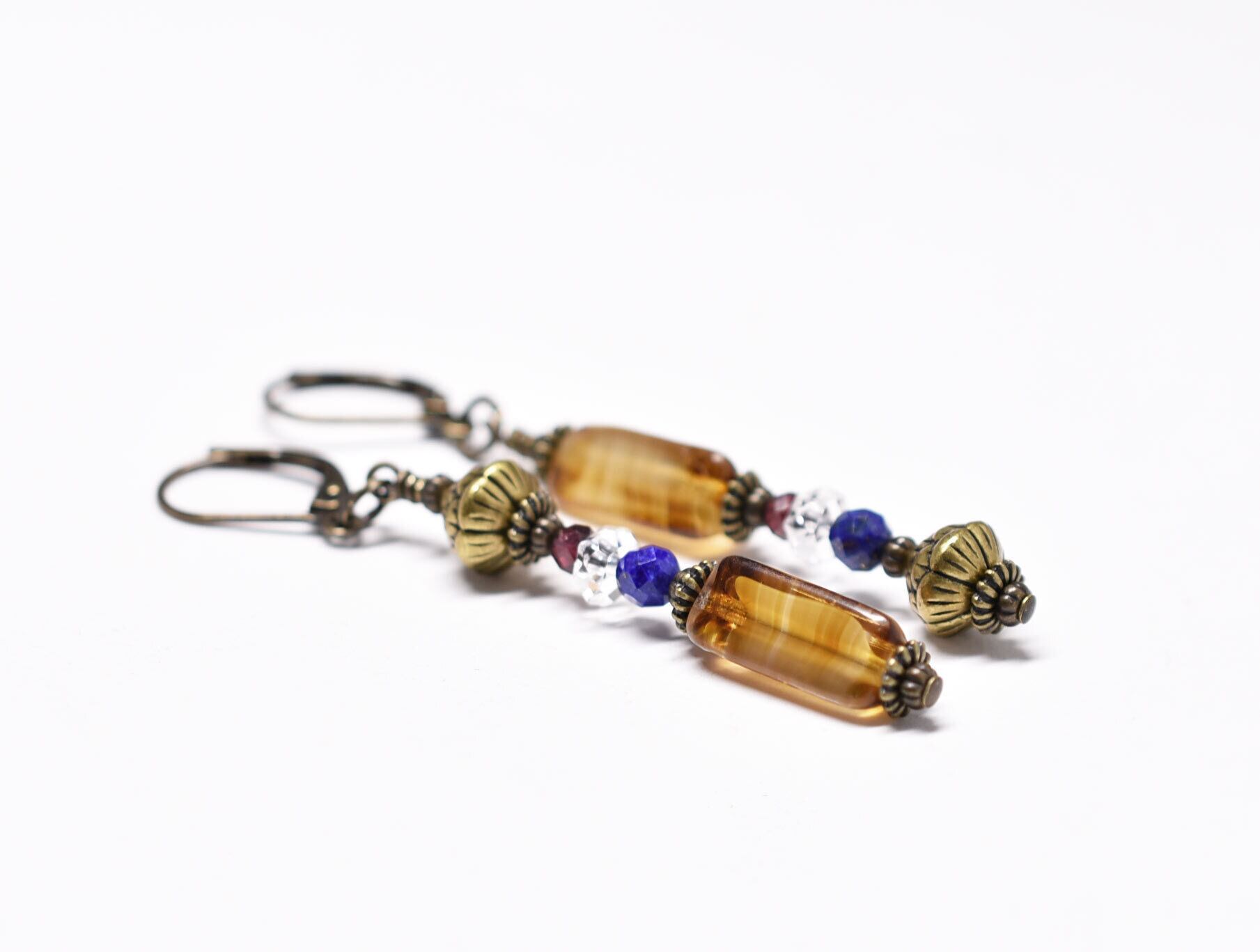 べっ甲色アンティークボヘミアビーズとラピス&ガーネット、クォーツ、蓮華ブラスのアンシメトリーピアス