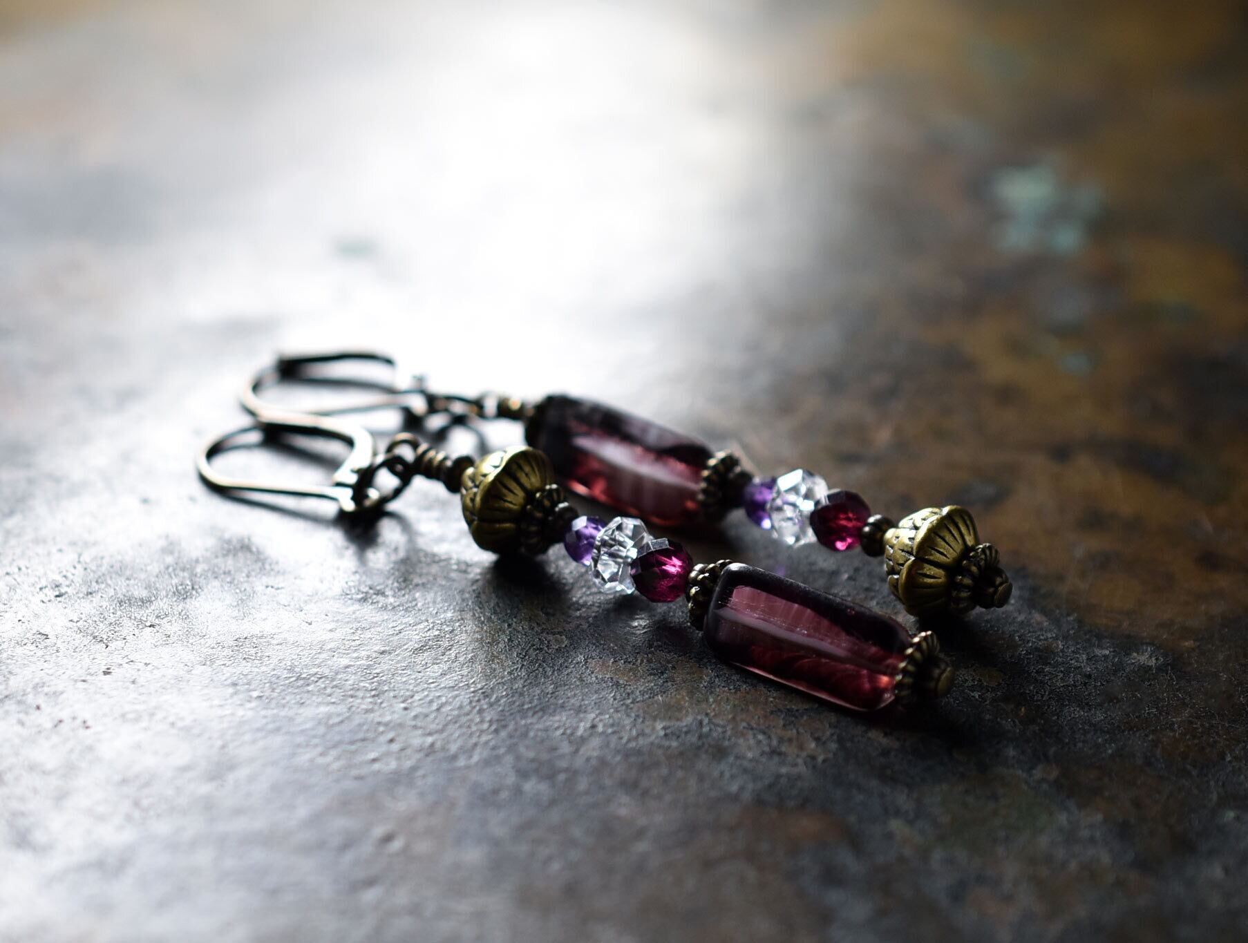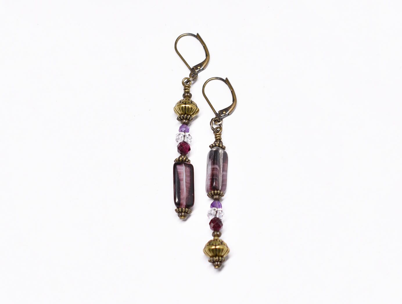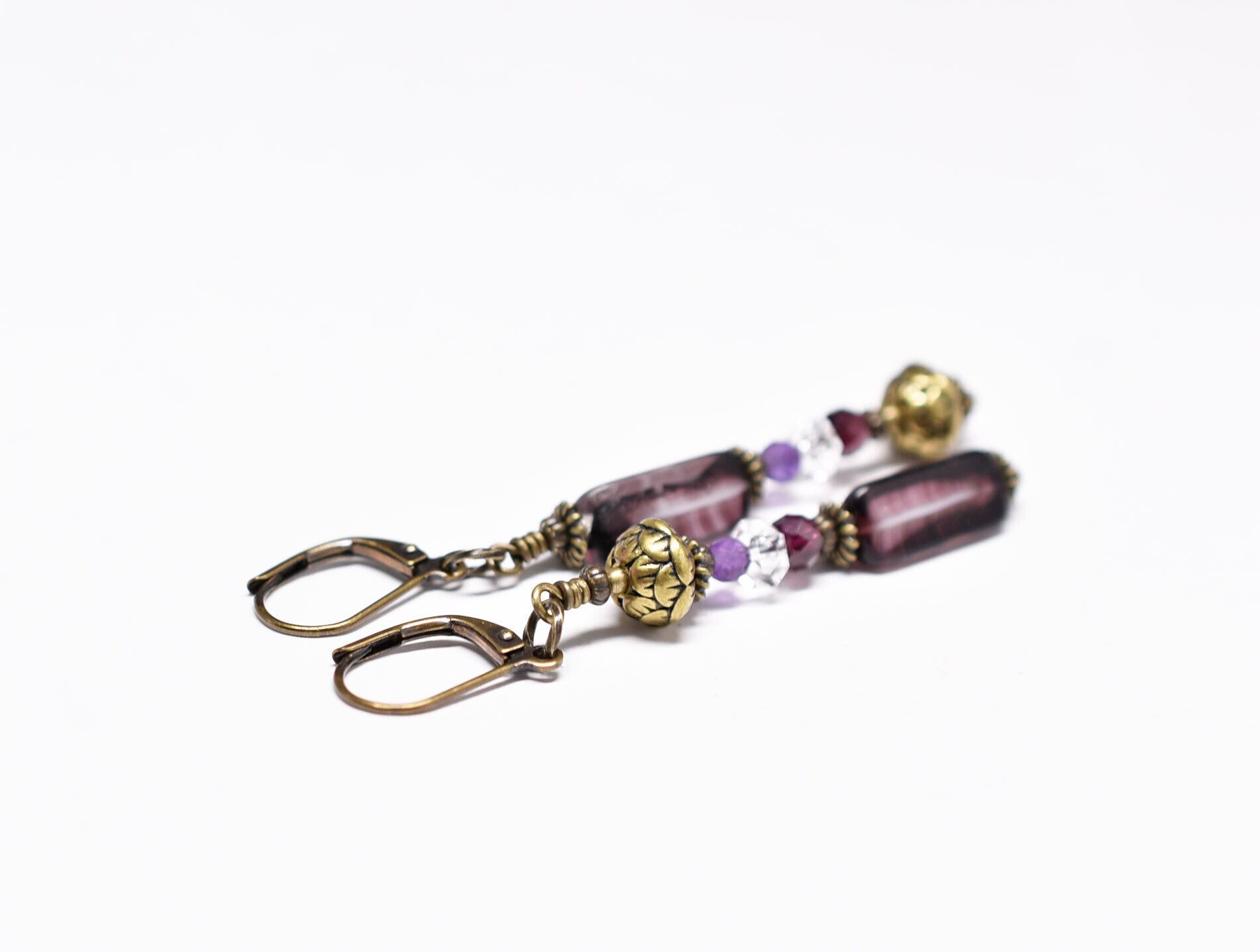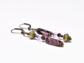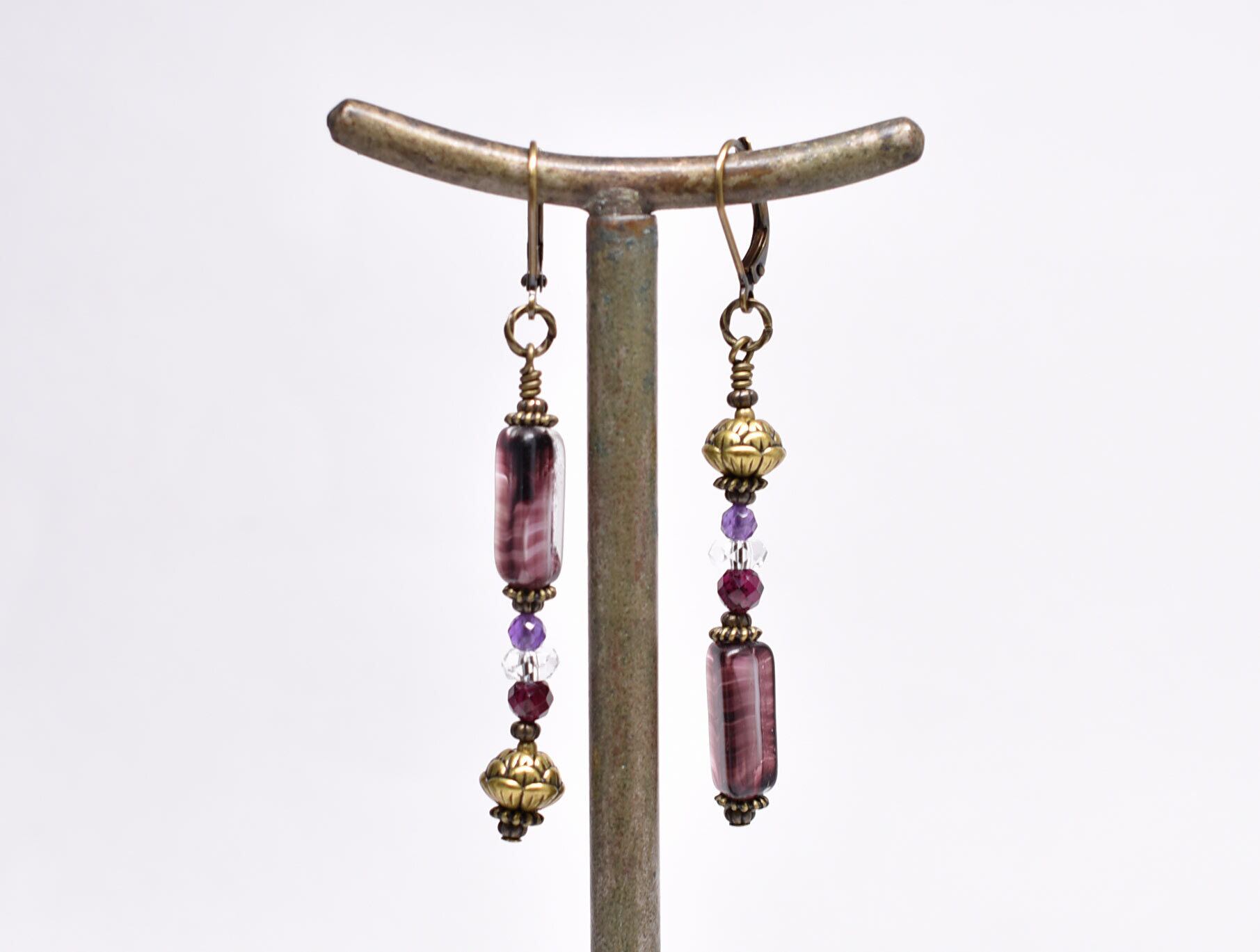 パープルアンティークボヘミアビーズとガーネット&アメジスト、クォーツ、蓮華ブラスのアンシメトリーピアス