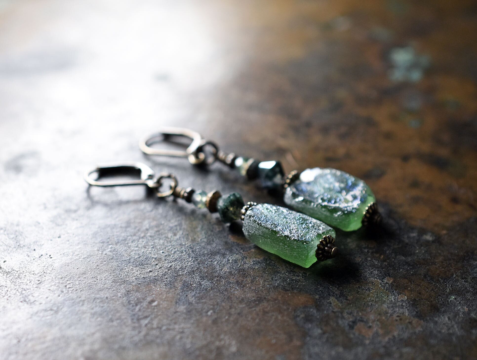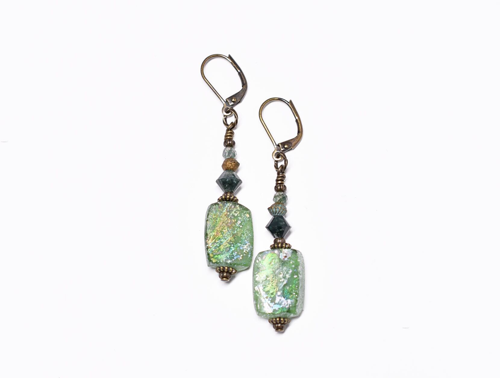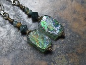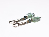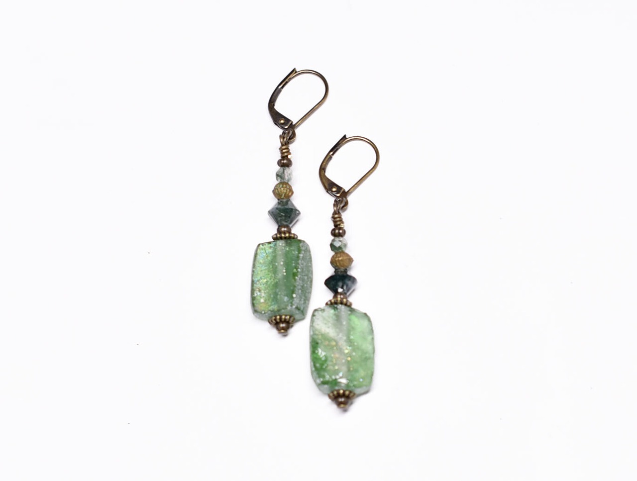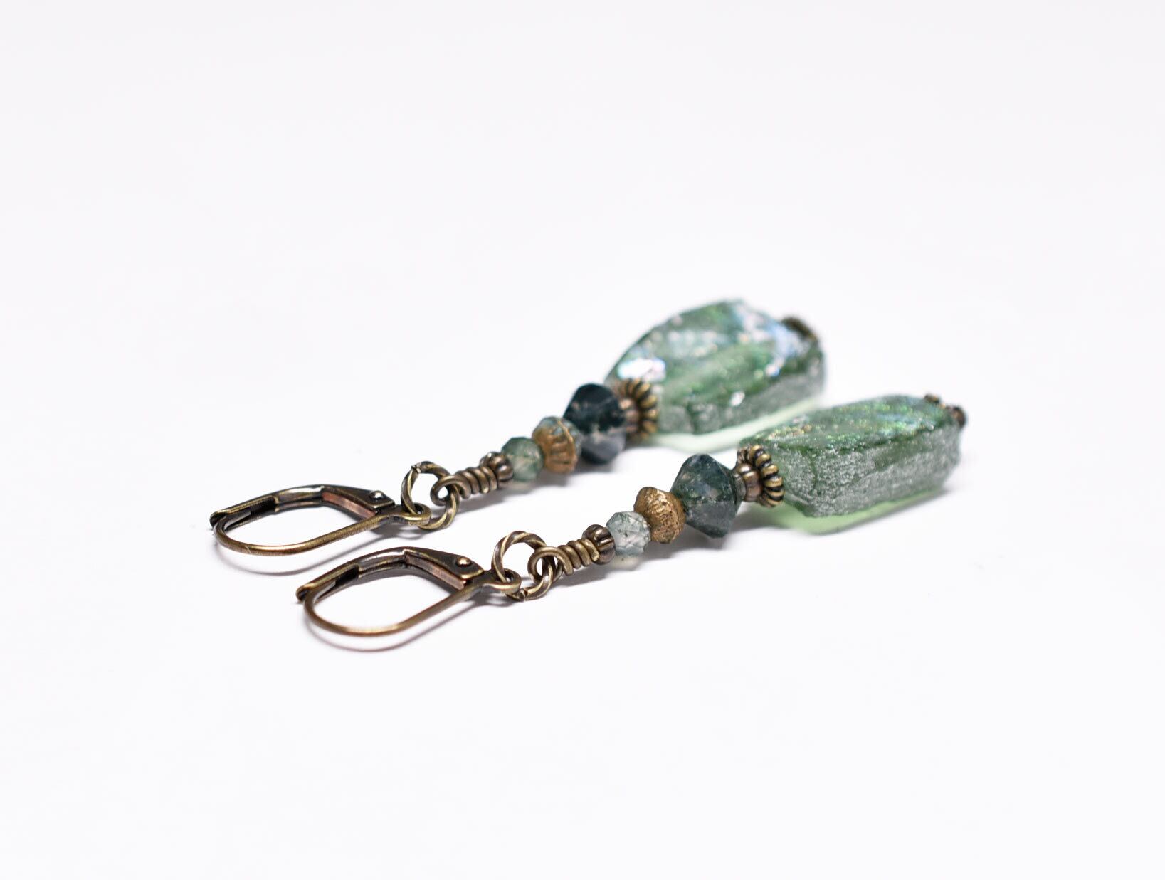 カーキ色銀化ローマングラスとヴィンテージブラス、モスアゲートのピアス