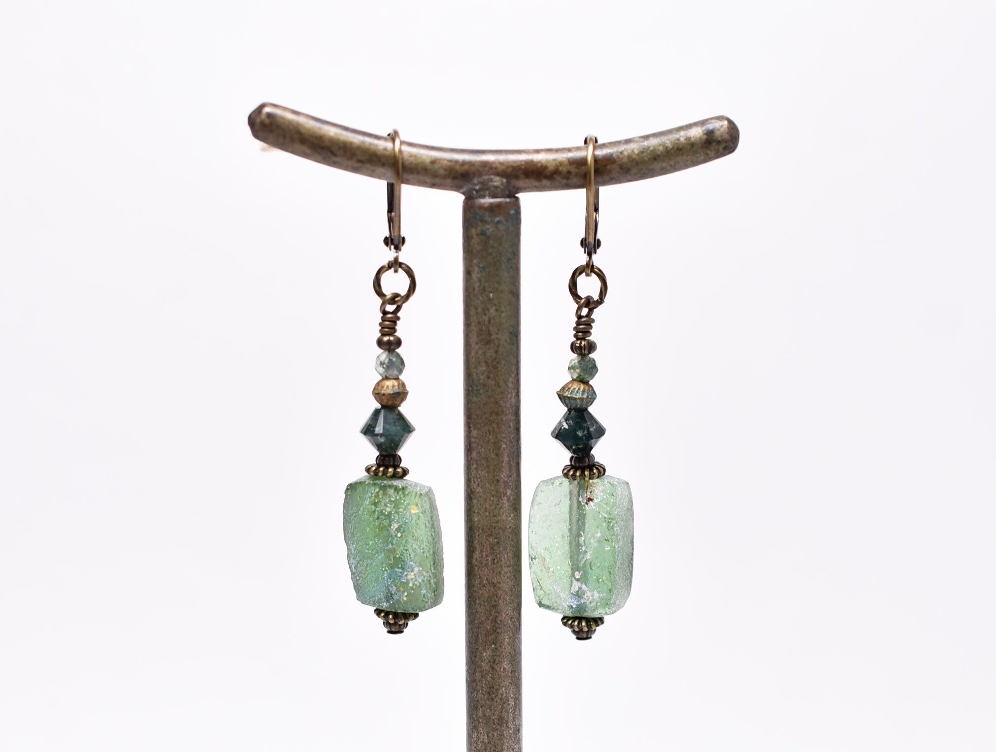 カーキ色銀化ローマングラスとヴィンテージブラス、モスアゲートを繋いだピアスです。