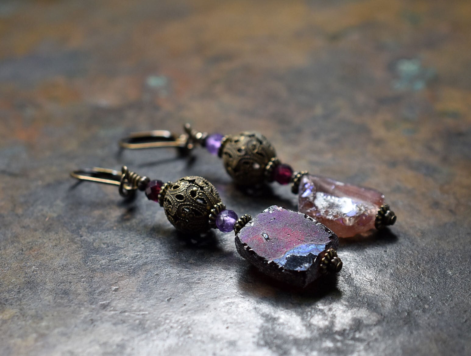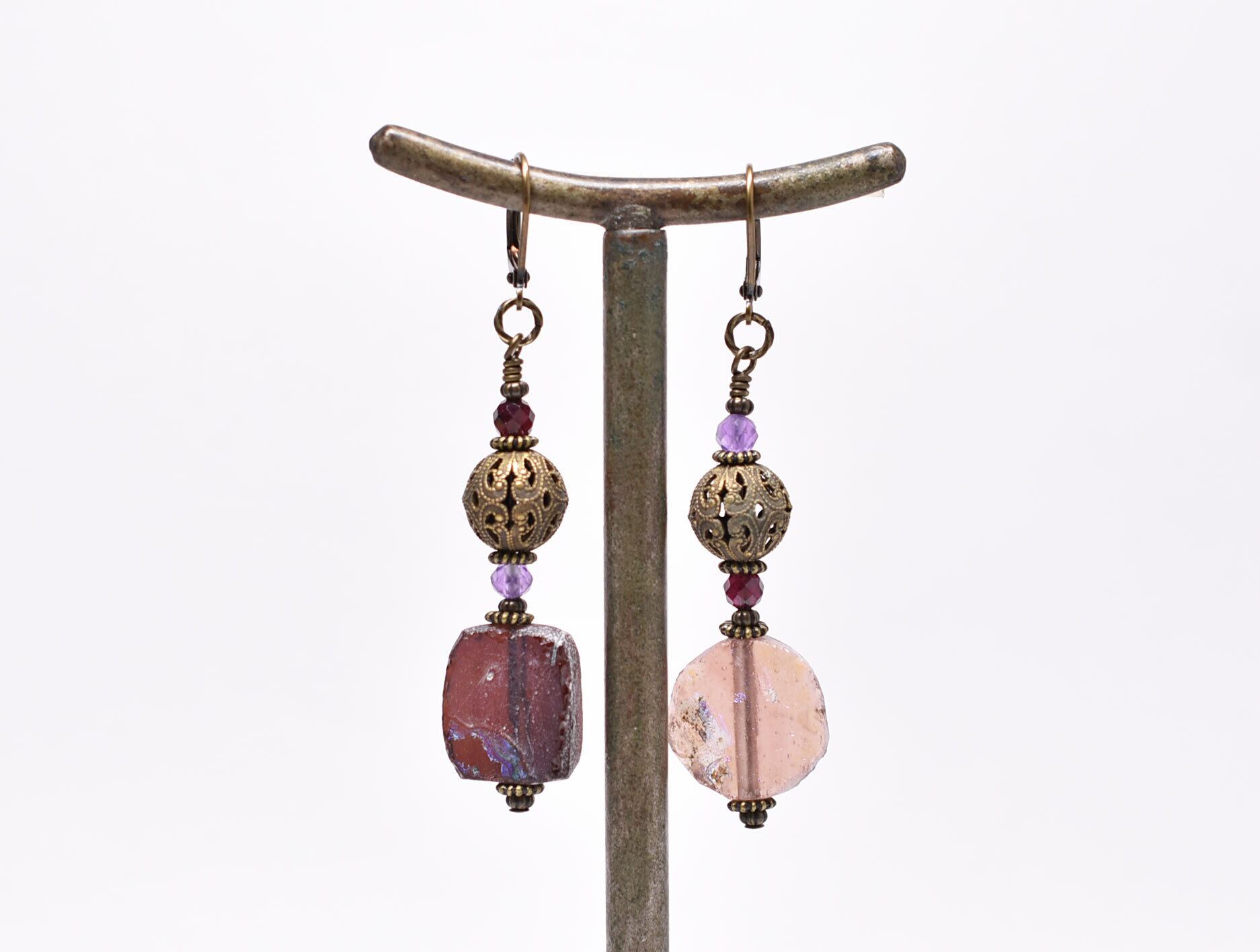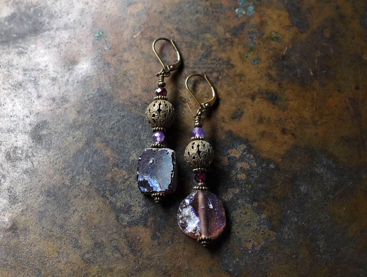 パープル色銀化ローマングラスとヴィンテージメタル、ガーネット&アメジストのピアス