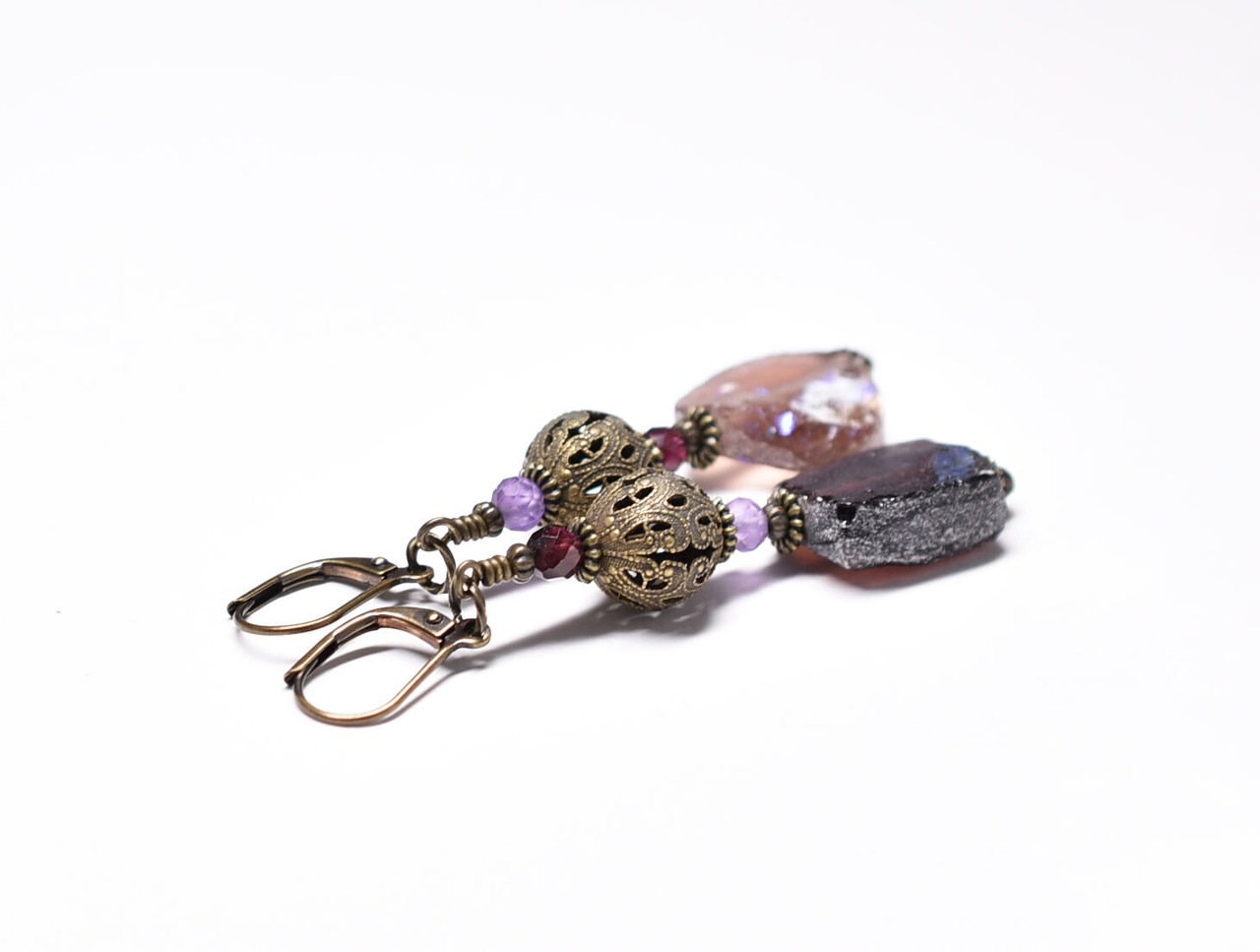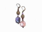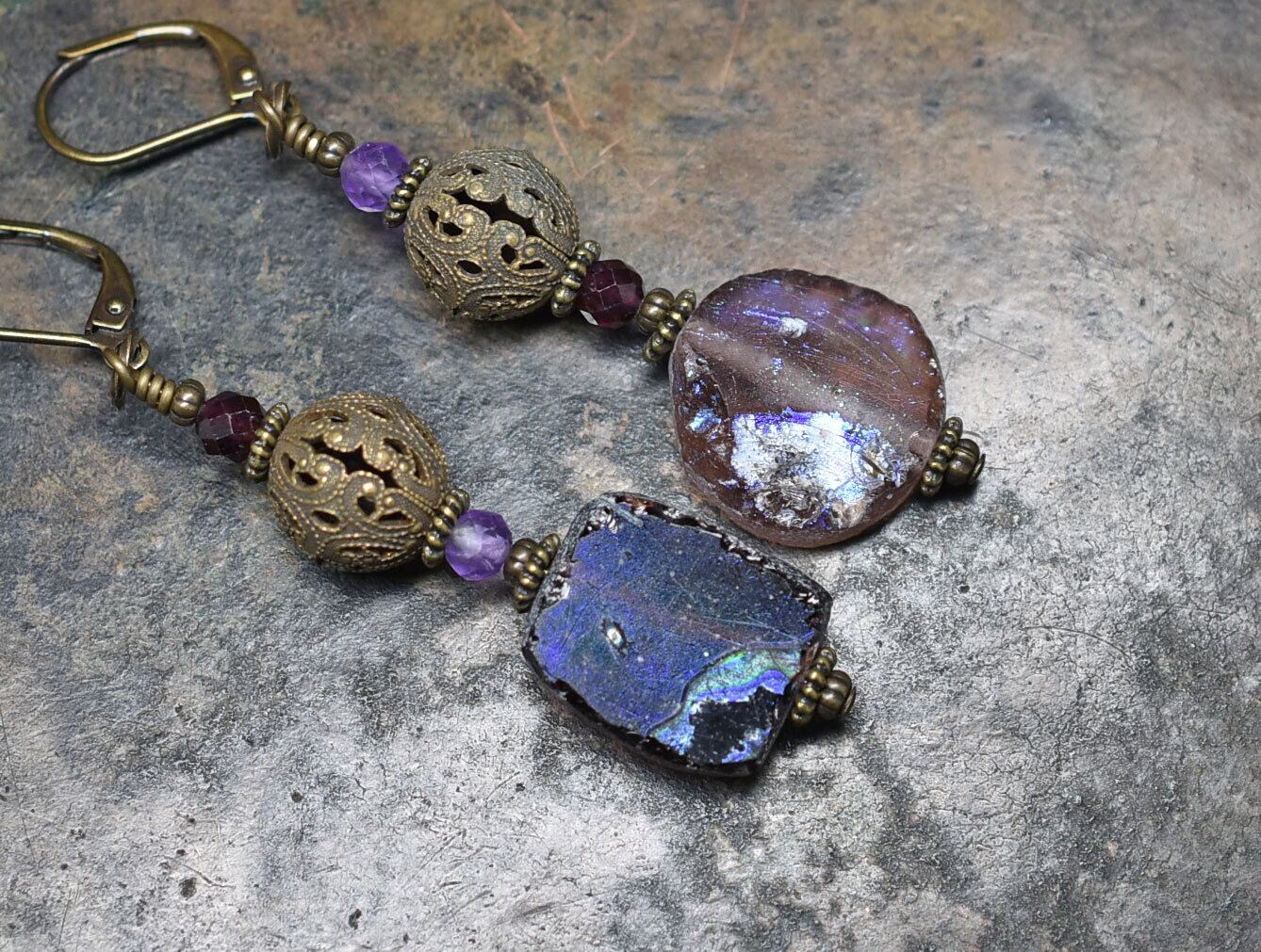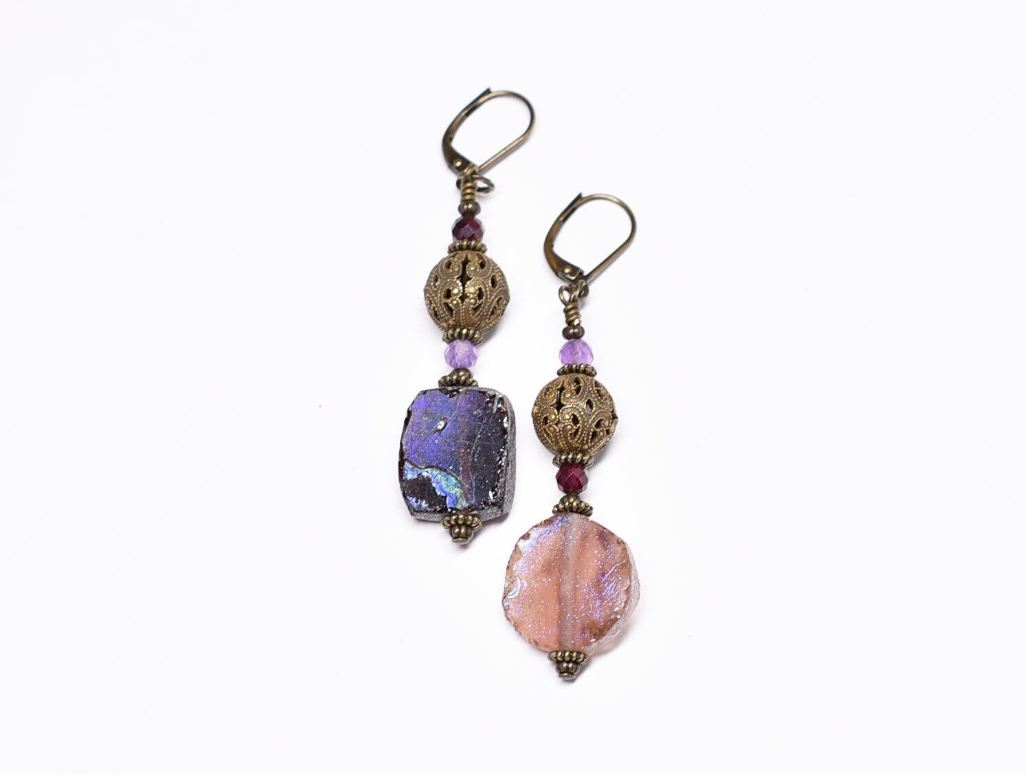 パープル色銀化ローマングラスとヴィンテージメタル、ガーネット&アメジストのピアス