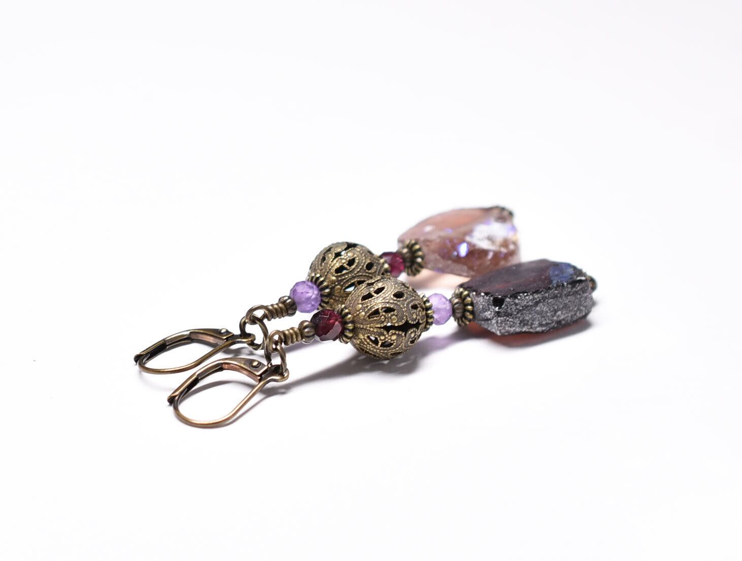パープル色銀化ローマングラスとヴィンテージメタル、ガーネット&アメジストを繋いだ少しボリュームのあるピアスです。