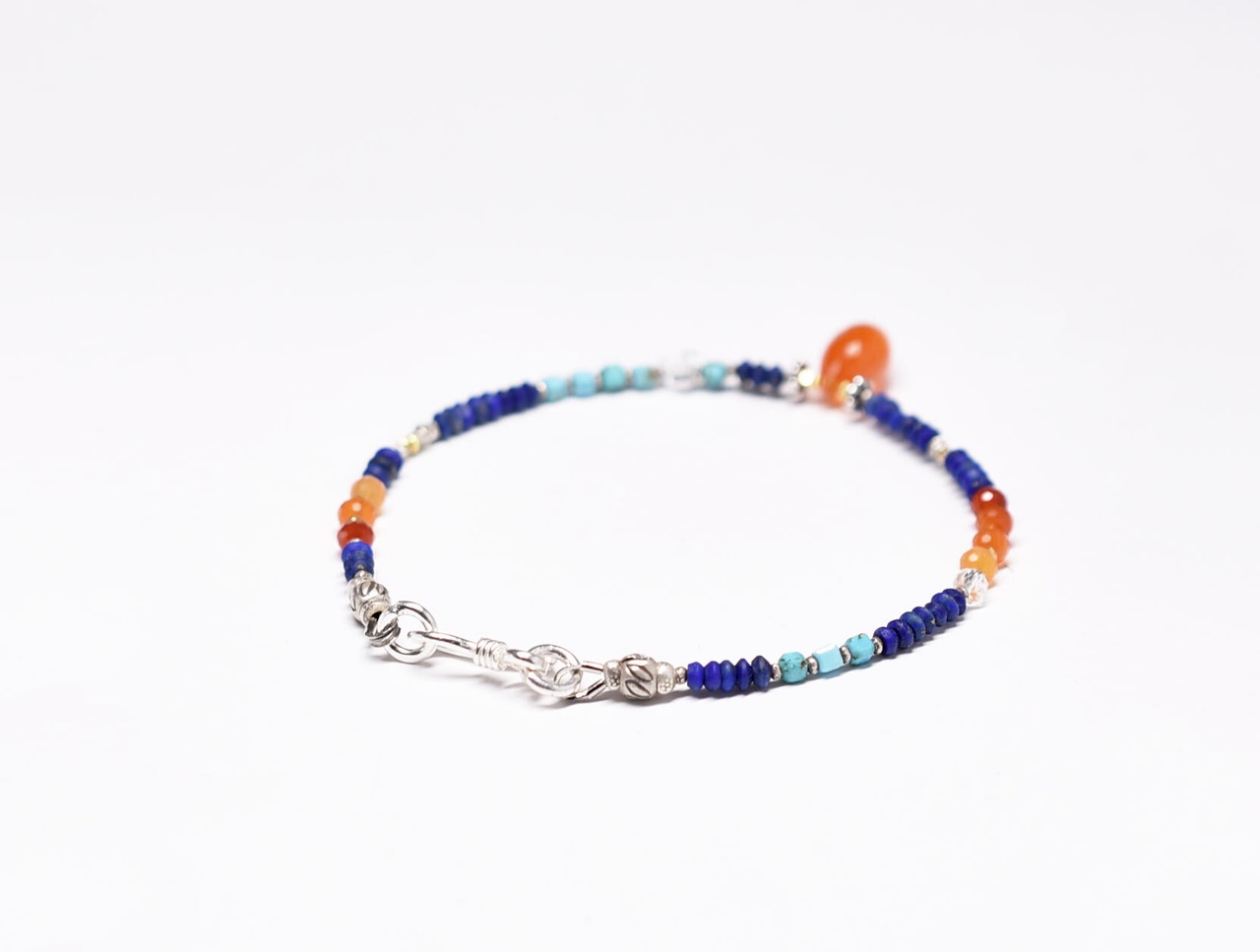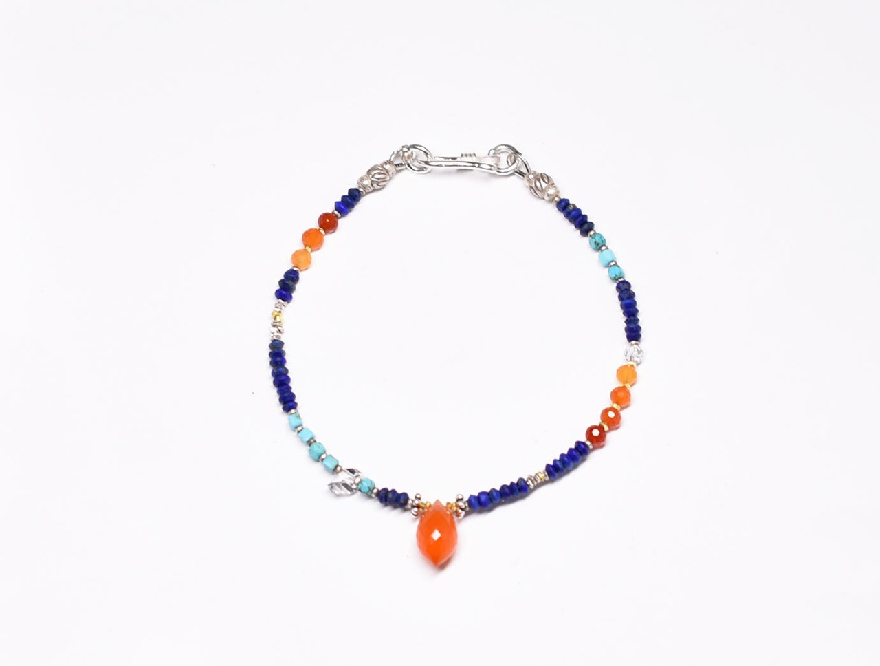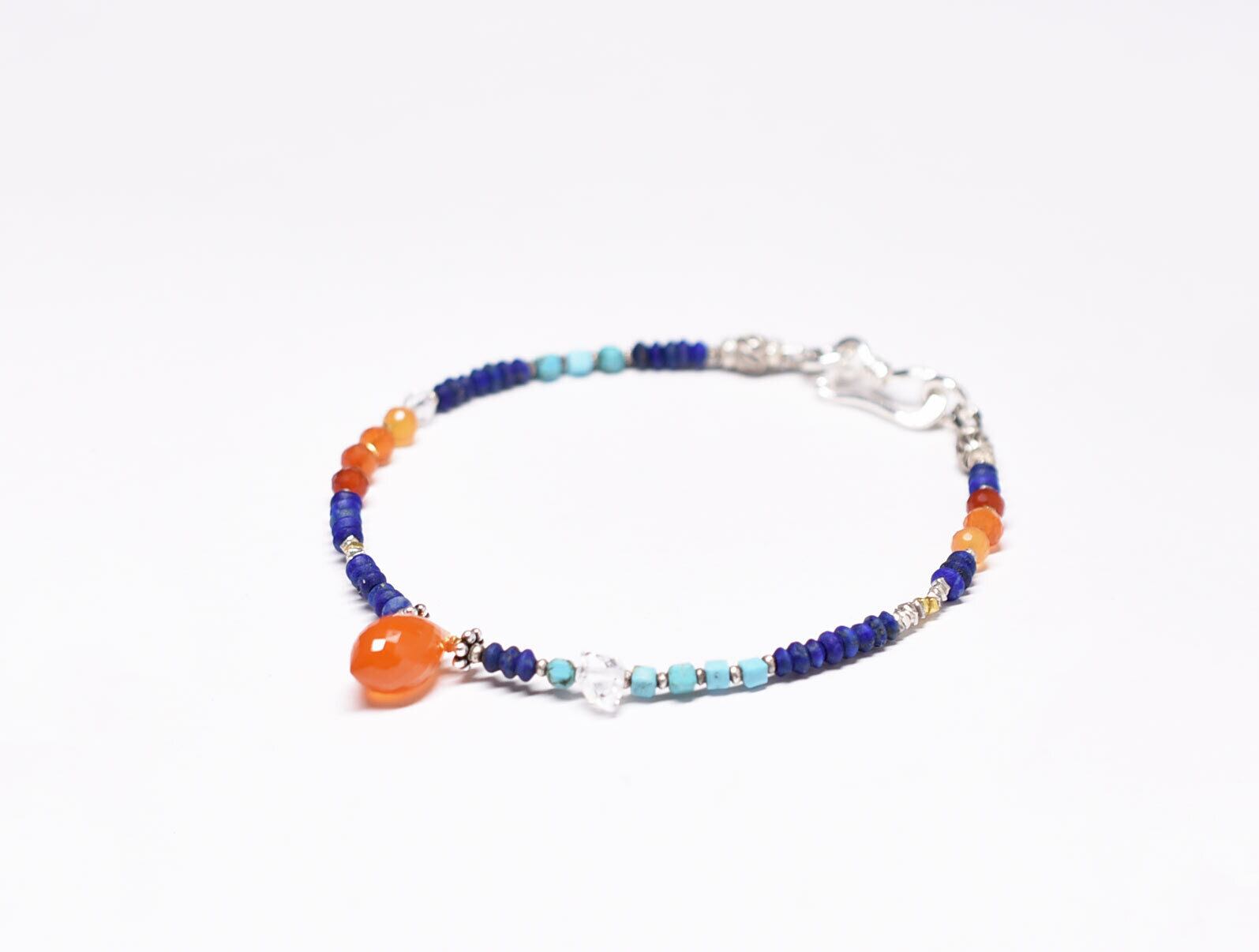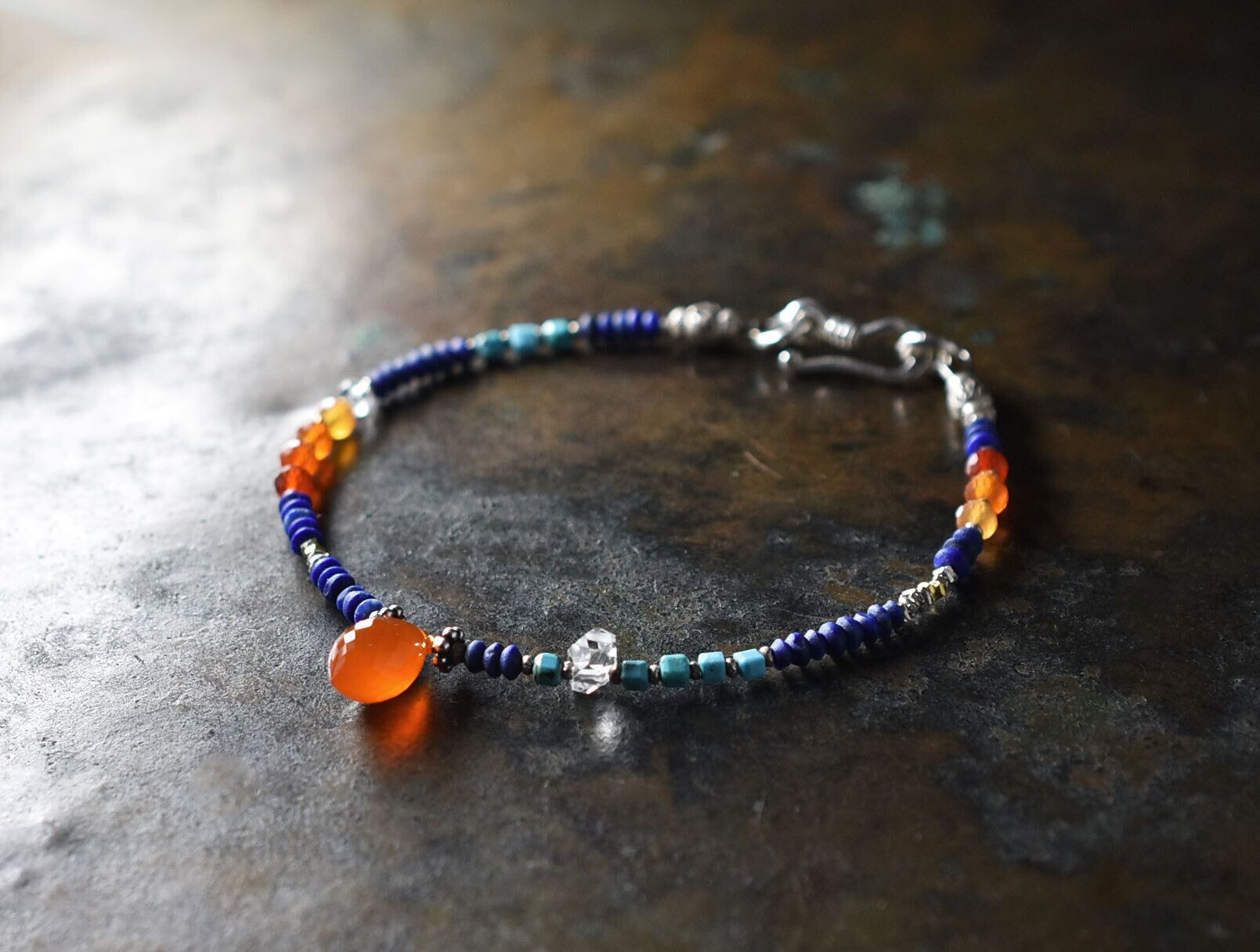 カーネリアンとキングマンターコイズ、ハーキマーダイヤモンド、小さなラピス、カレンシルバーを繋いだ華奢なブレスです。