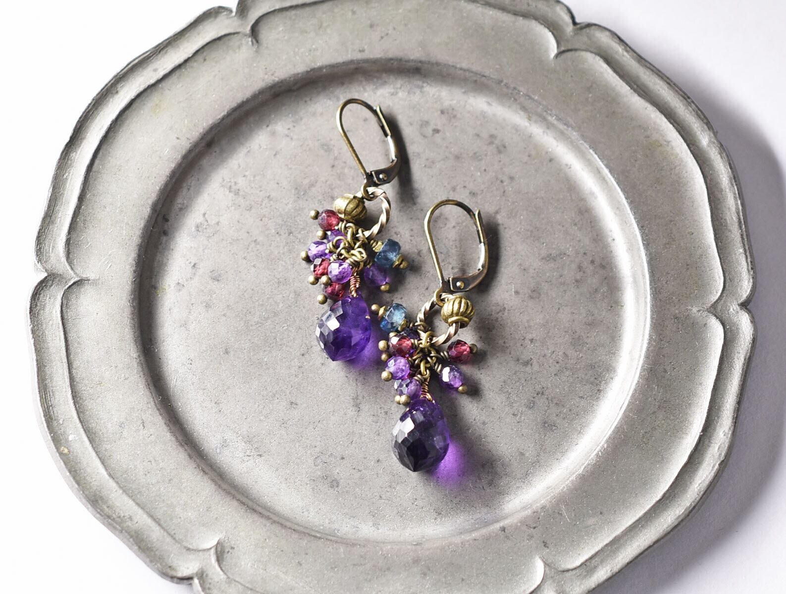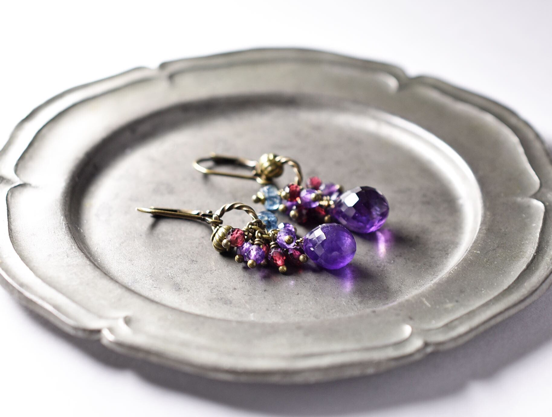 雫アメジストと小さなガーネット&アメジスト、モスカイヤナイトのピアス