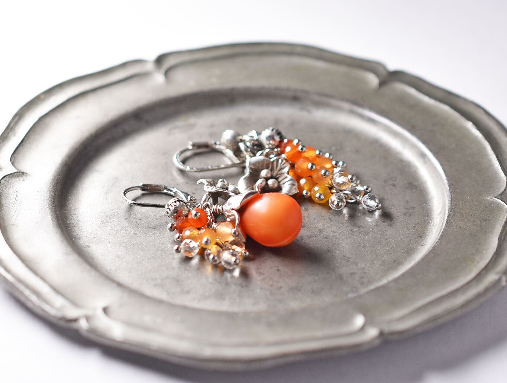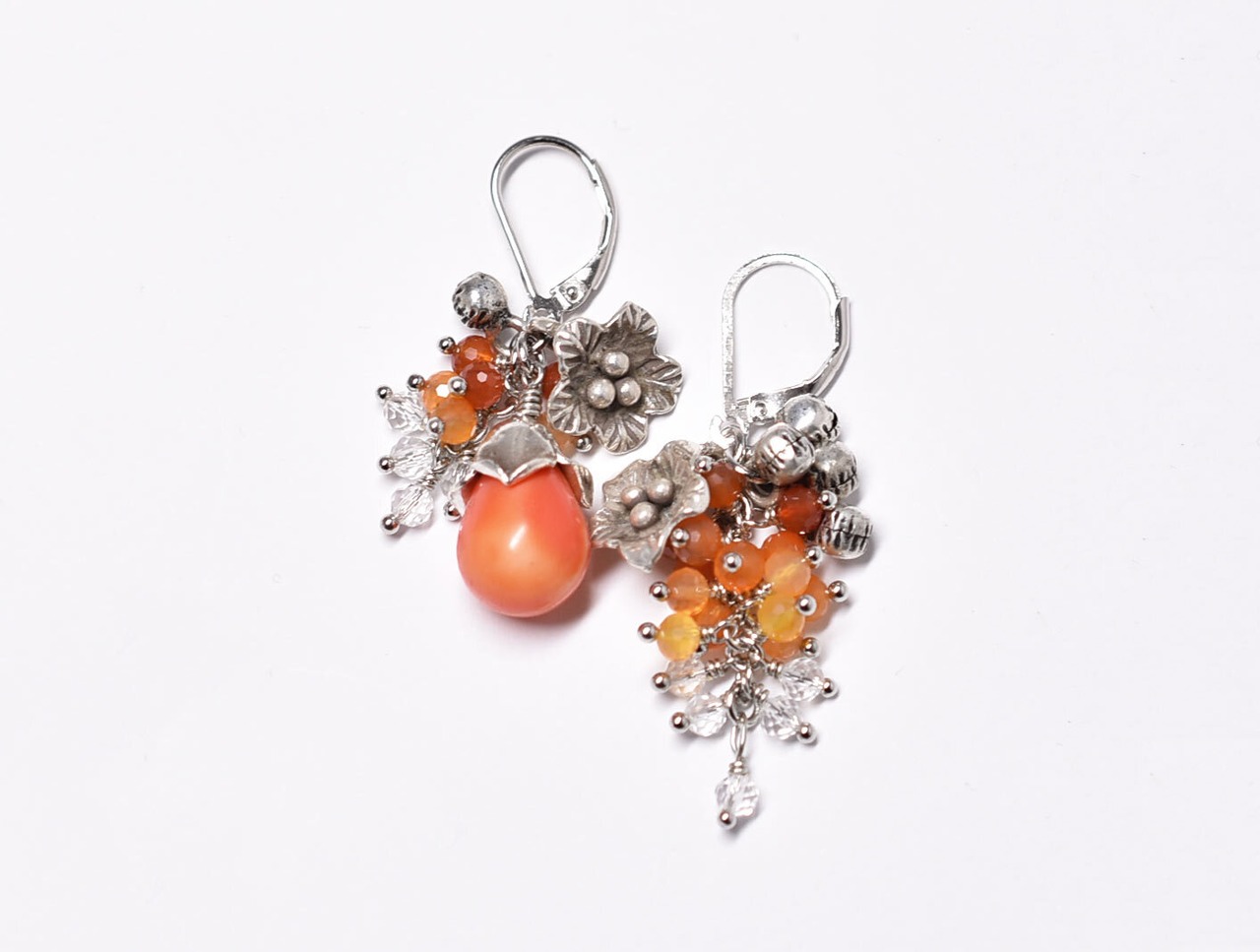 ウエディングビーとたわわなカーネリアン&クォーツ、お花カレンシルバーと小さな鈴のアンシメトリーピアス