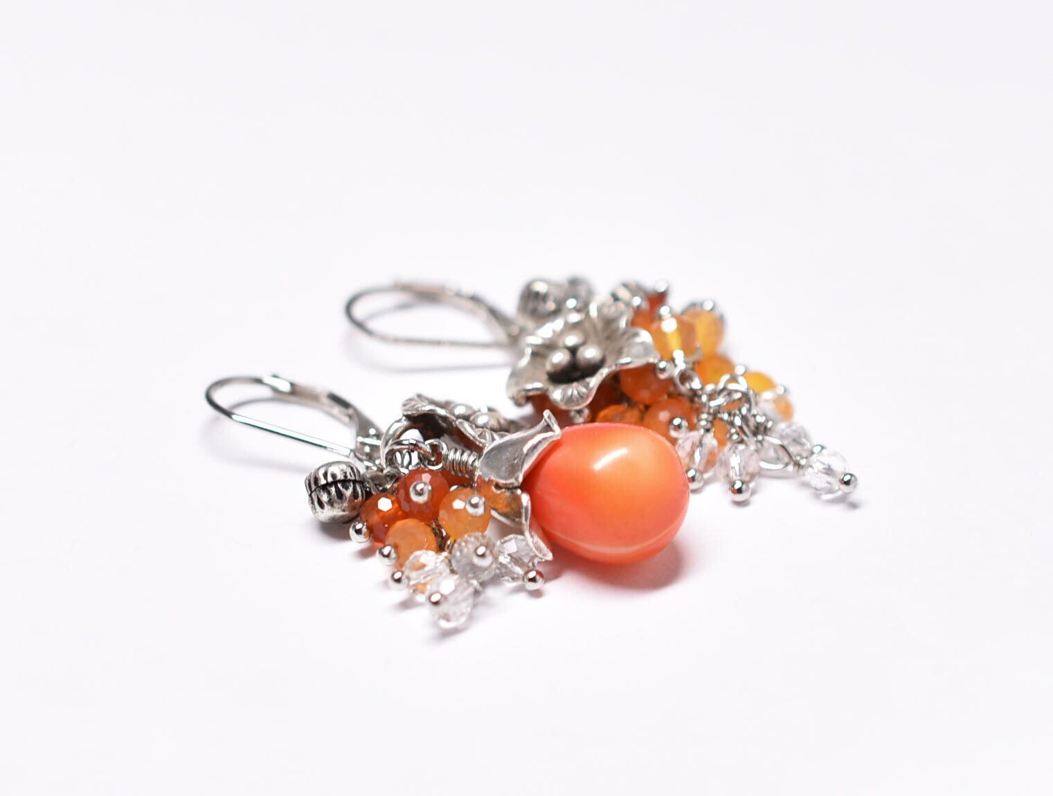 ウエディングビーズとたわわなカーネリアンとクォーツ、お花のカレンシルバー小さな鈴を繋いだピアスです。
