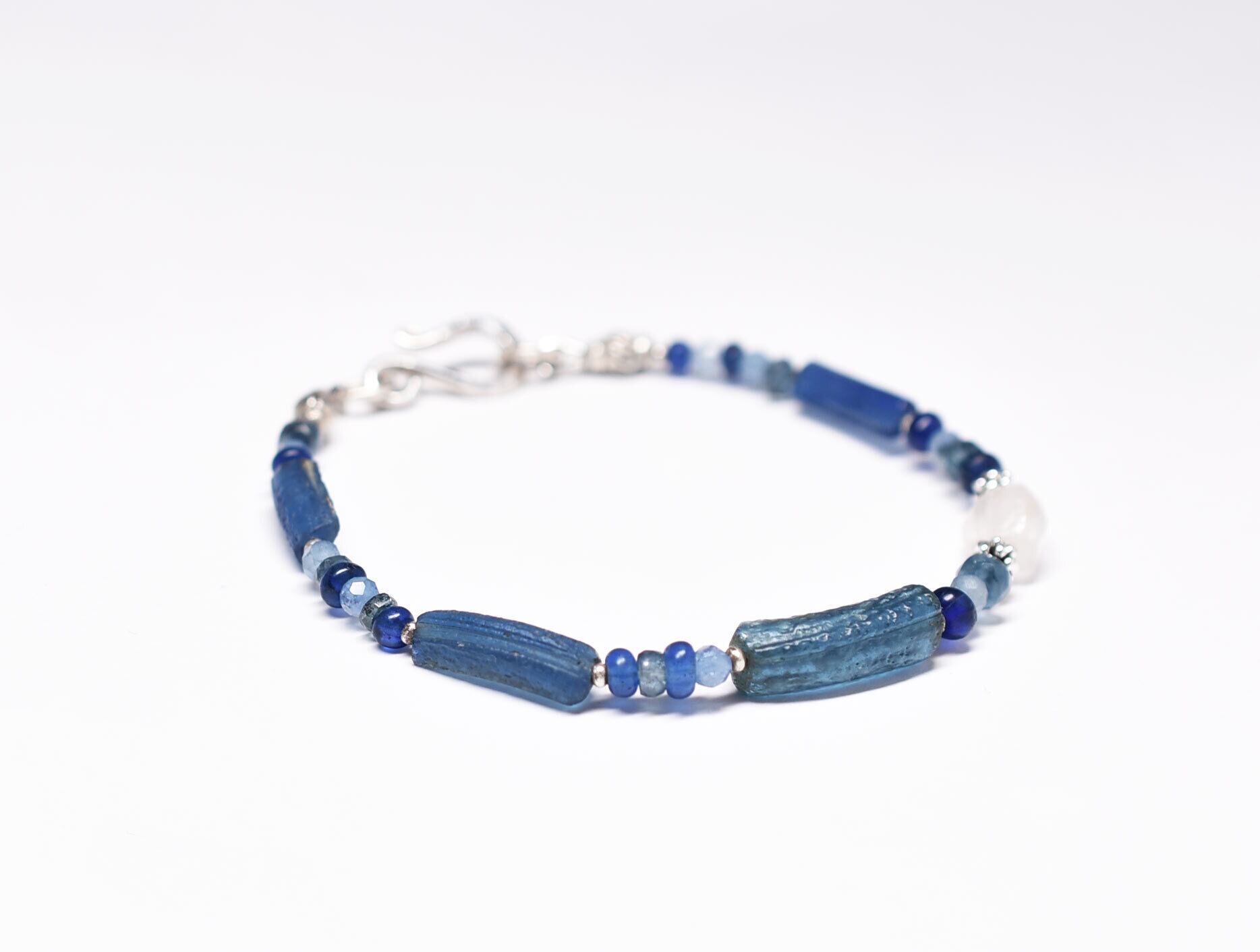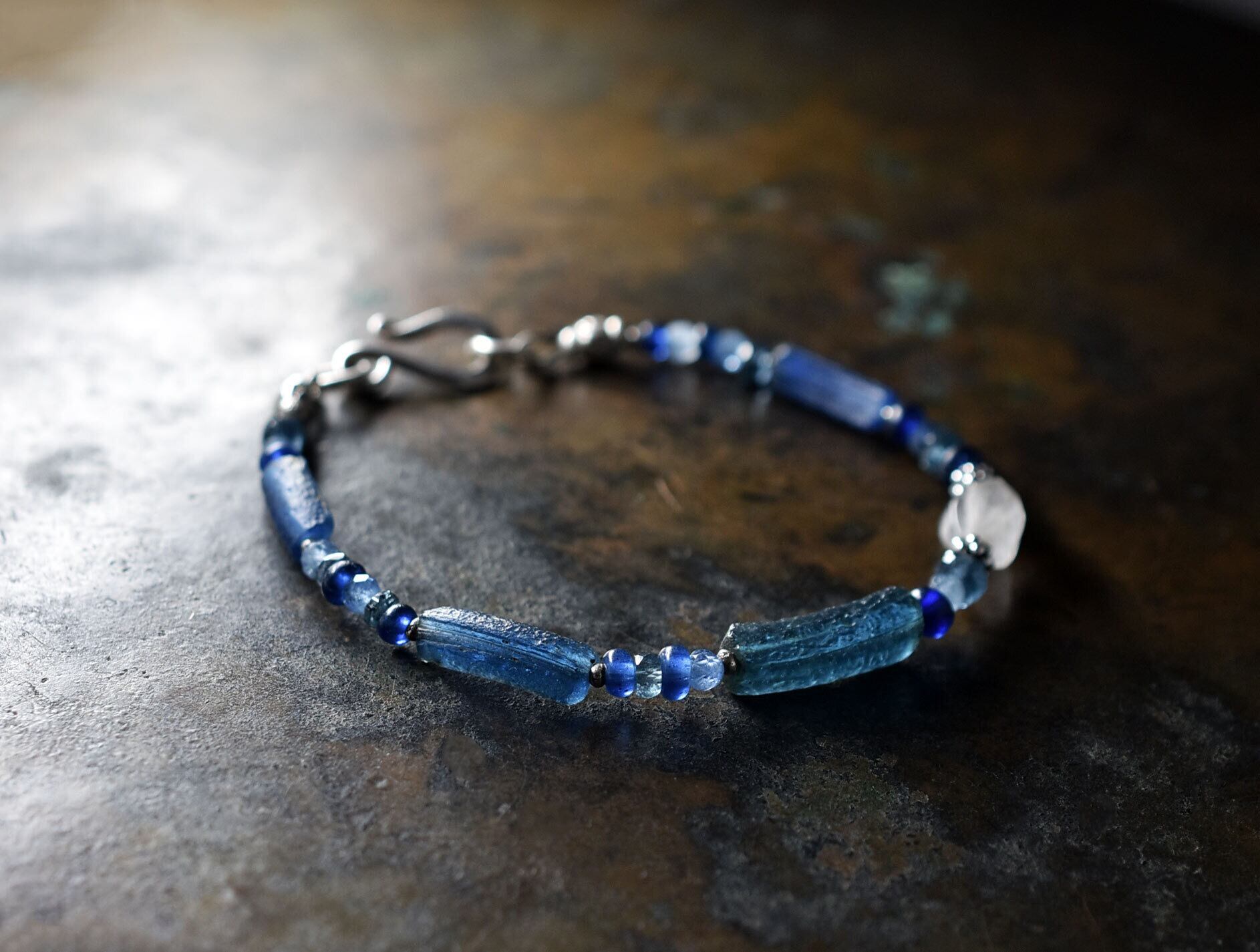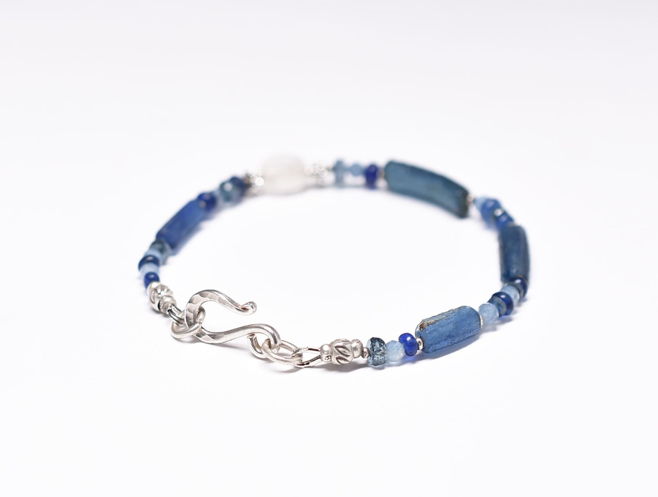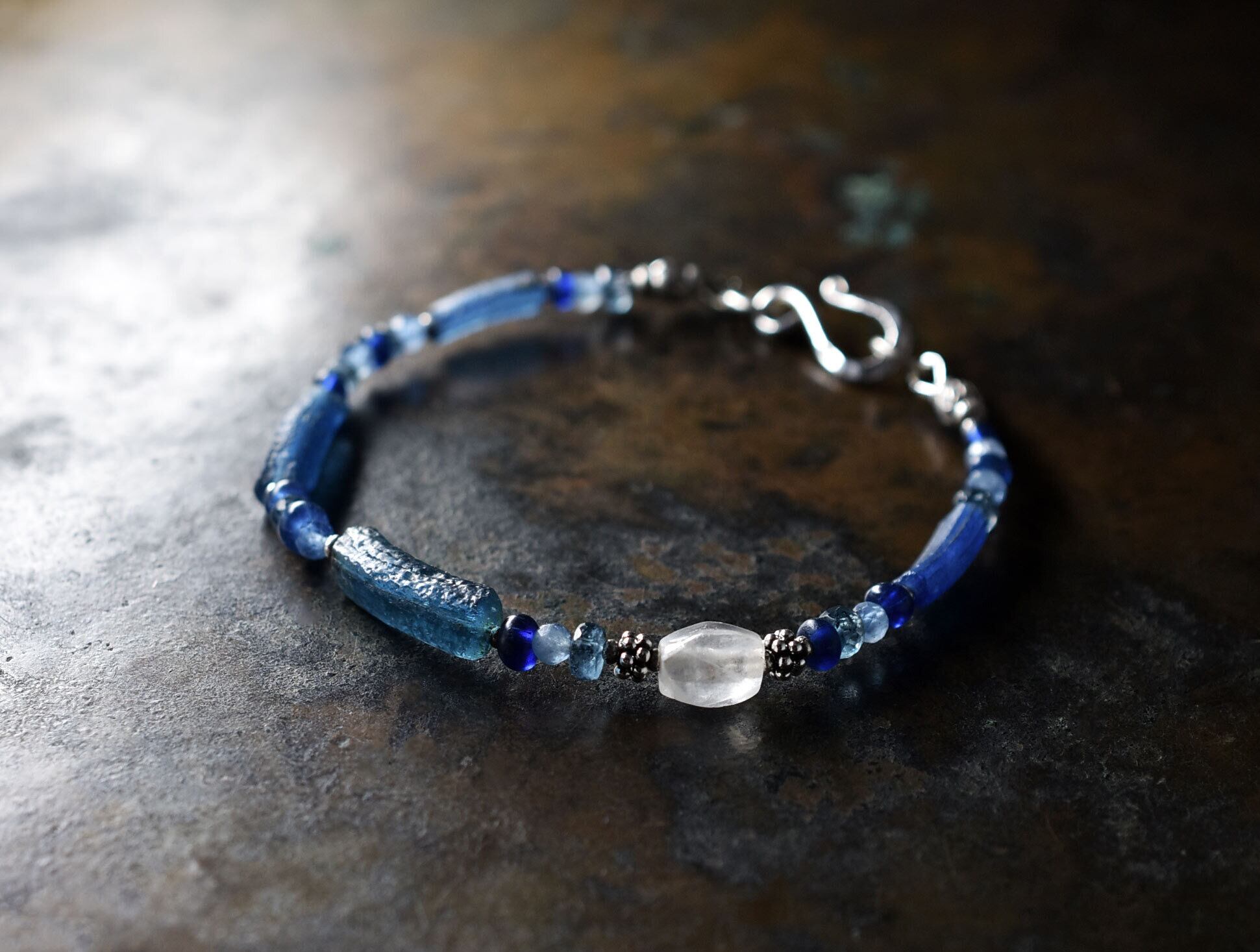 古代ガラスや天然石のブルー、味わいのある古代水晶を楽しめるブレスです。