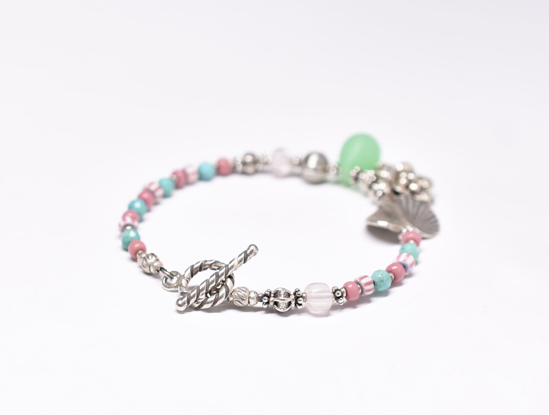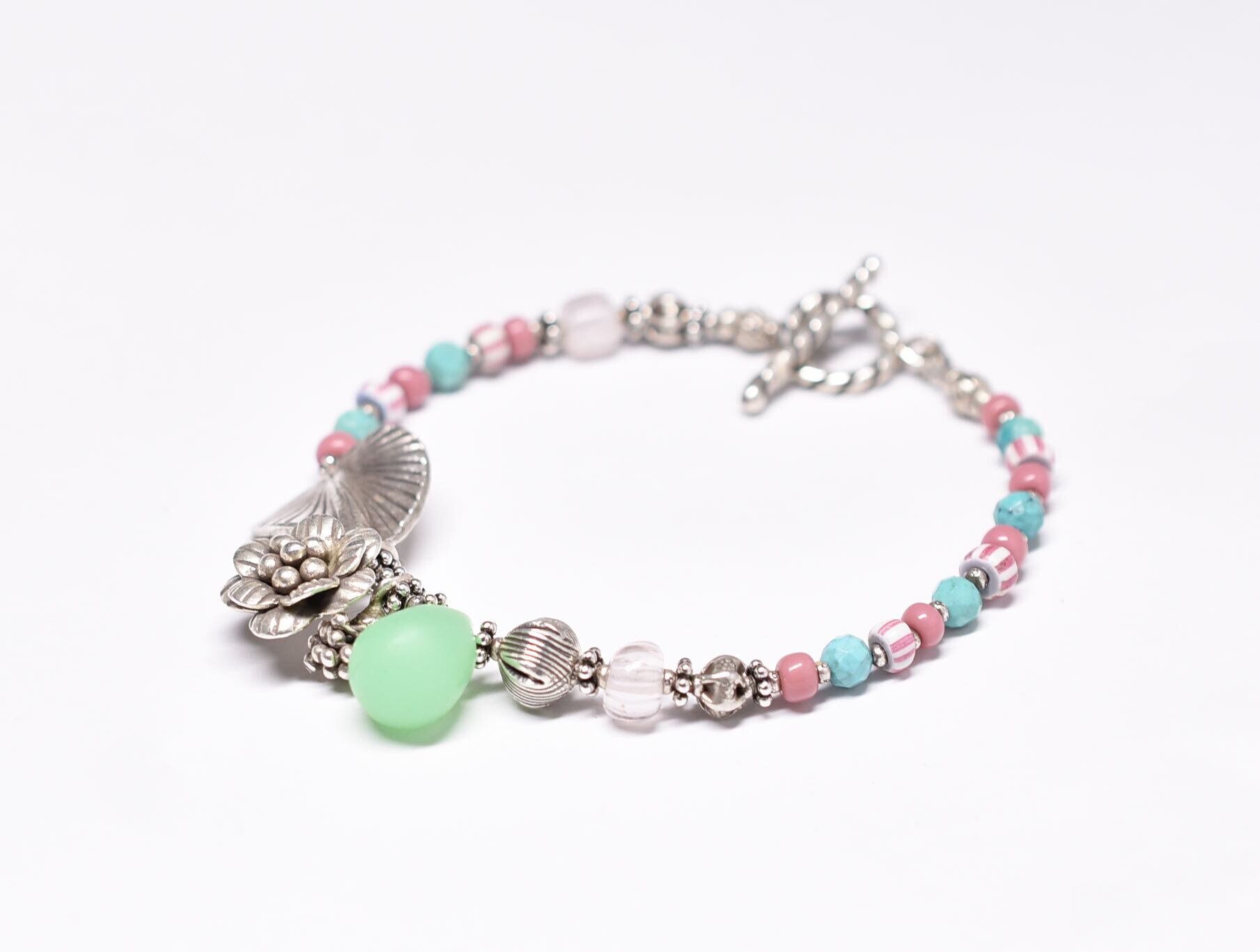 ウランガラスウエディングビーズとボタニカルカレンシルバー、ヴェネチアアンティークビーズ、ターコイズのブレス