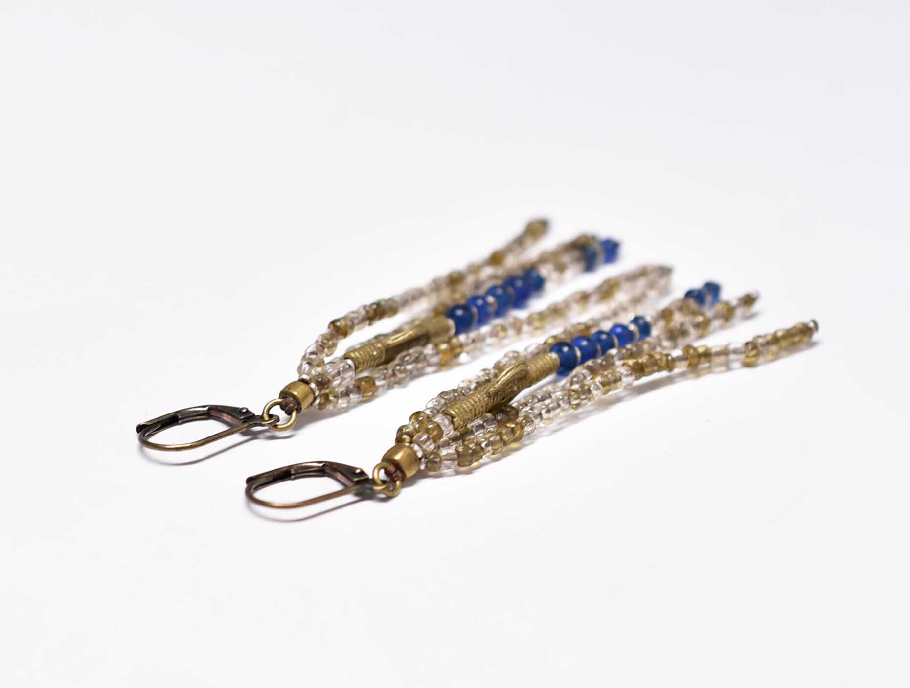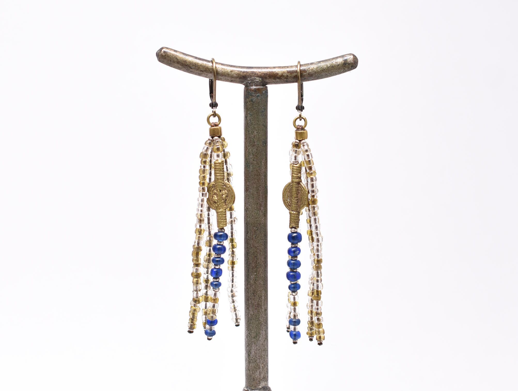 アフリカンブラスとクリア&琥珀色シードビーズ、ブルーアンティークビーズの4連ピアス