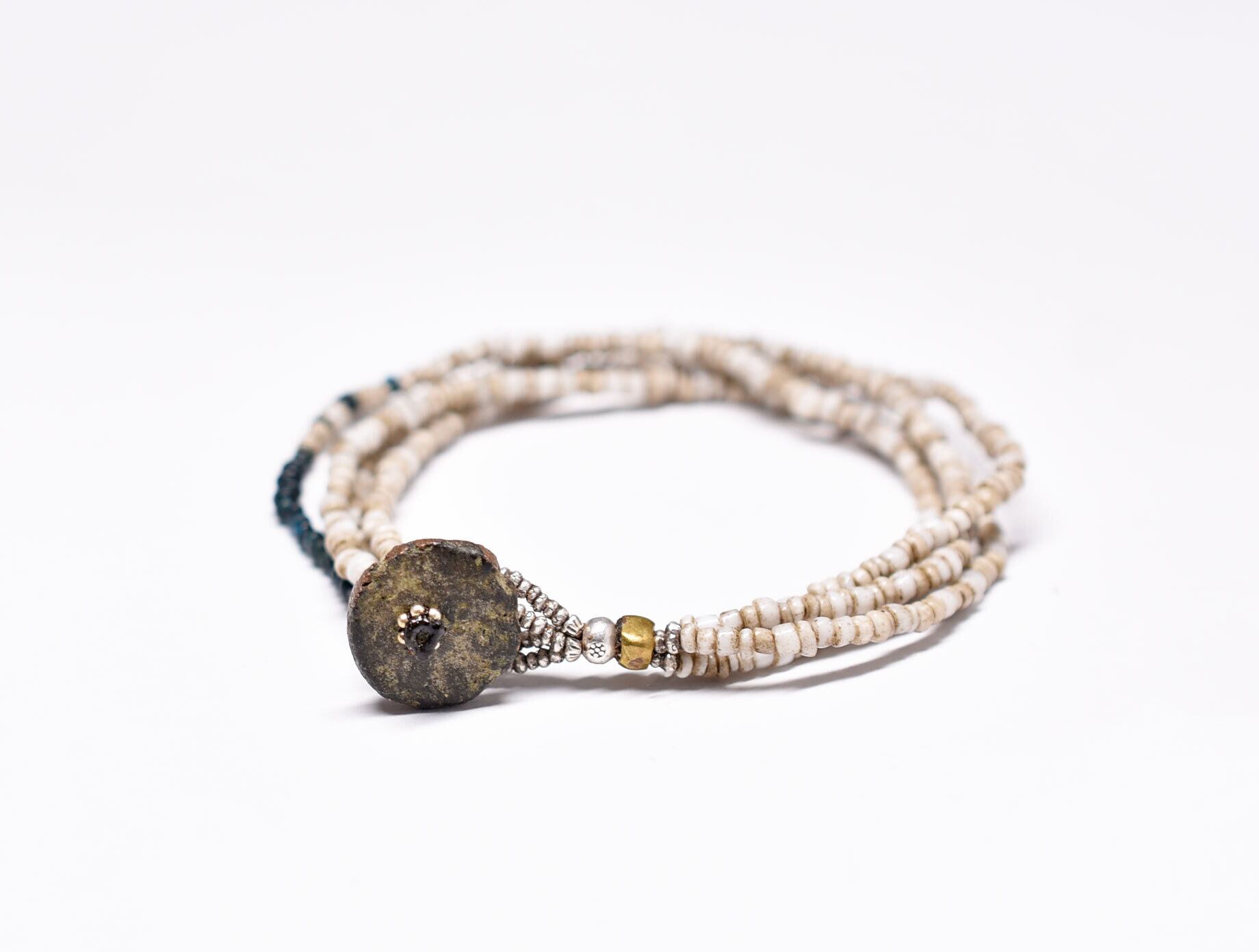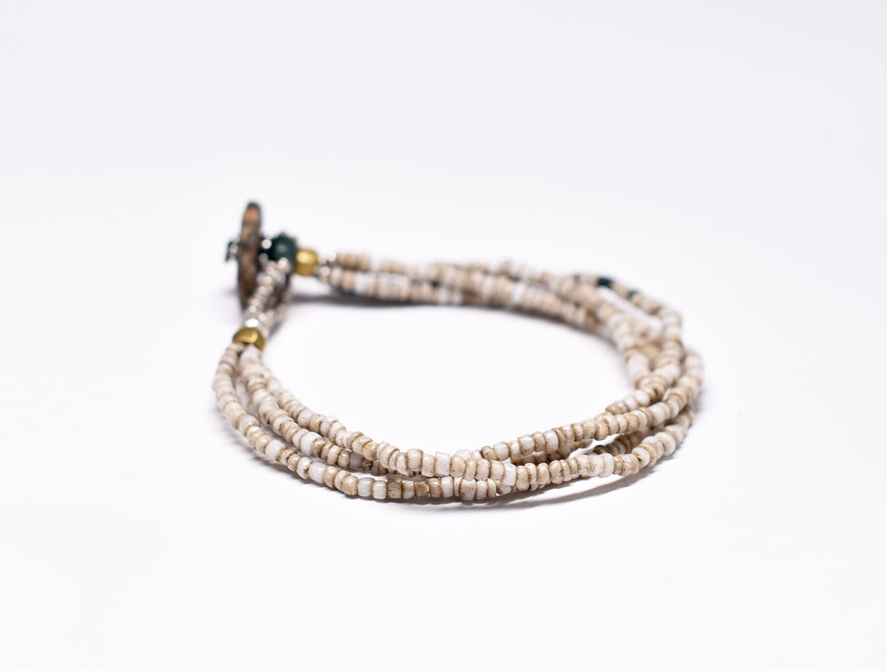 アンティークホワイトシードビーズとインディゴブルービーズの4連ブレス(oldコイン留め金)