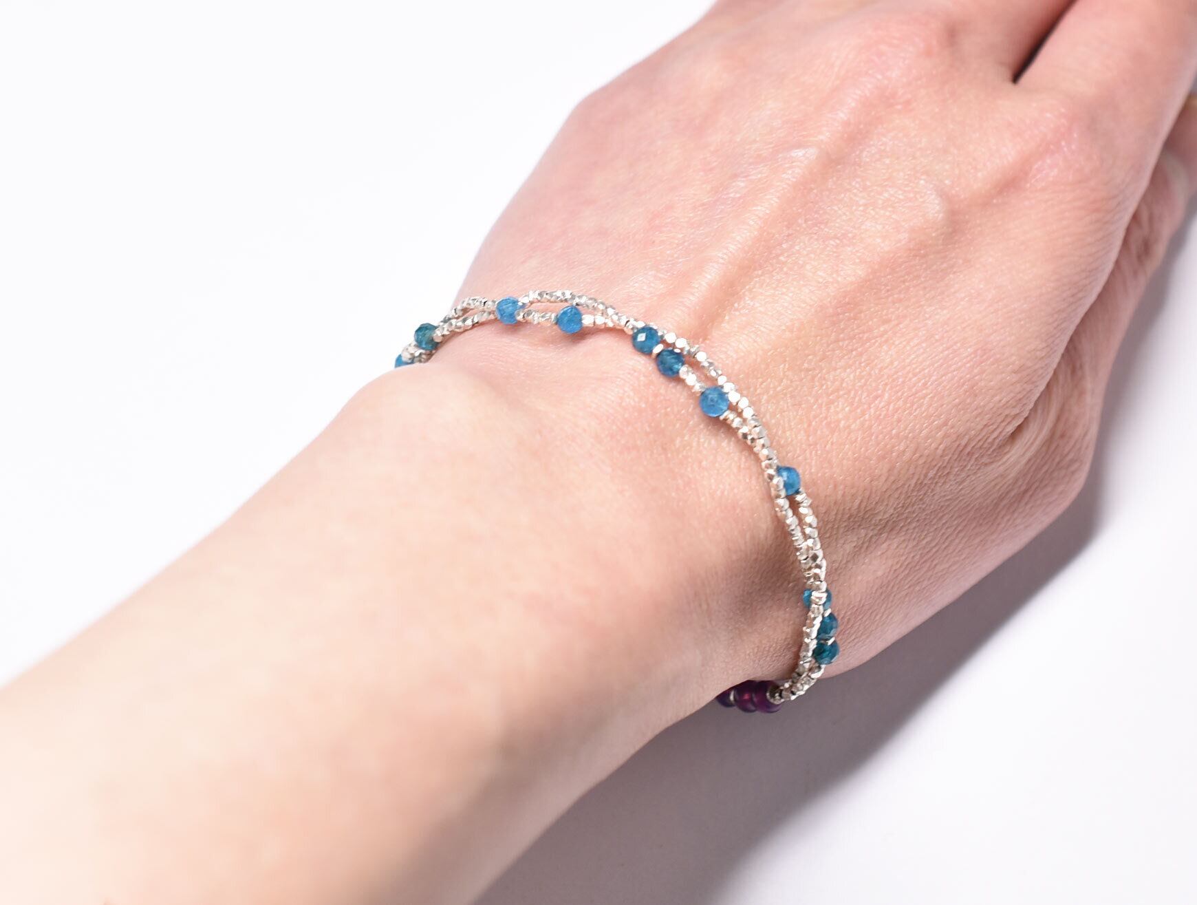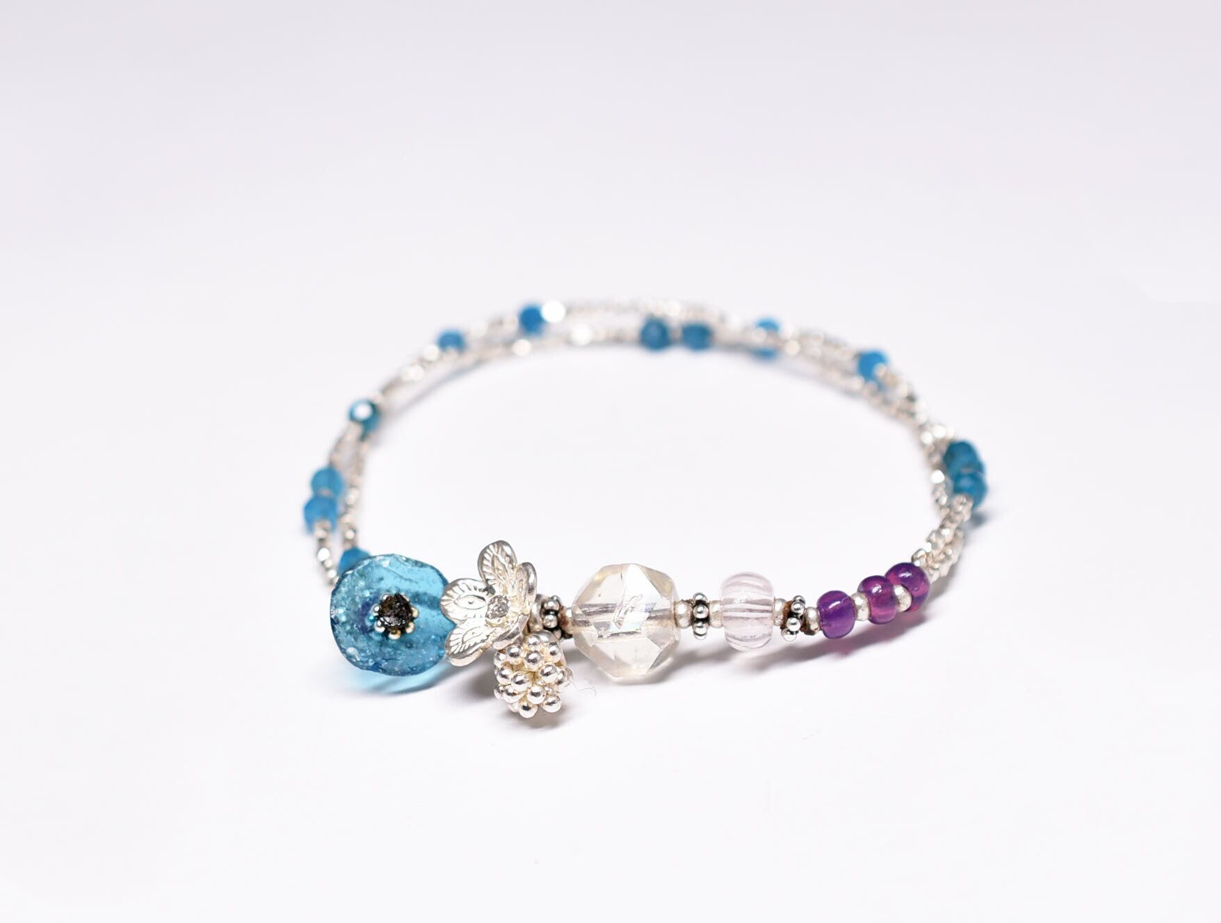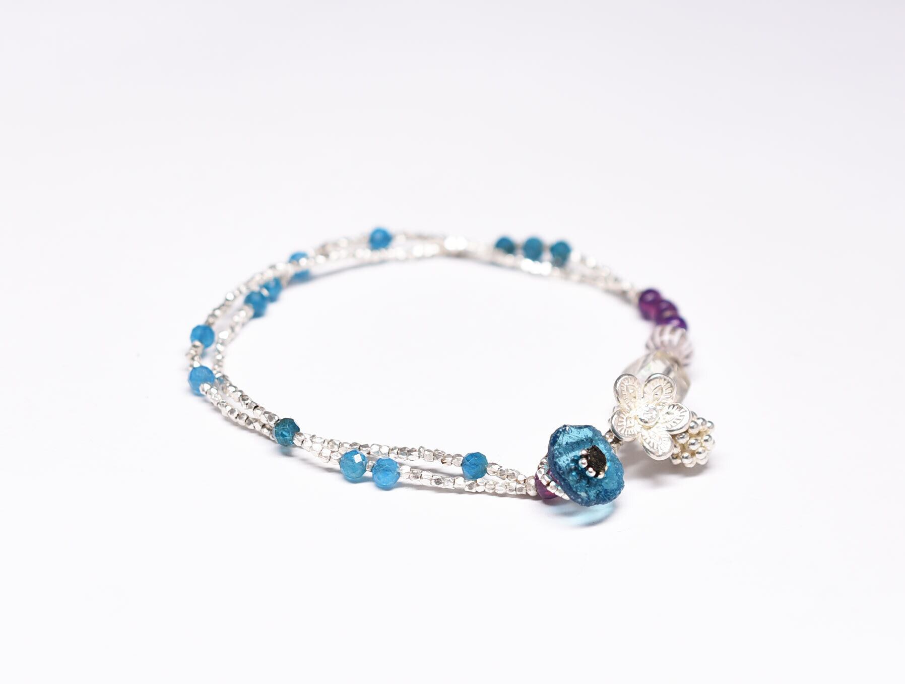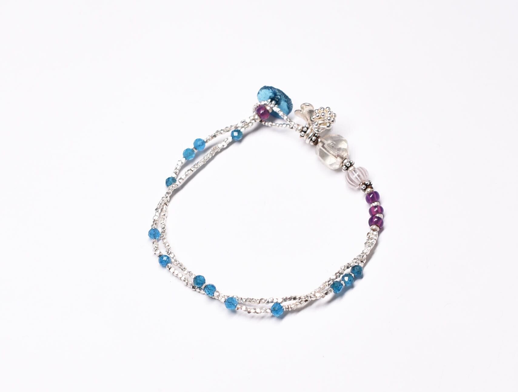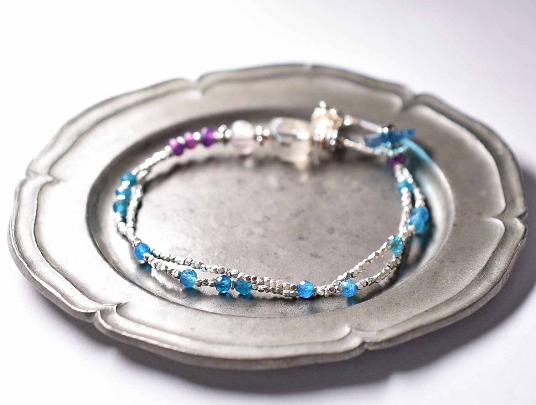 ヴィンテージオーロラビーズとグーズベリー、すみれ色ビーズ、アパタイト、煌めくカレンシルバービーズを繋いだ2連のブレスです。