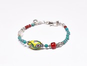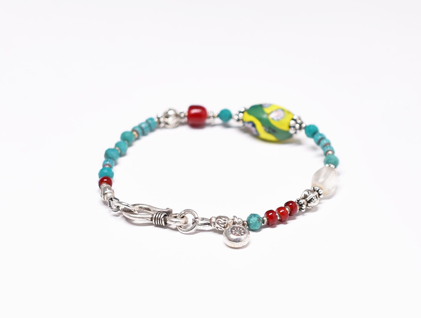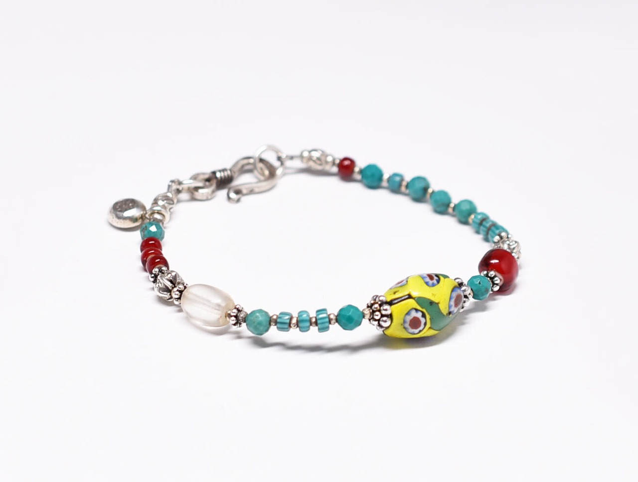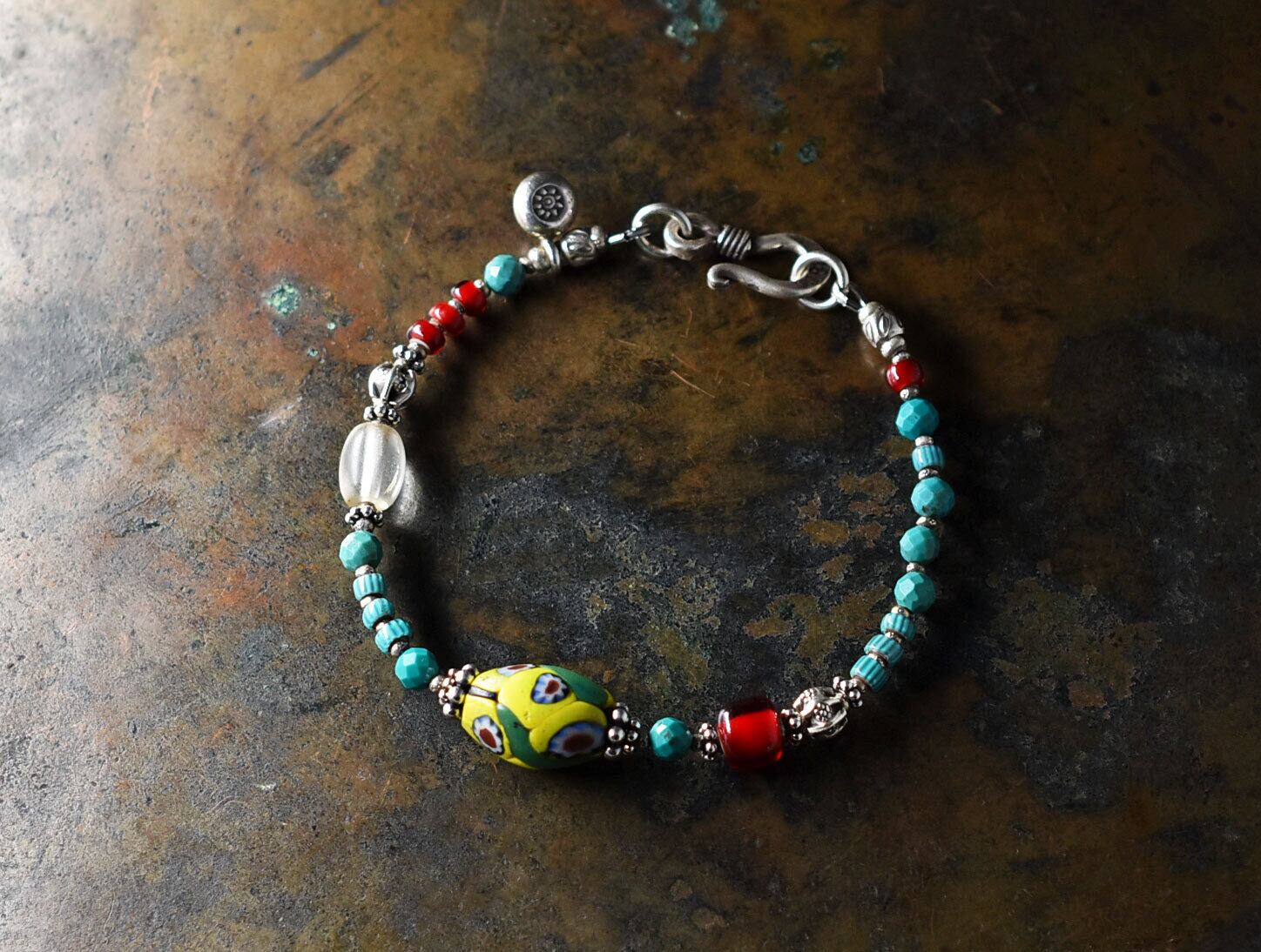 ヴェネチアアンティークミルフィオリと濃赤ホワイトハーツ、ターコイズブルーシェブロンビーズ、アンティークボヘミアビーズ、ターコイズ、カレンシルバーを繋いだブレスです。