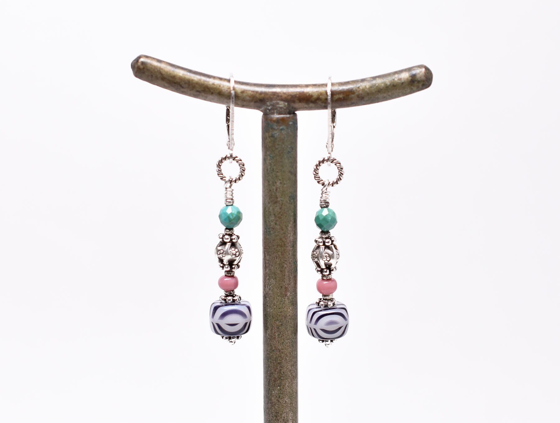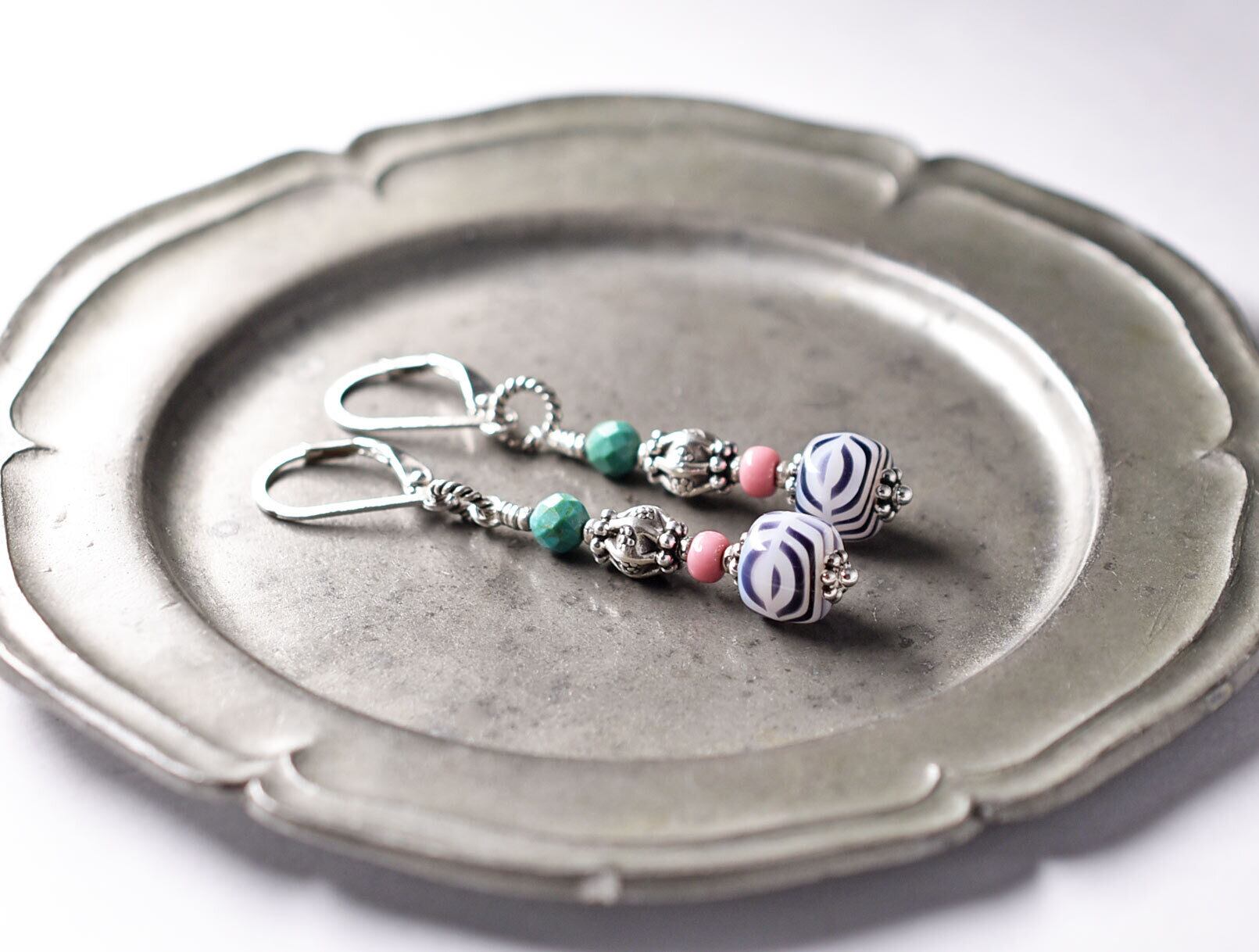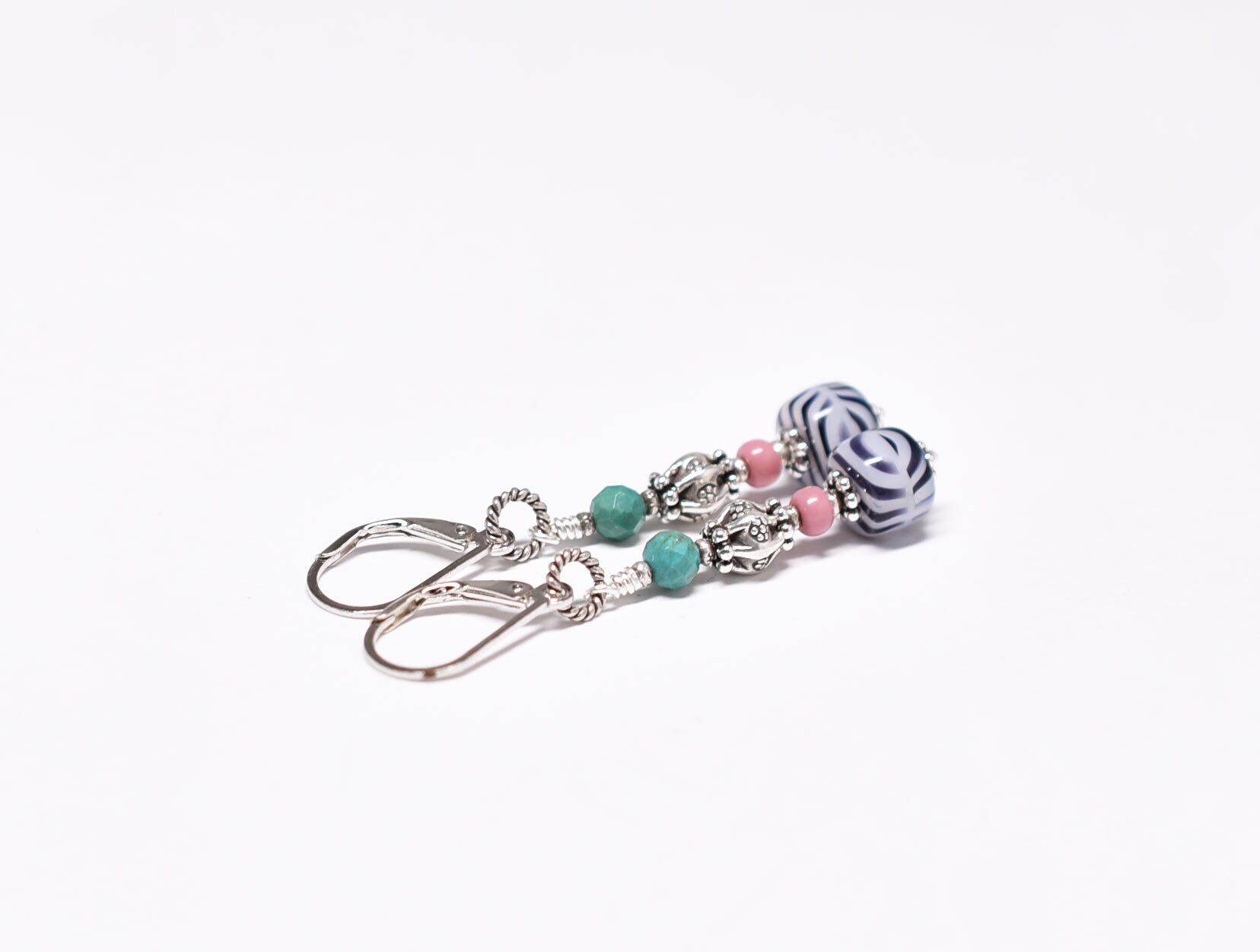 ゼブラ柄ヴィンテージビーズとピンクマサイ、カレンシルバー、ターコイズのピアス