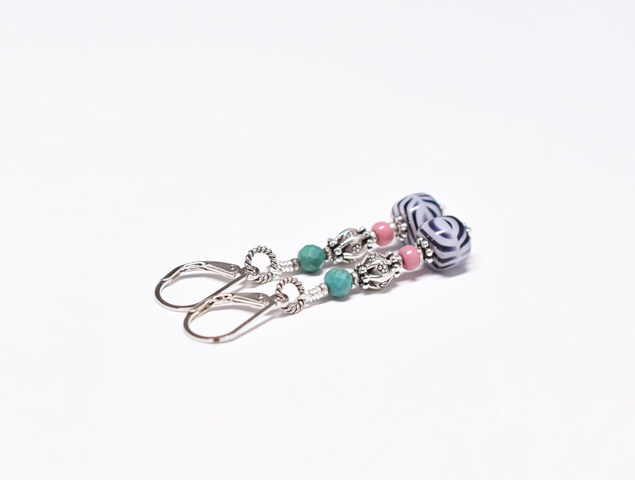 ゼブラ柄ヴィンテージビーズとピンクマサイ、カレンシルバー、ターコイズを繋いだピアスです。