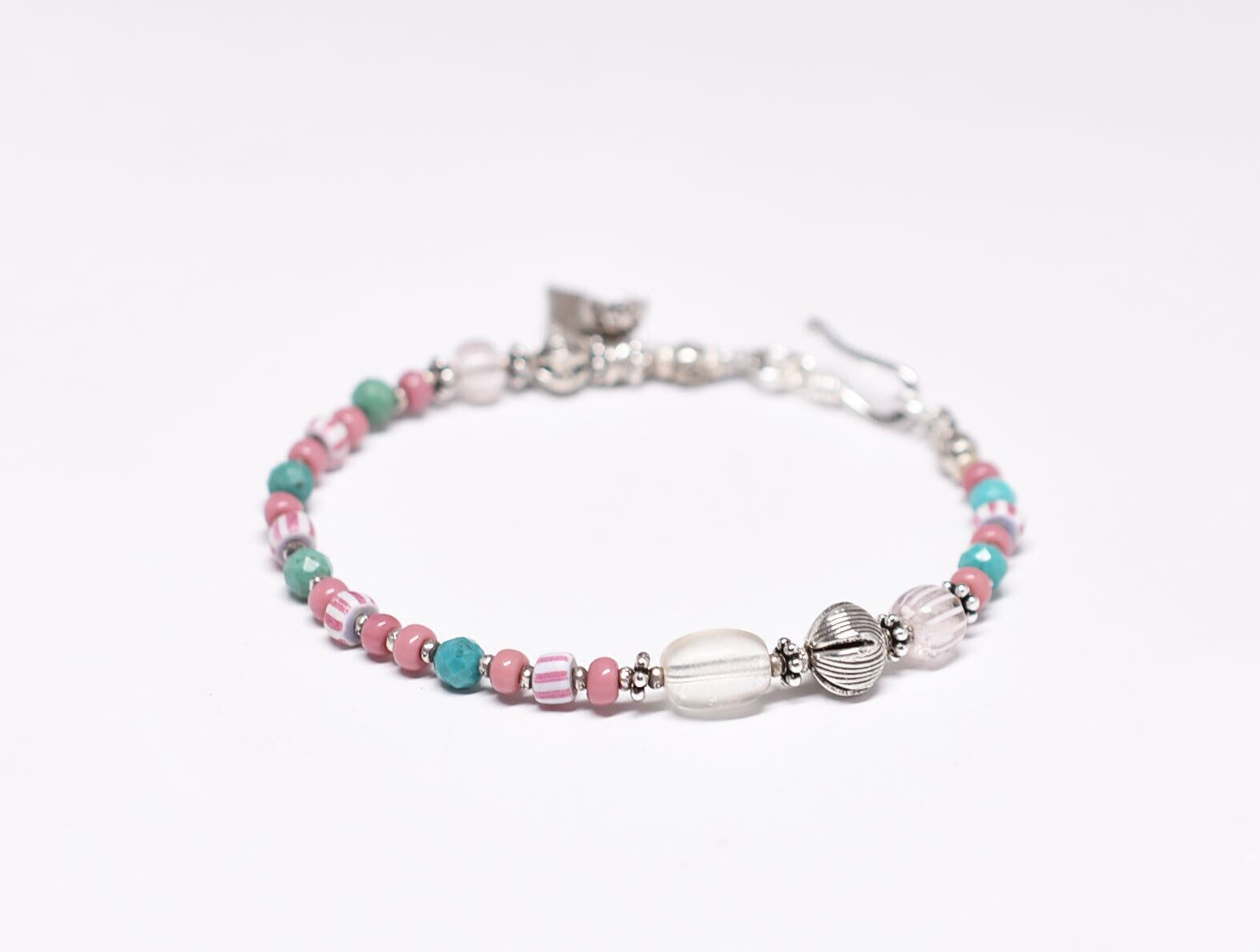 ボヘミアアンティークビーズとカレンシルバー、グーズベリー、ヴェネチアアンティークビーズ、ターコイズを繋いだブレスです。