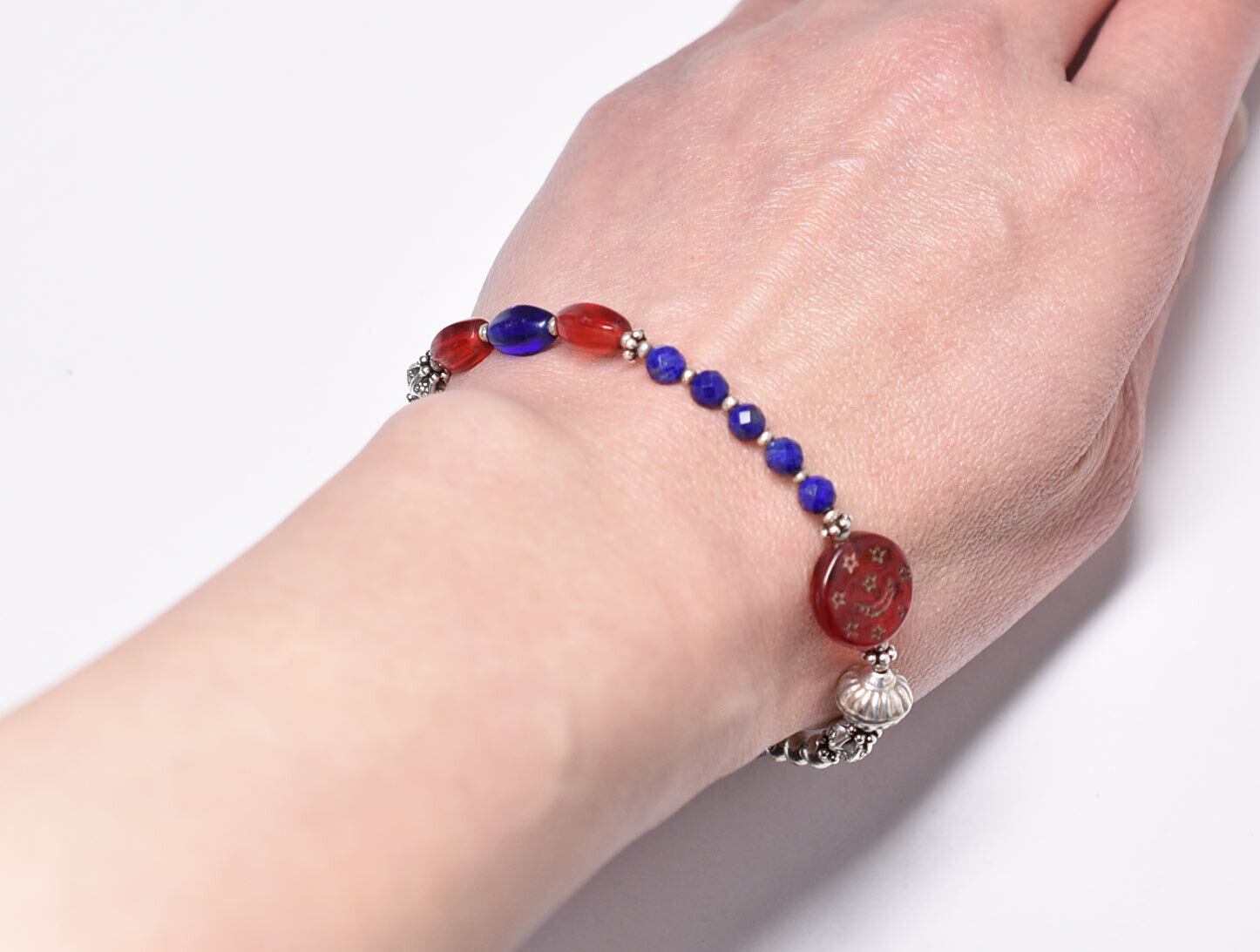 真っ赤なアンティークボヘミアビーズとラピス、カレンシルバーのブレス