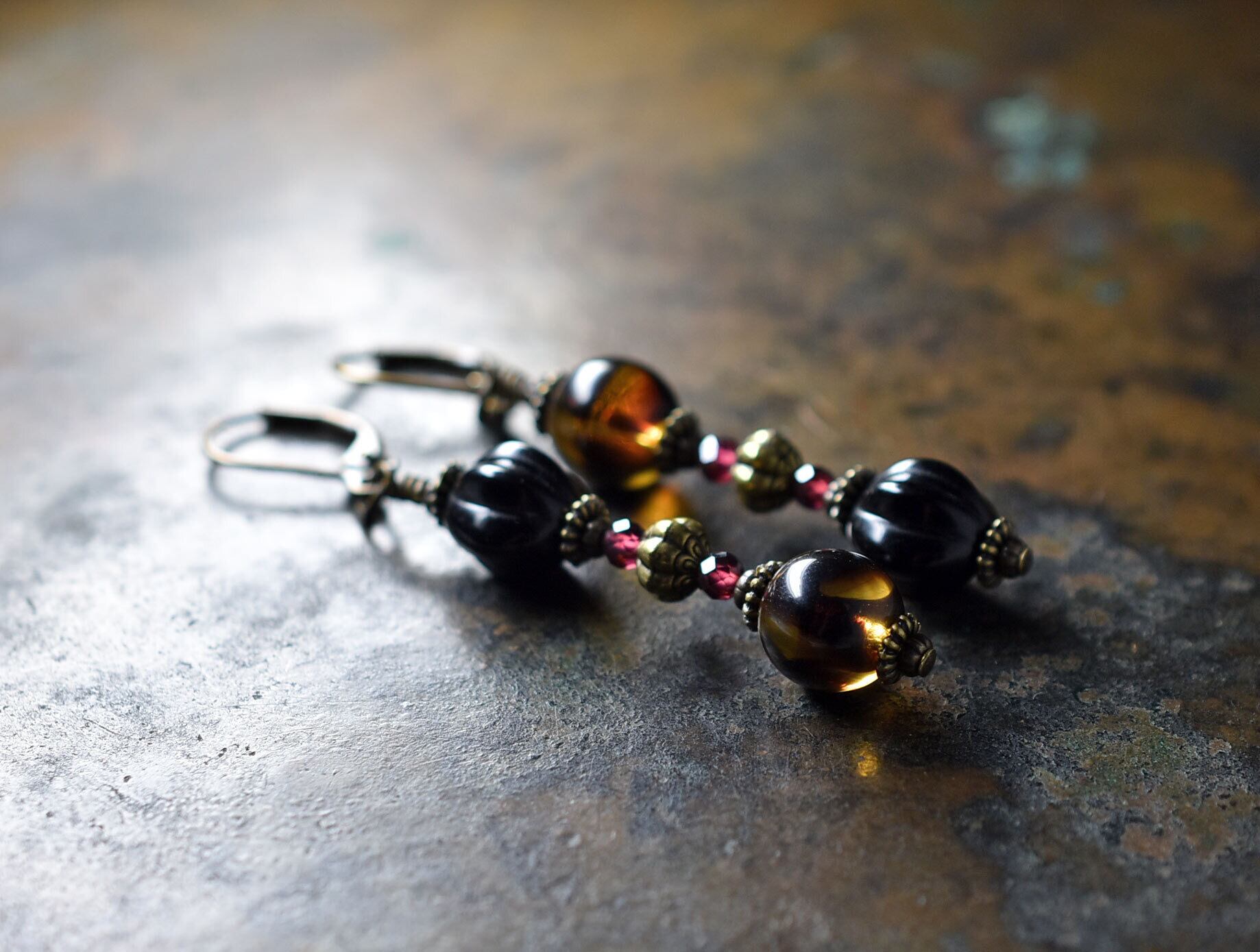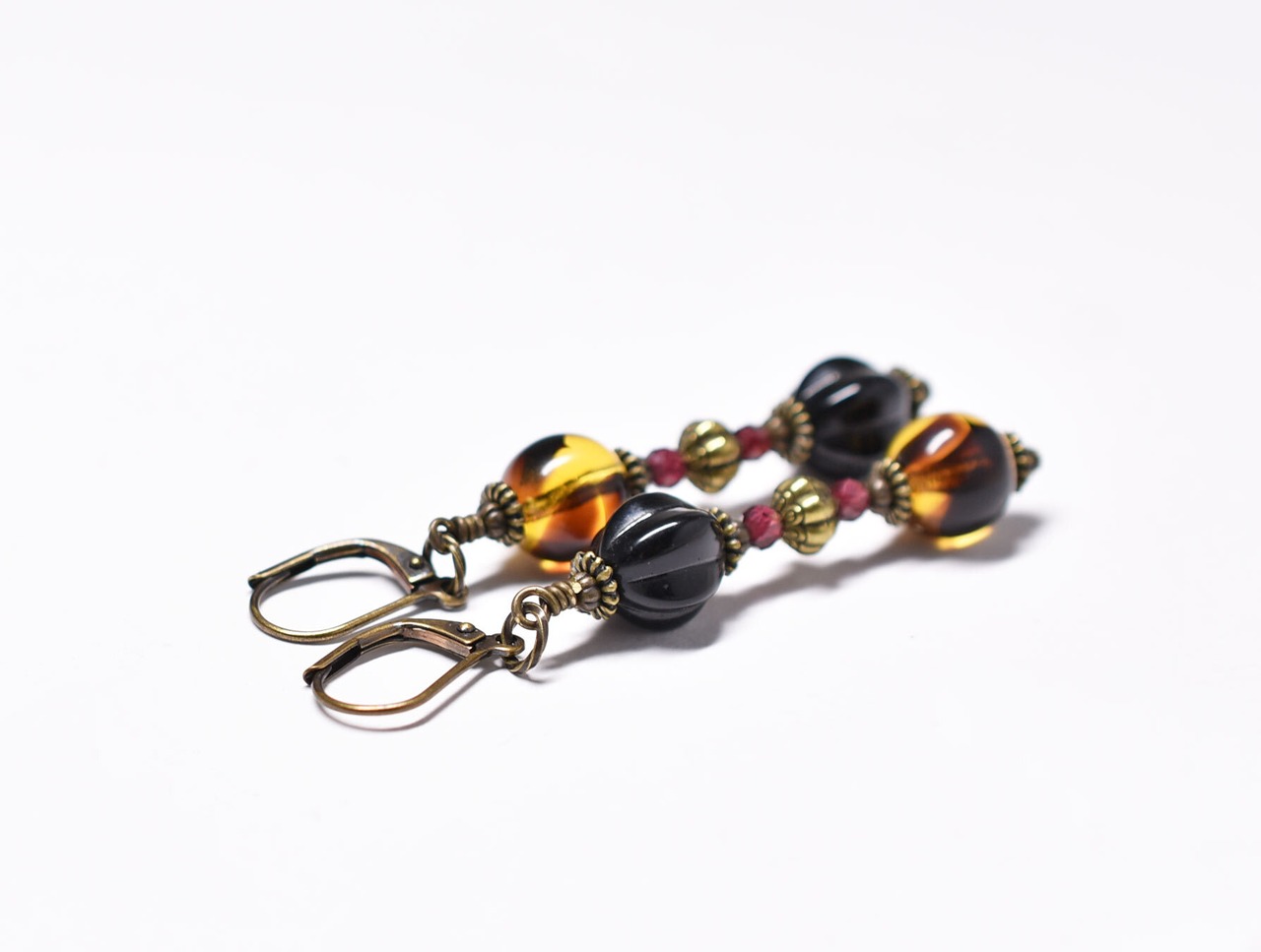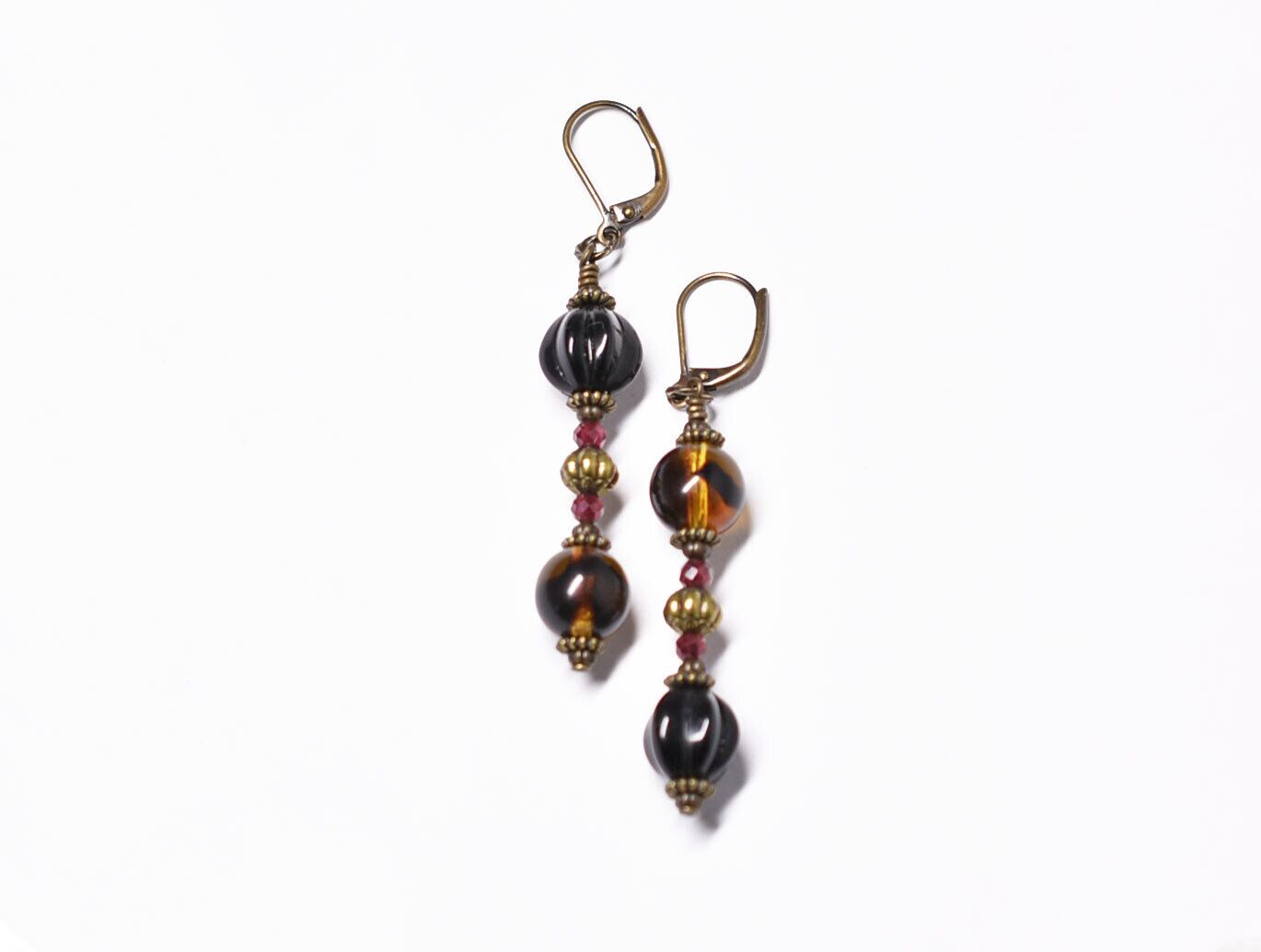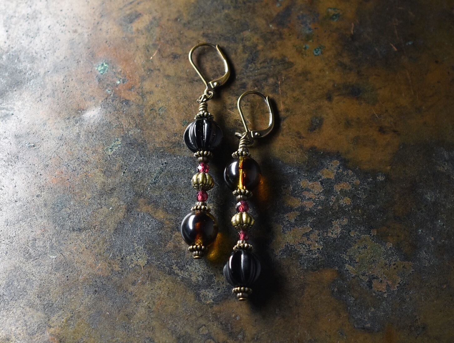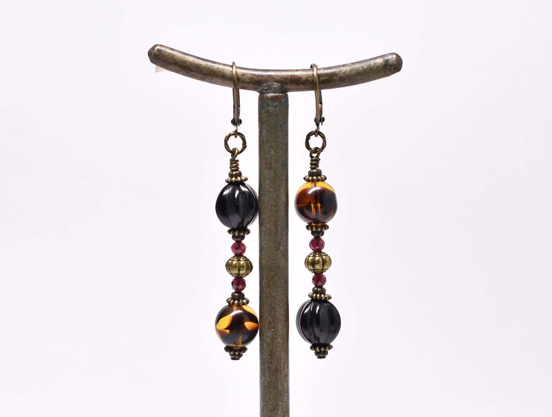 まん丸べっ甲色ドイツヴィンテージビーズと漆黒ビーズ、ガーネットと手毬ブラスを繋いだピアスです。