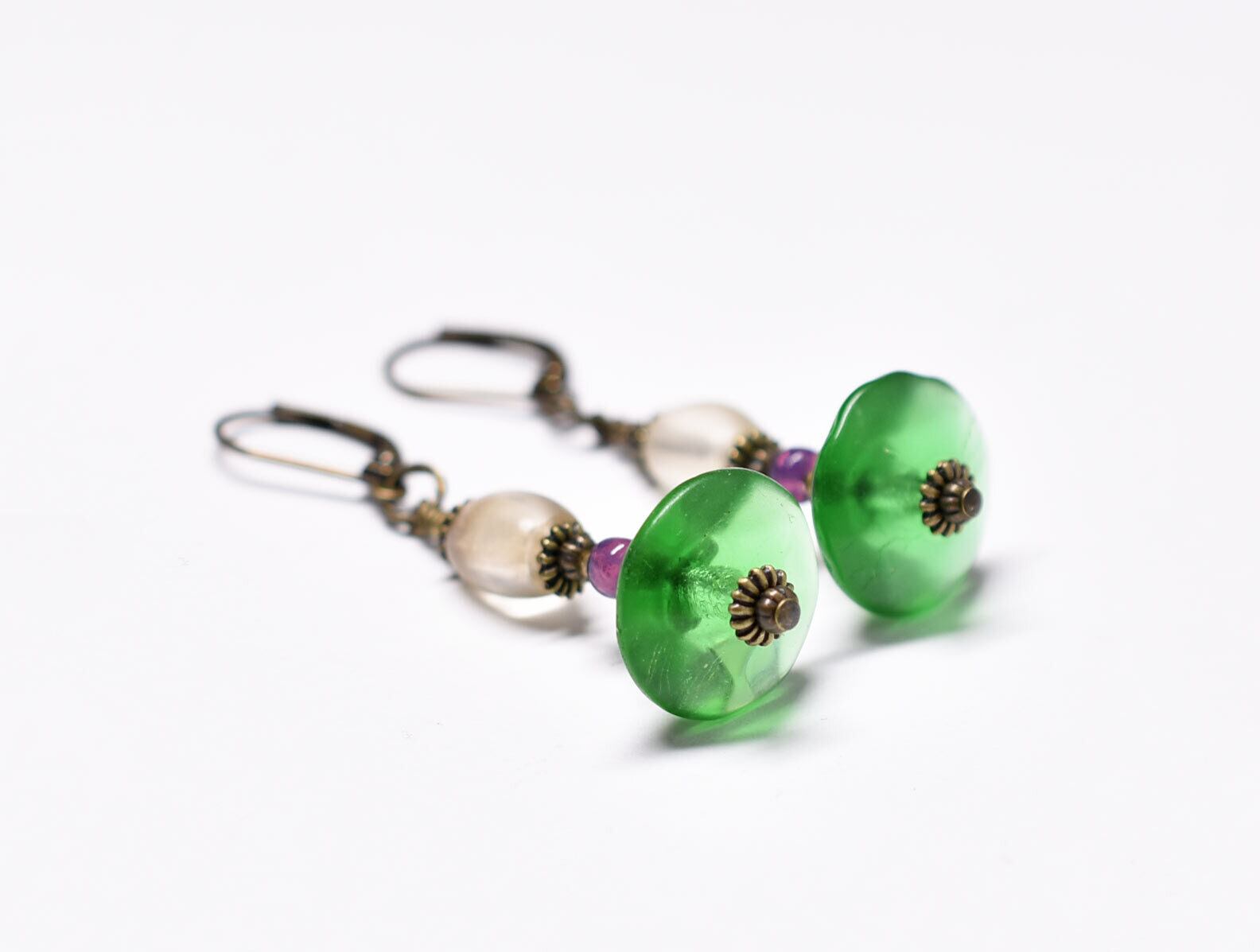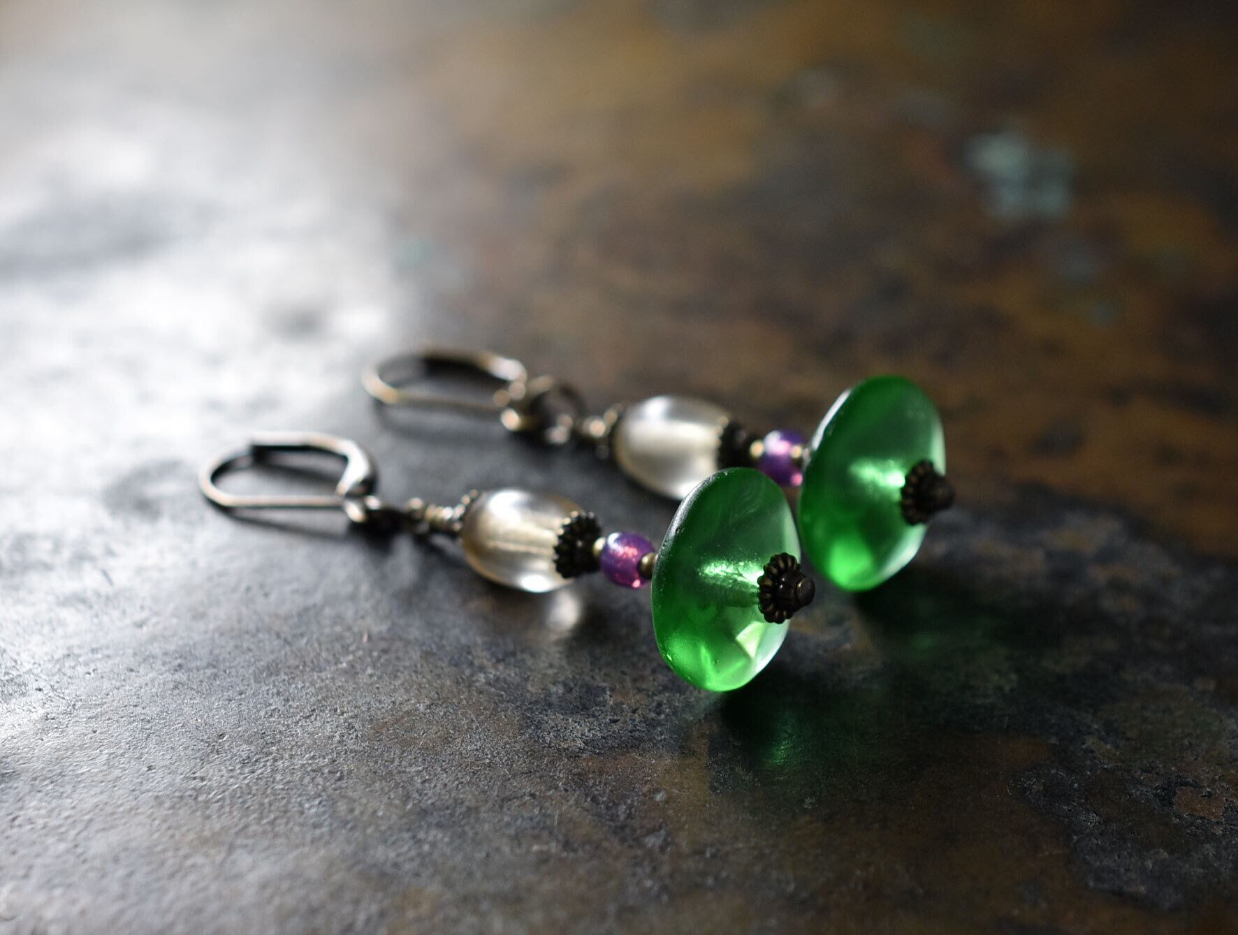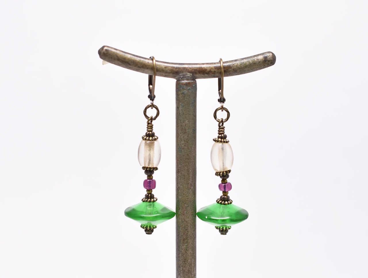 ディスク型&楕円型アンティークボヘミアビーズとすみれ色ヴィンテージビーズを繋いだピアスです。