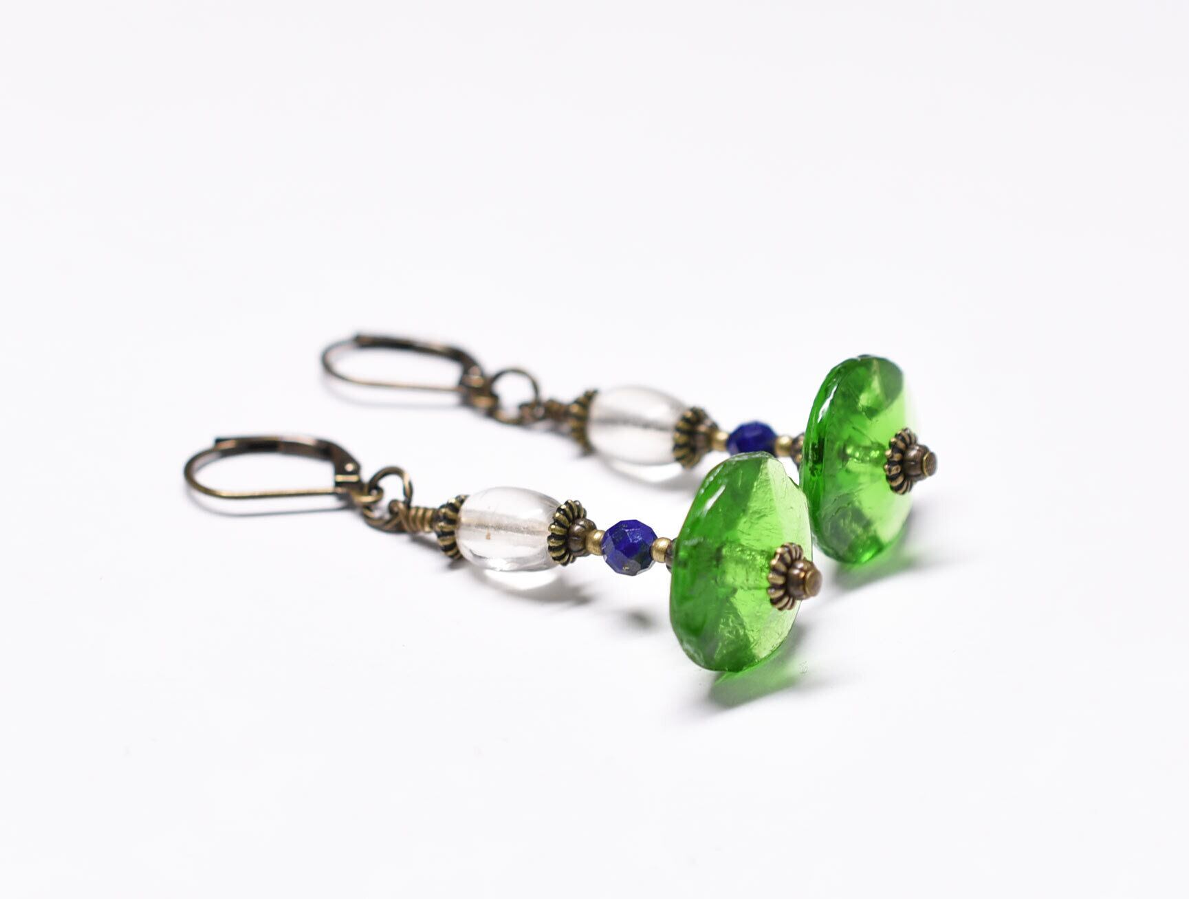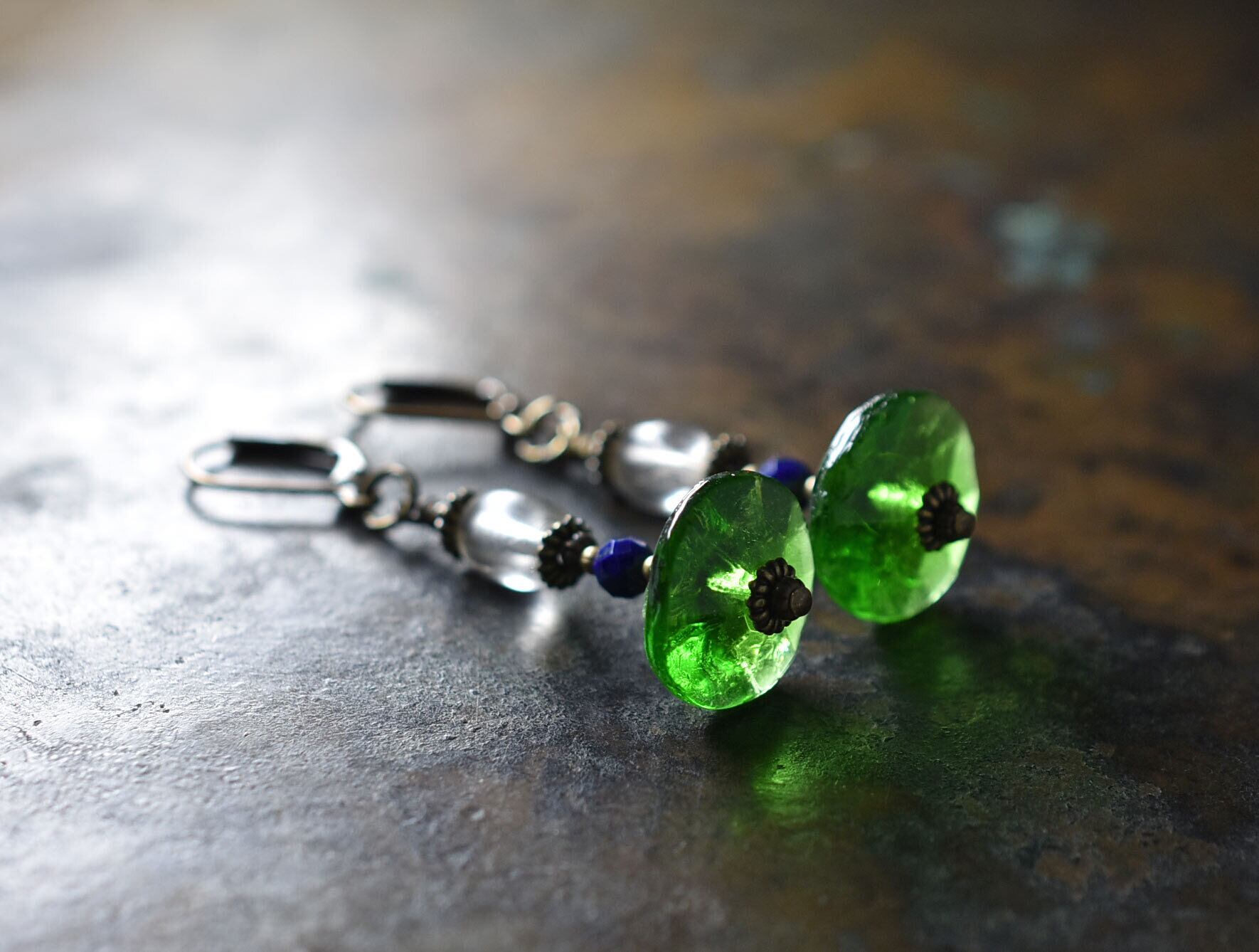 ディスク型&楕円型アンティークボヘミアビーズとラピスズを繋いだピアスです。