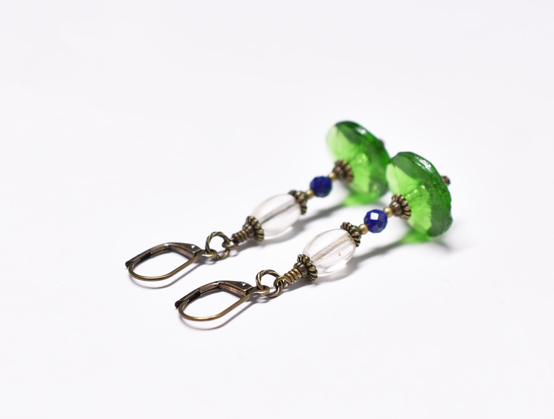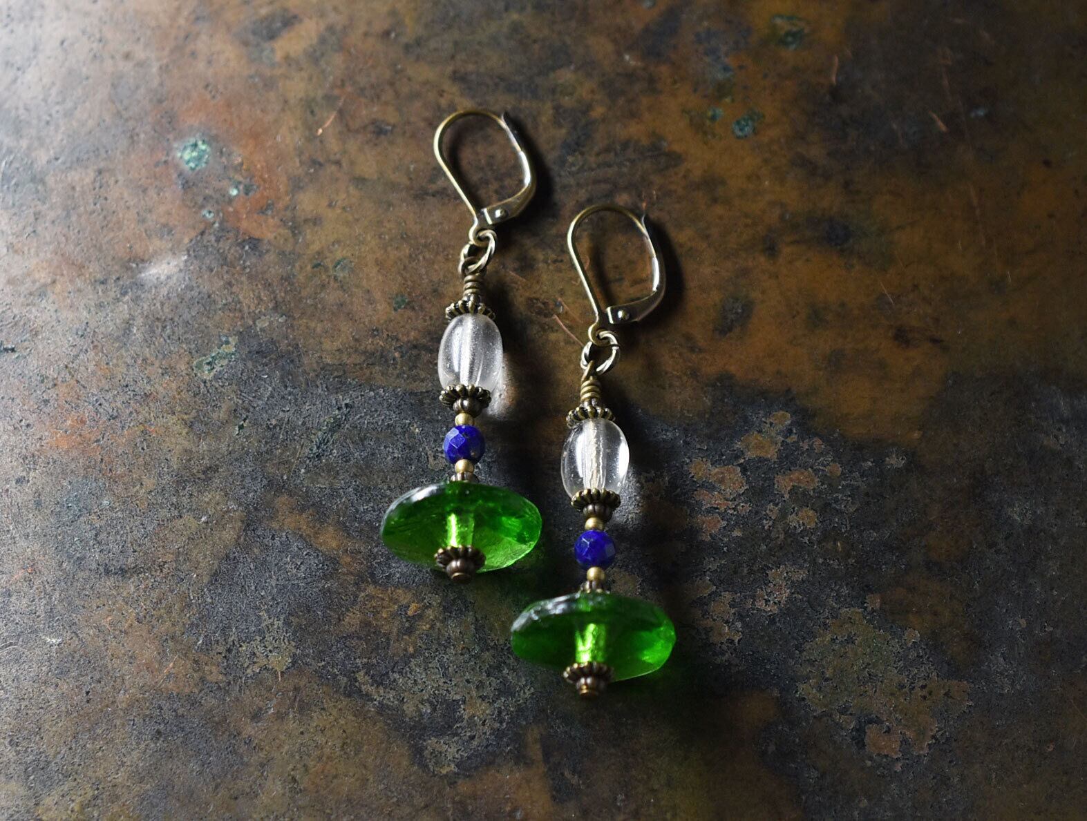 ディスク型&楕円型アンティークボヘミアビーズとラピスのピアス