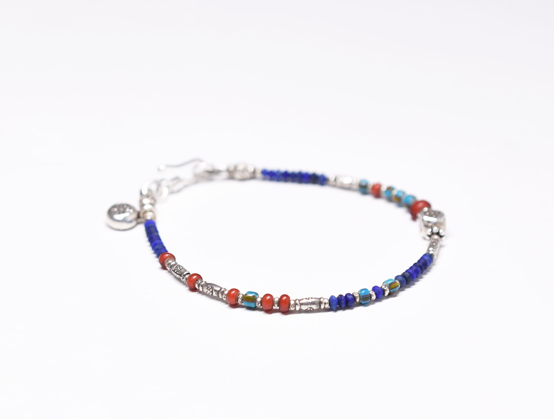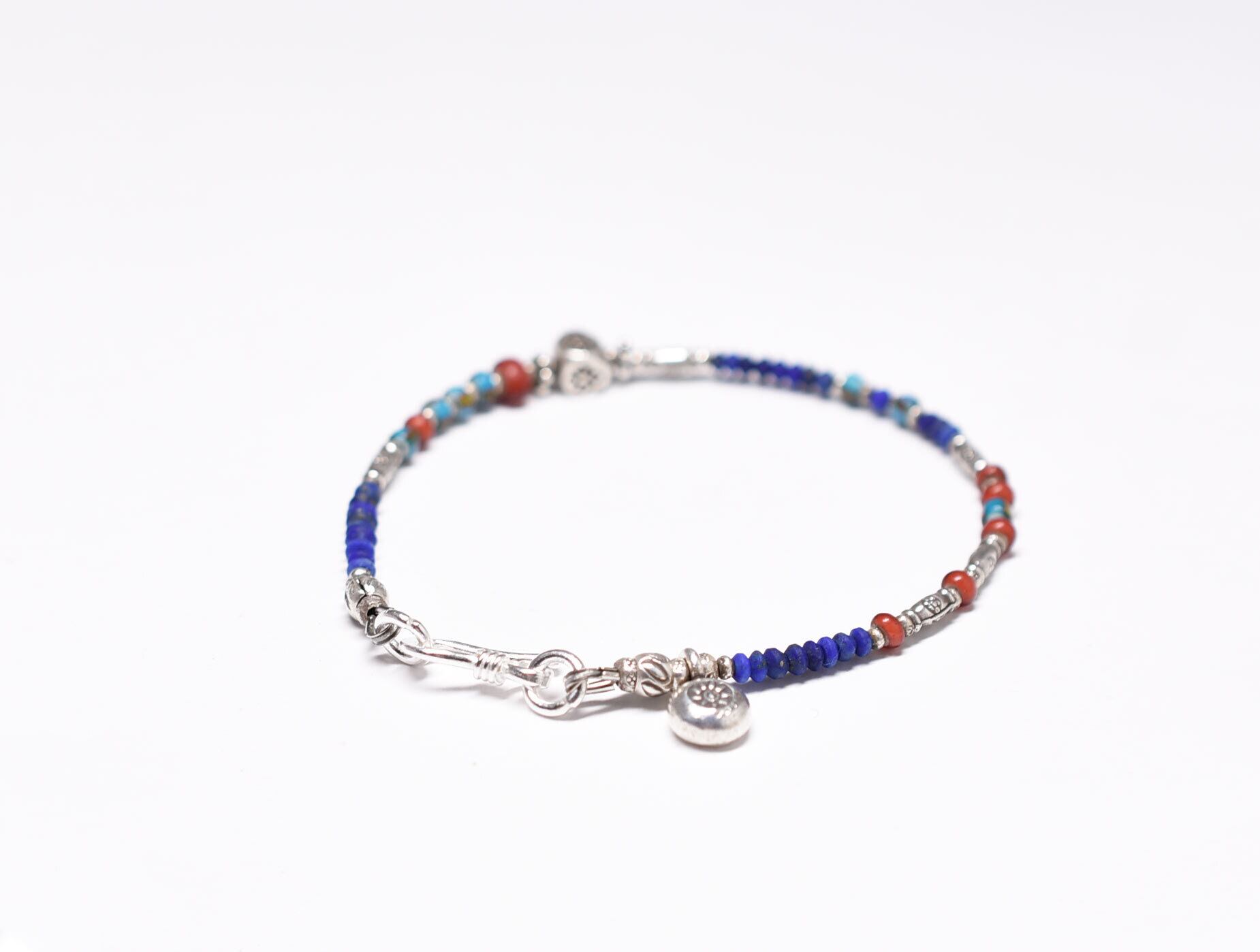 ラピスとターコイズブルー&金赤ホワイトハーツ 、カレンシルバーを繋いだ華奢なブレスです。