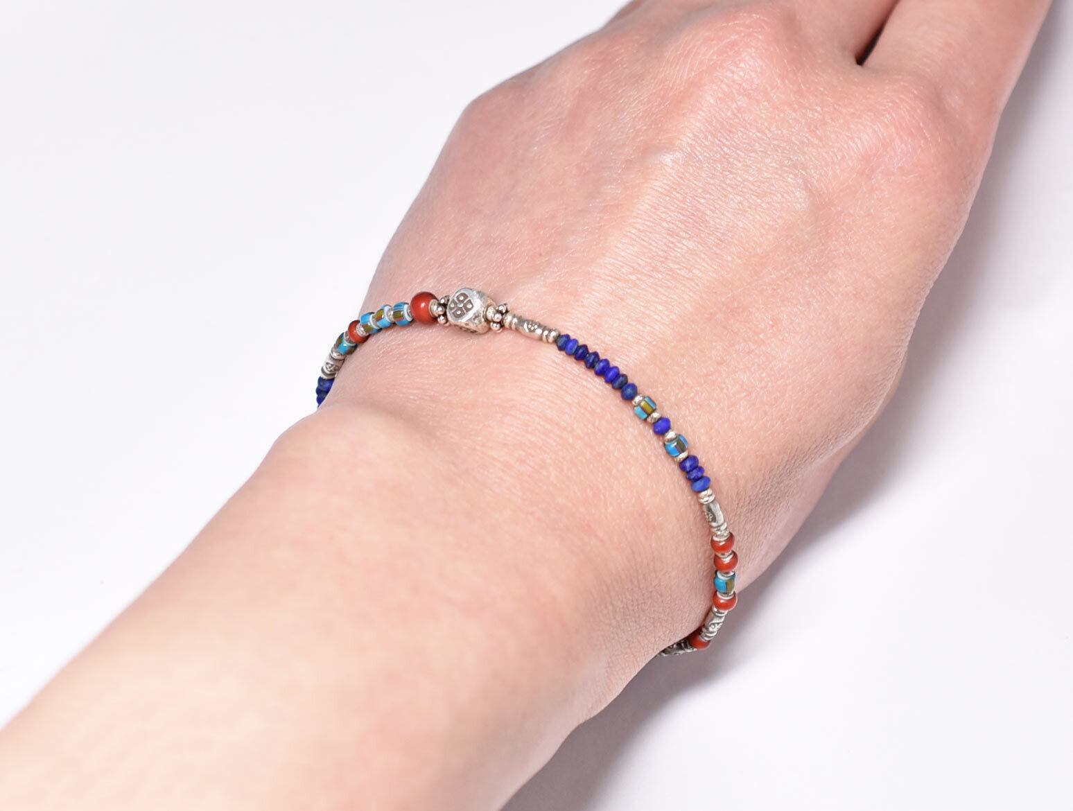 ラピスとターコイズブルー&金赤ホワイトハーツ 、カレンシルバーの華奢なブレス