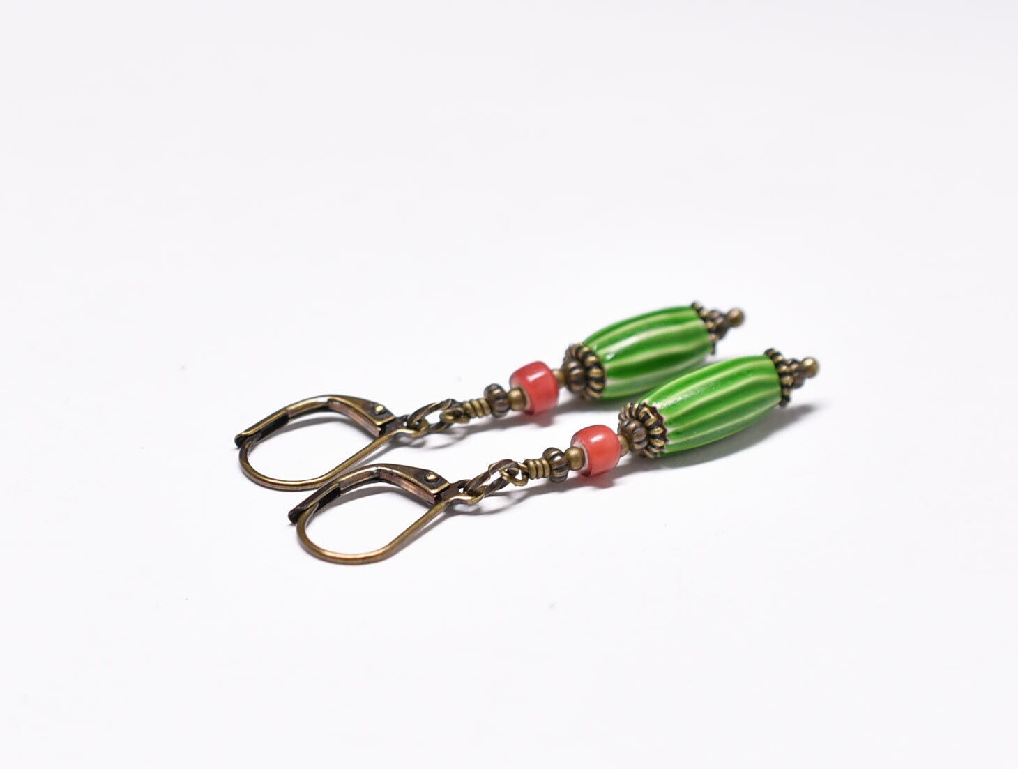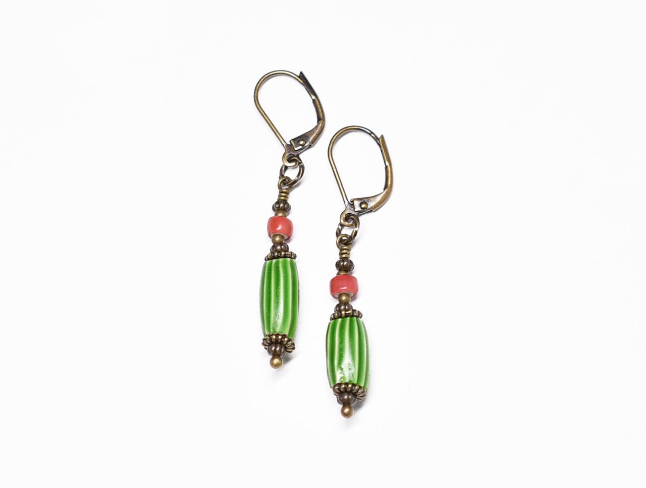 アンティークウォーターメロンと金赤ホワイトハーツを繋いだピアスです。