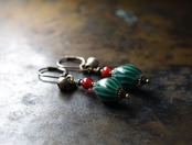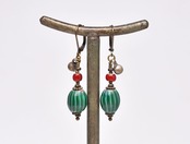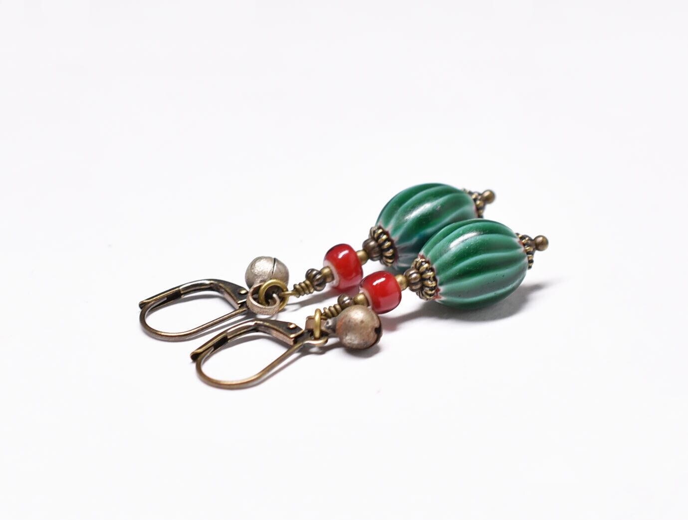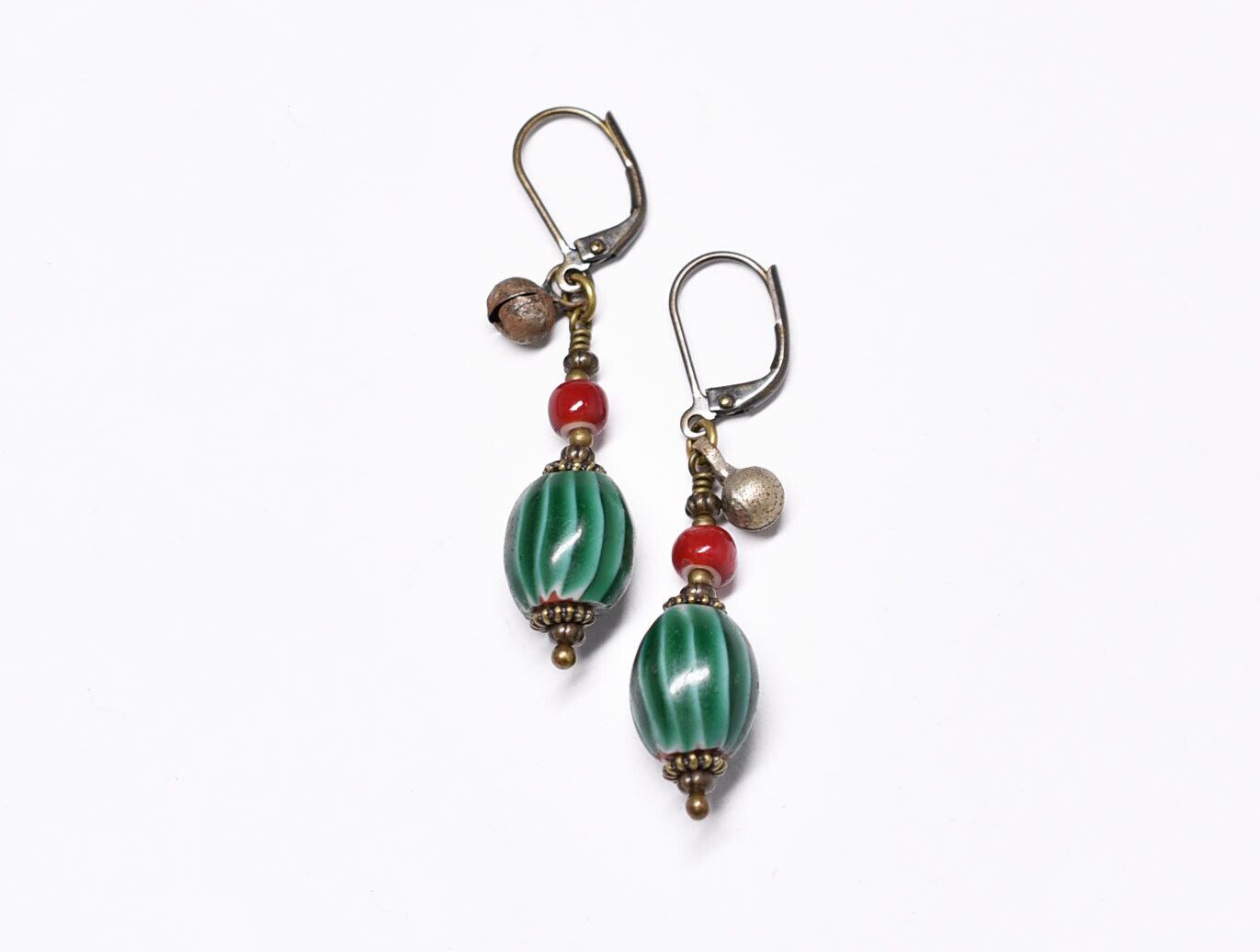 ぷっくりアンティークウォーターメロンと濃赤ホワイトハーツの民族鈴を繋いだピアスです。
