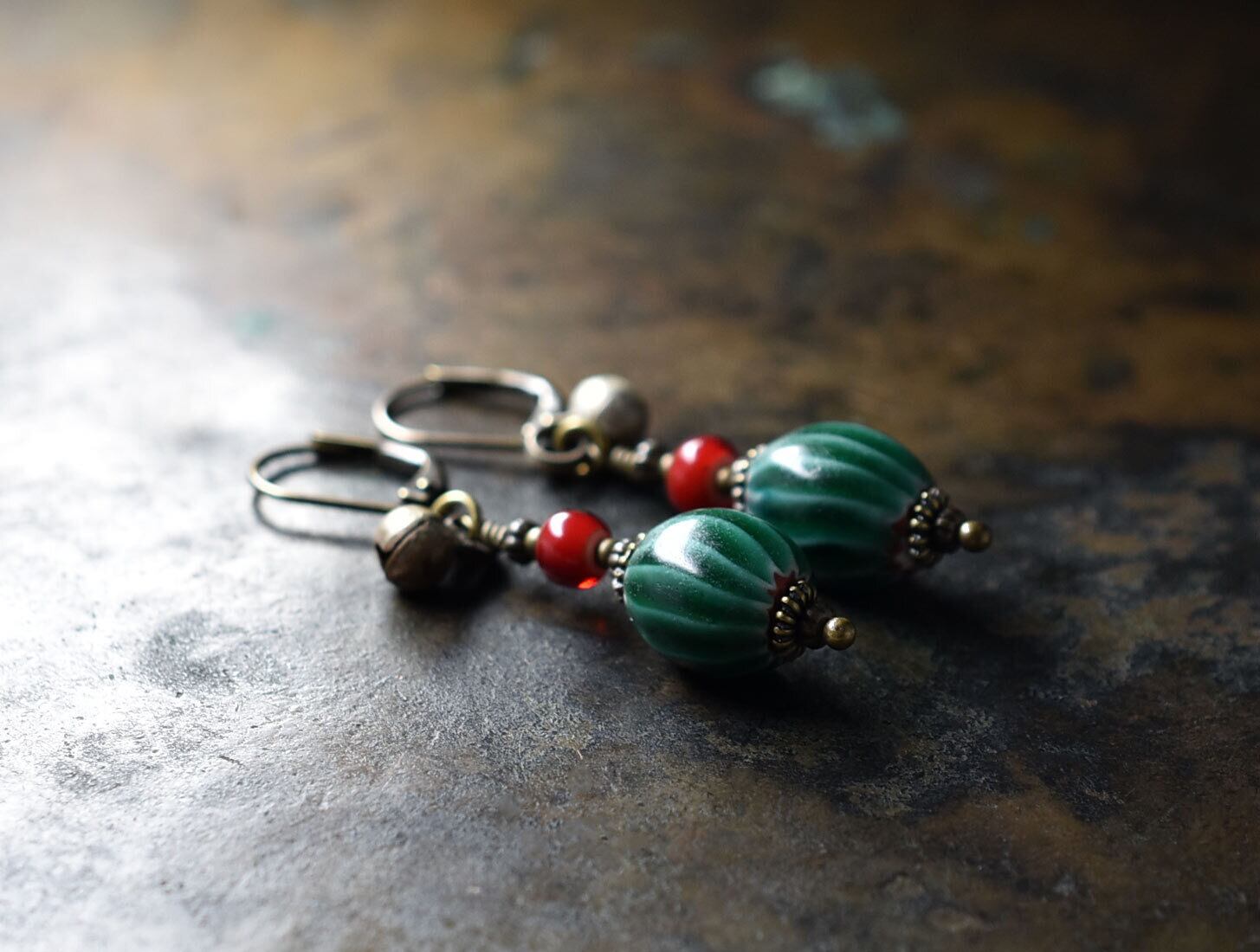 ぷっくりアンティークウォーターメロンと濃赤ホワイトハーツの民族鈴のピアス