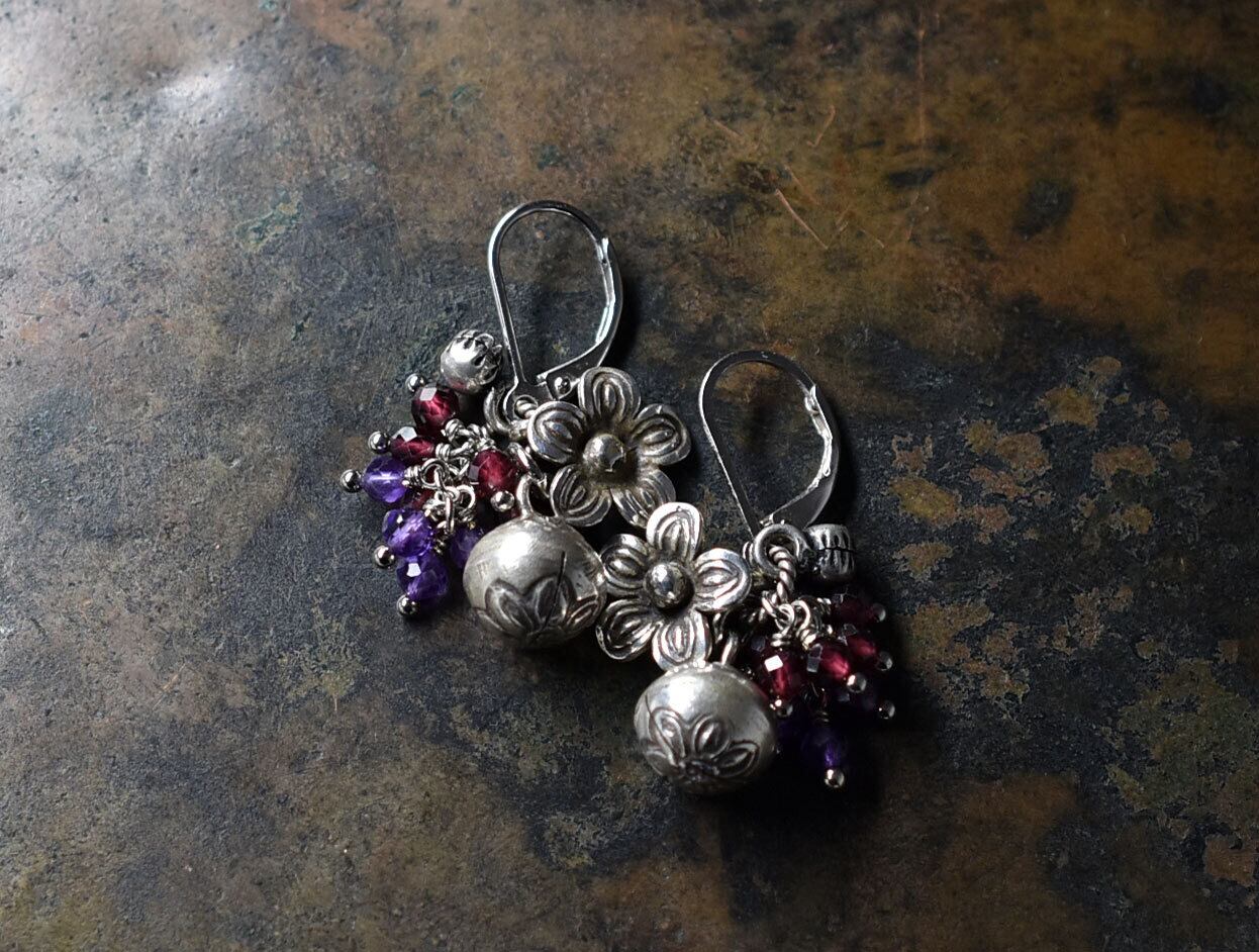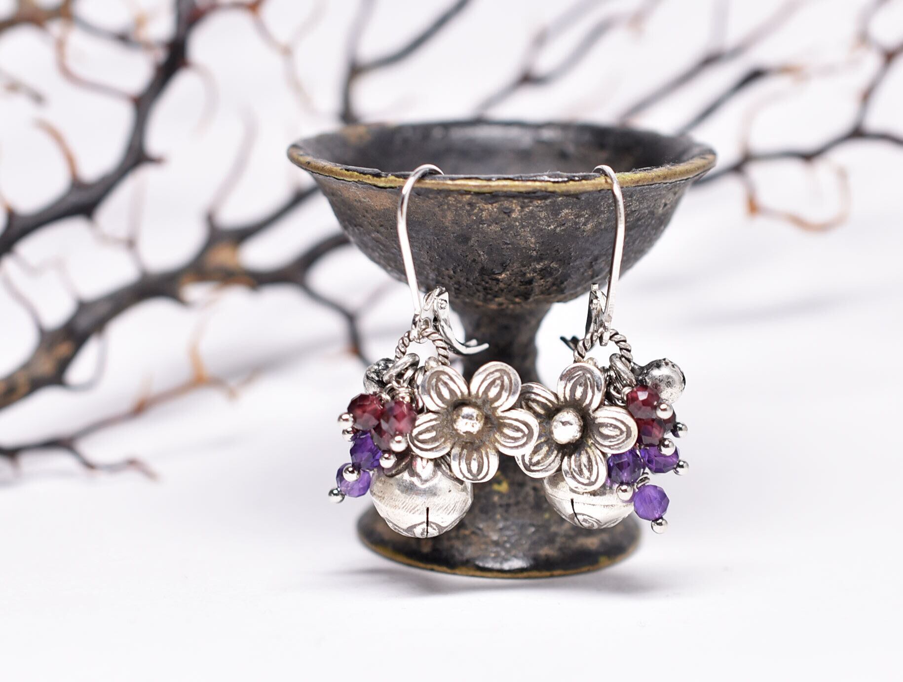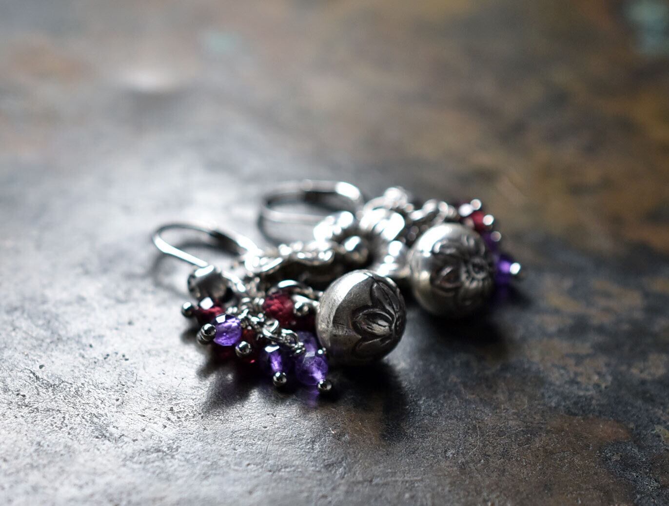 鈴とお花カレンシルバー、たわわなガーネットとアメジスト、インドシルバー鈴のピアス