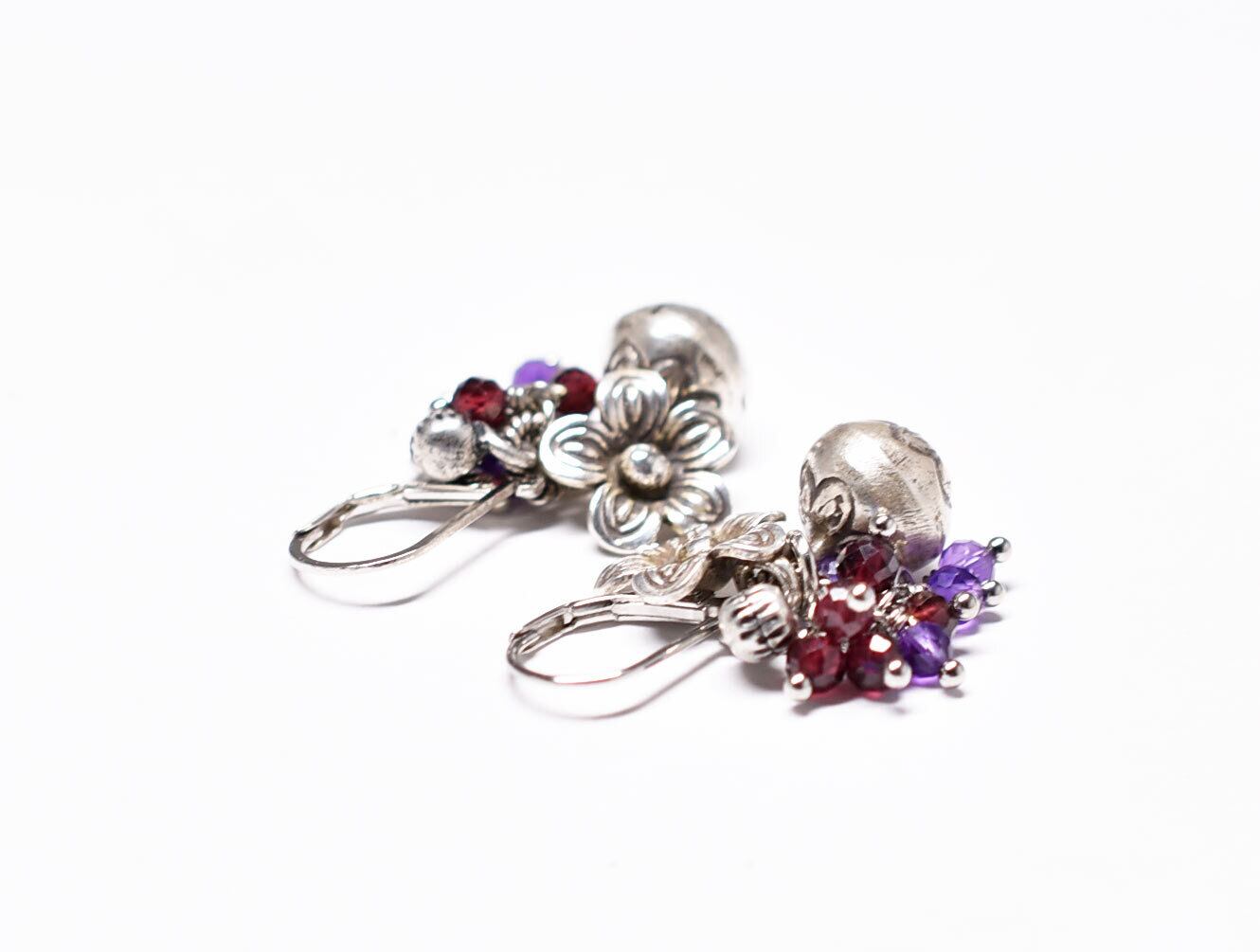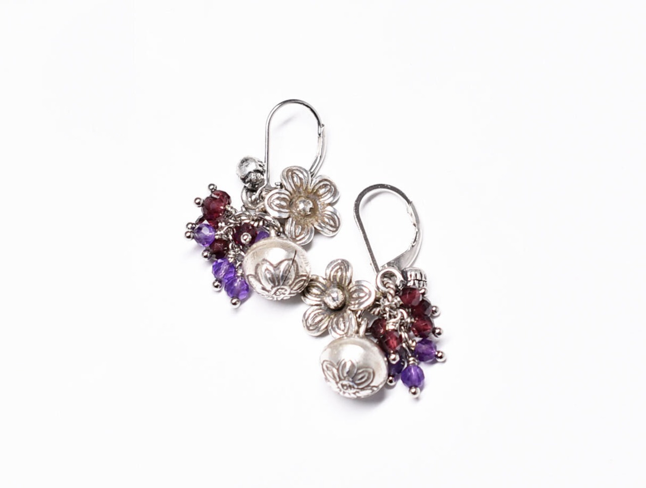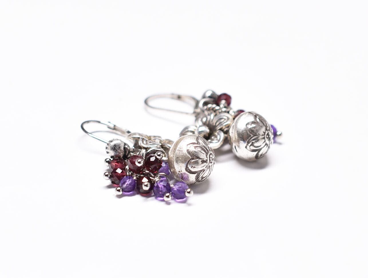鈴とお花カレンシルバー、たわわなガーネットとアメジスト、インドシルバー鈴のピアス