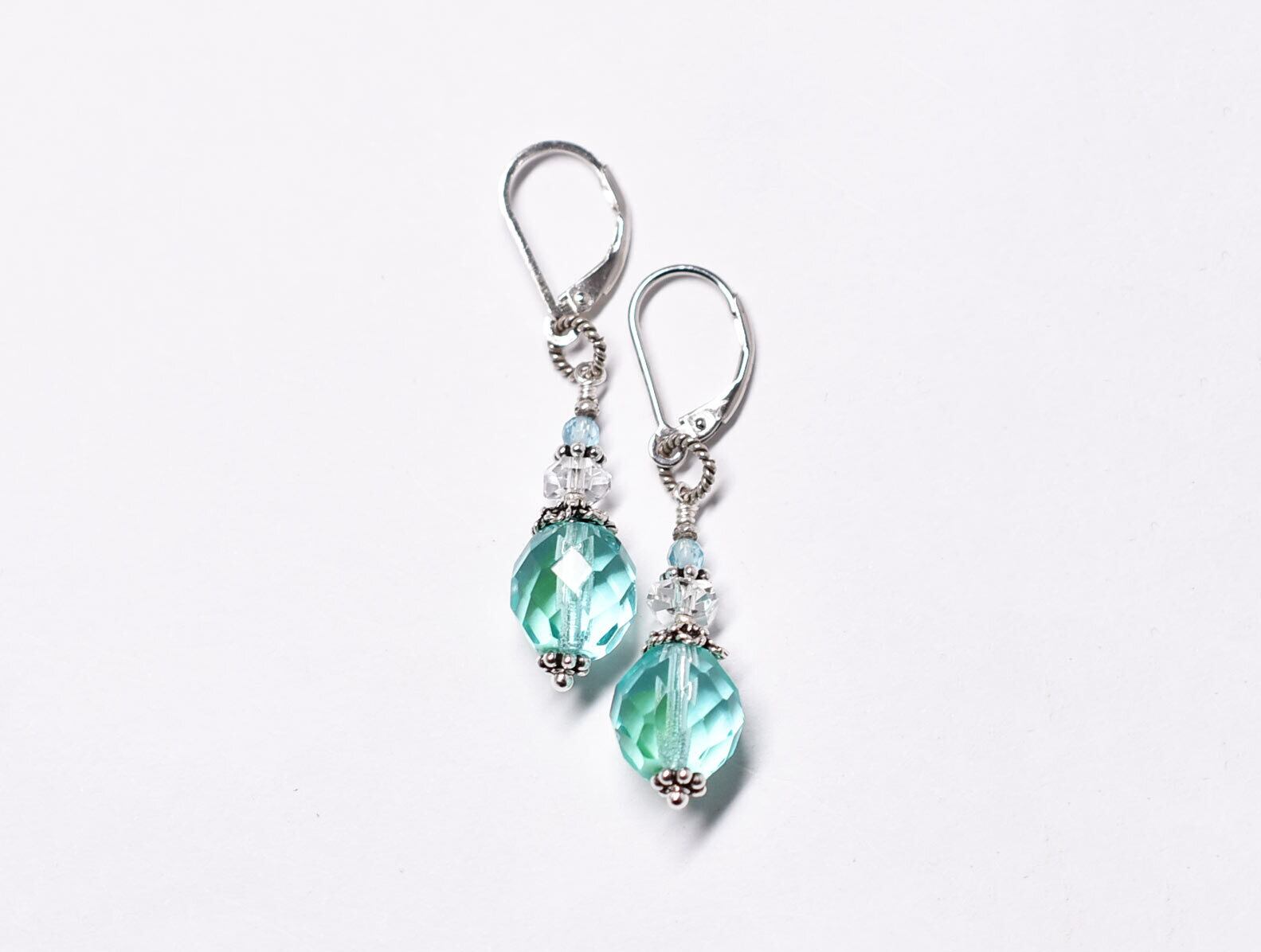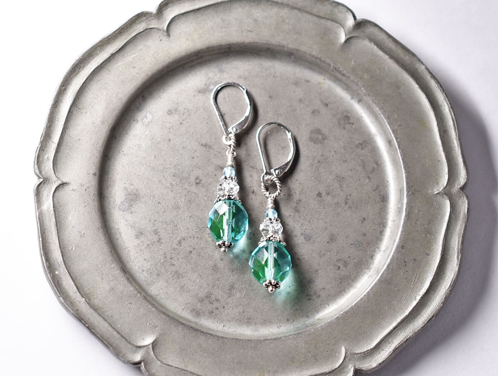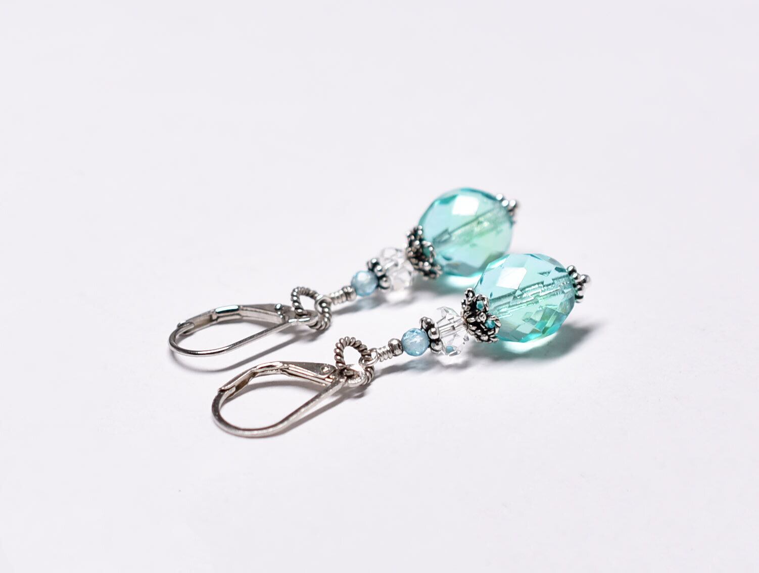 ウランガラスとクォーツ、アクアマリンを繋いだピアスです。