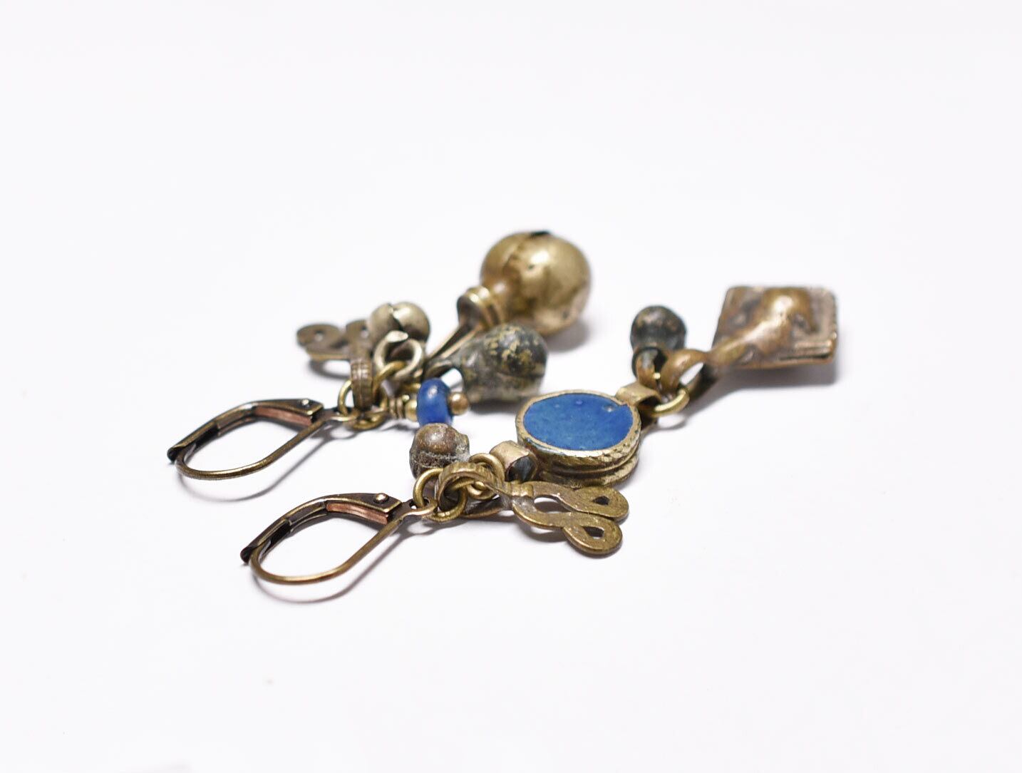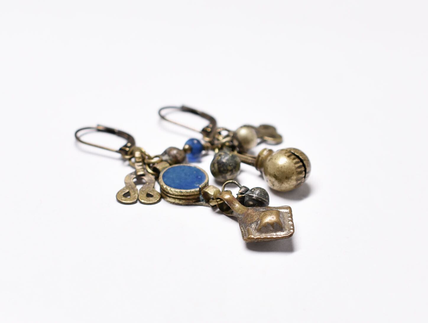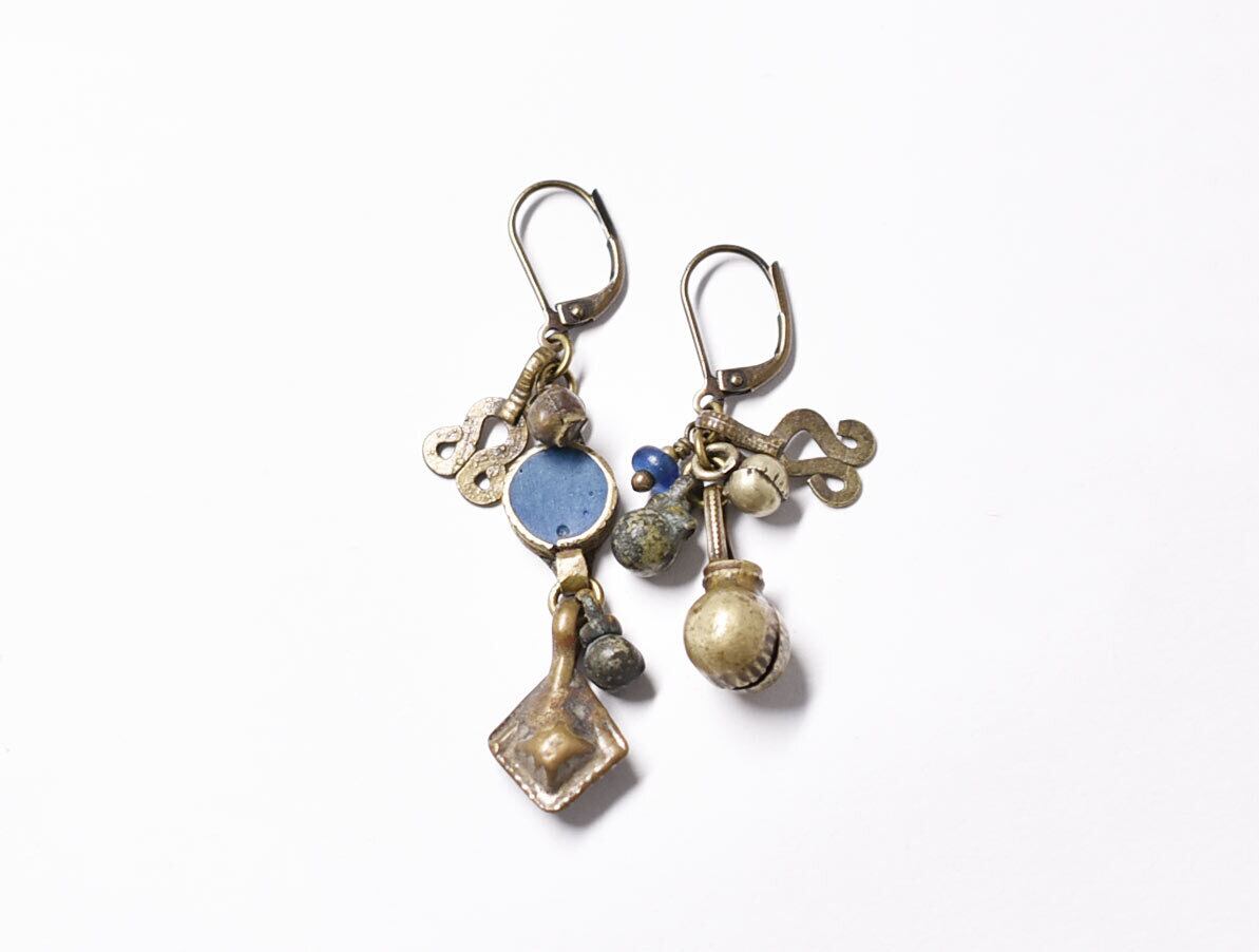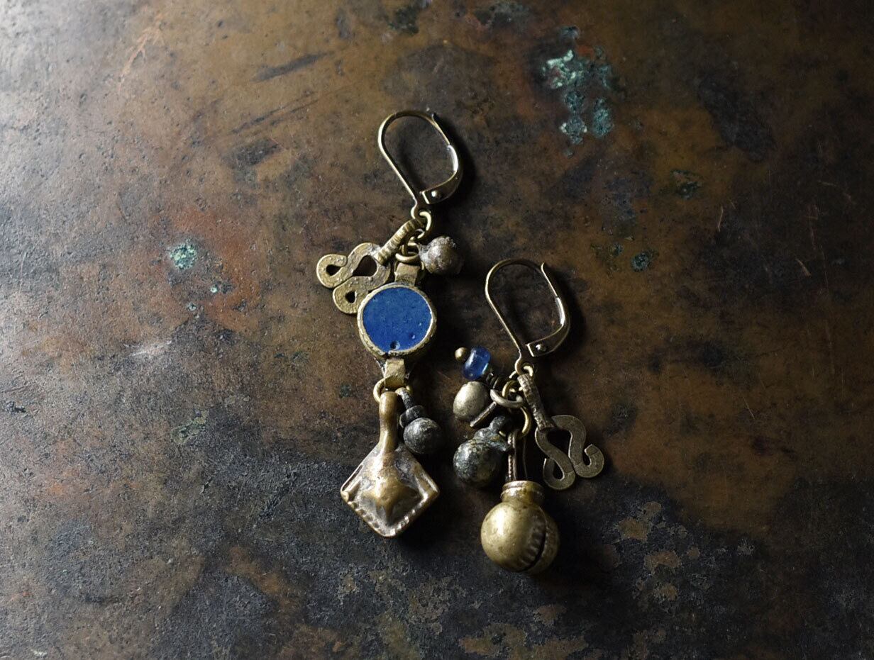 ラピス象嵌パーツとアフガンメタルと民族鈴、ブルービーズを繋いだアンシメトリーなピアスです。