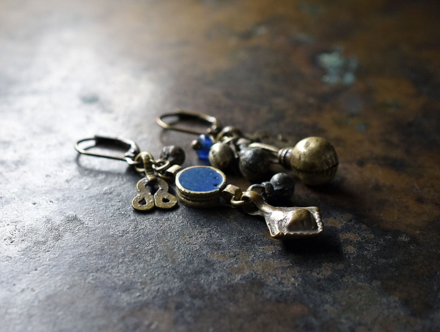 古いメタルにブルーの差し色が目を惹くピアスです。