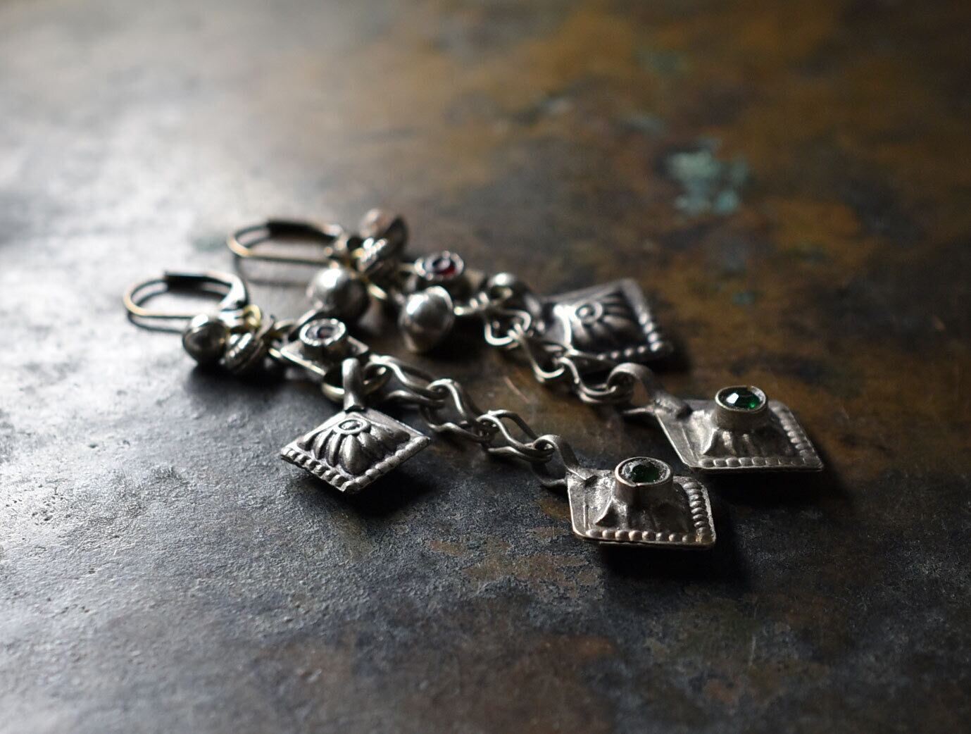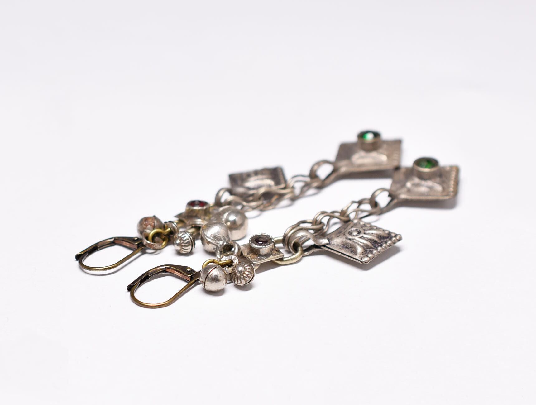 グリーンの装飾がされた菱形のパーツ、赤い装飾が施された繋ぎのパーツ、小さな鈴のようなパーツはアフガニスタンから届いたものです。