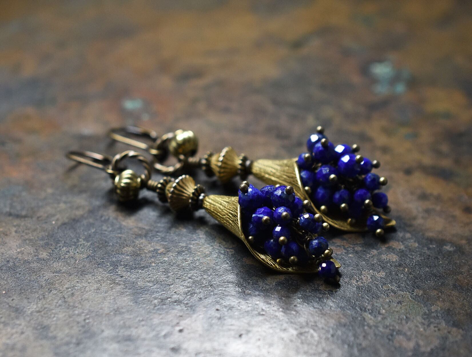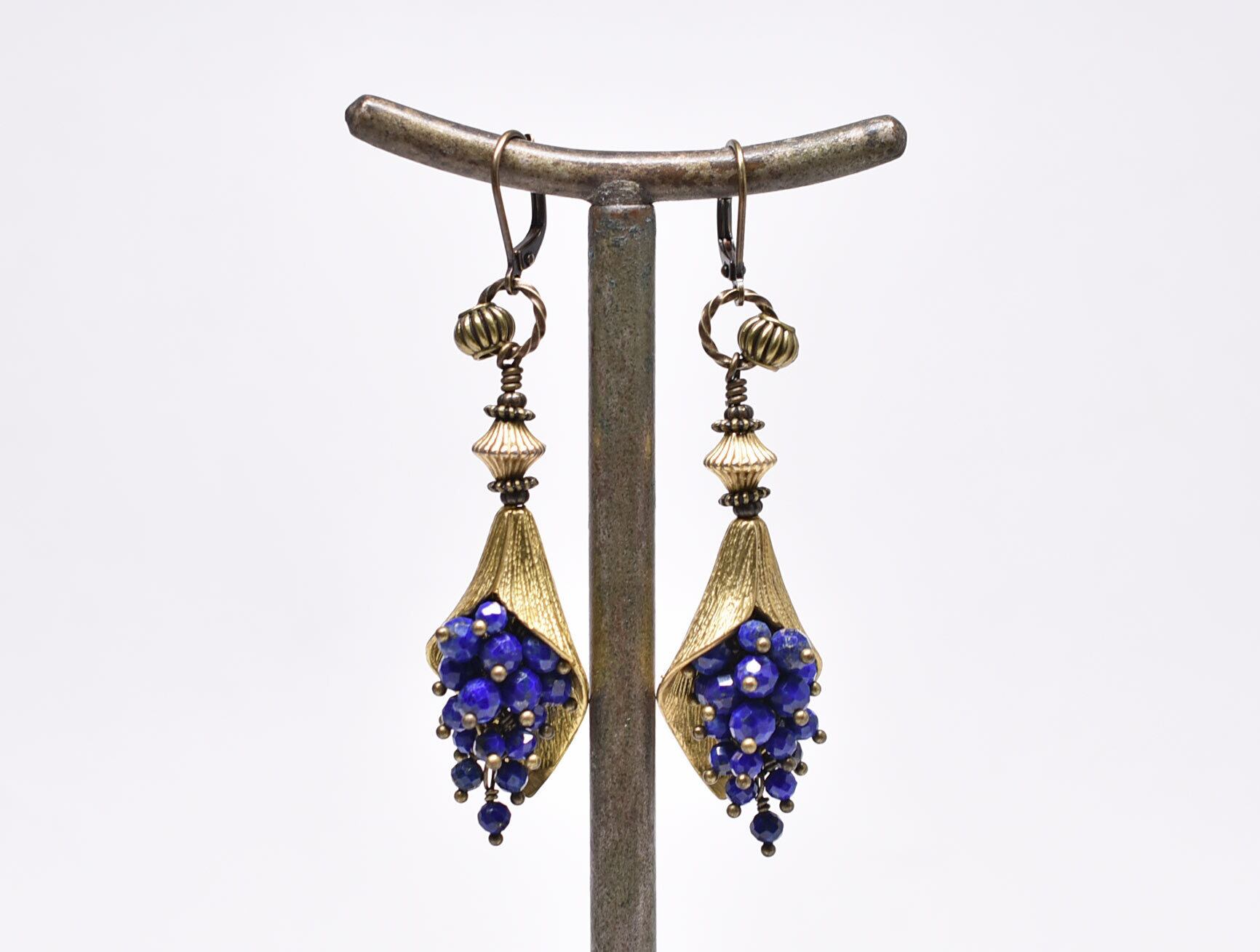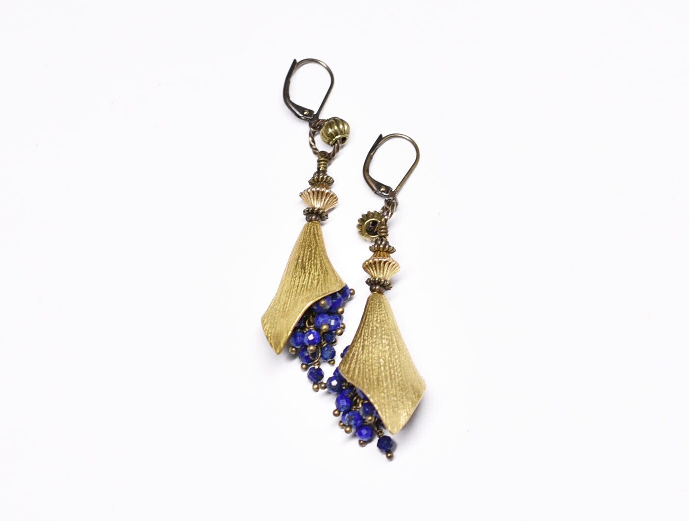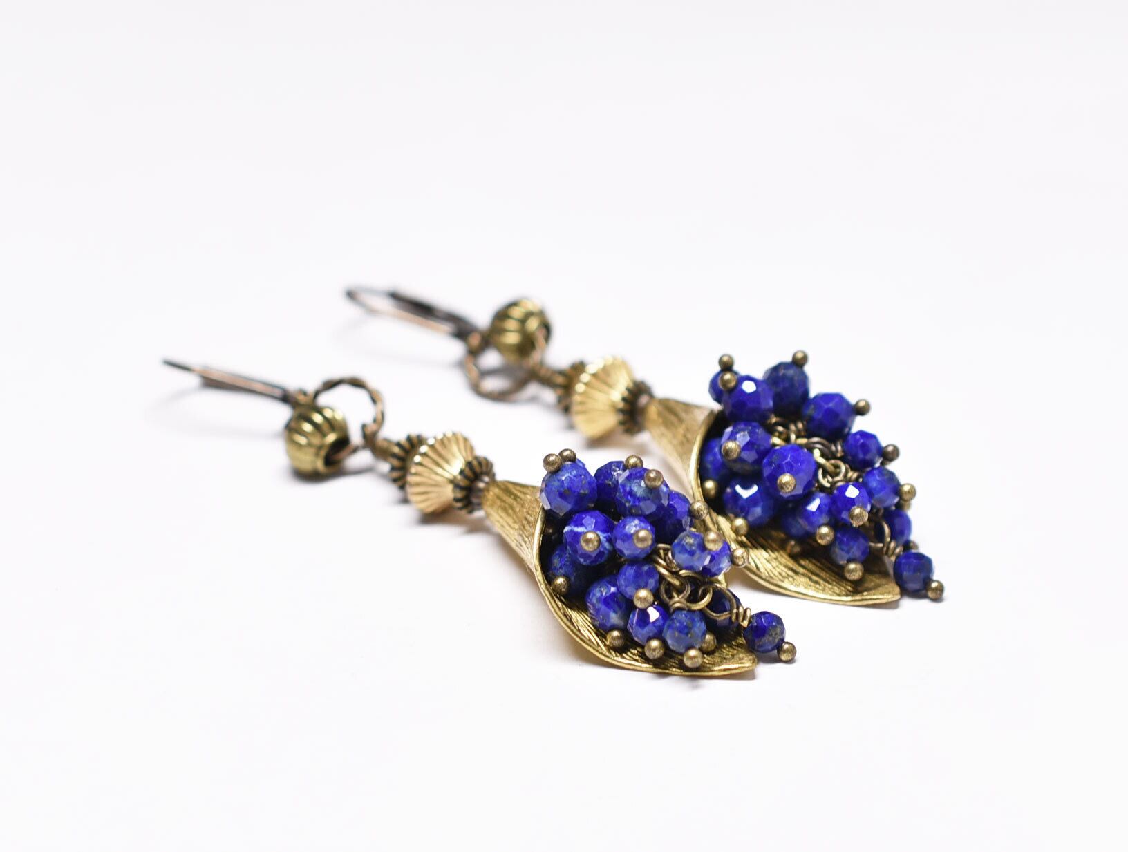 葉っぱブラスにたわわなラピス、ヴィンテージブラスのピアス