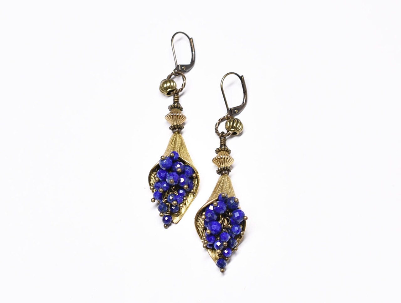 葉っぱブラスにたわわなラピス、ヴィンテージブラスを繋いだピアスです。