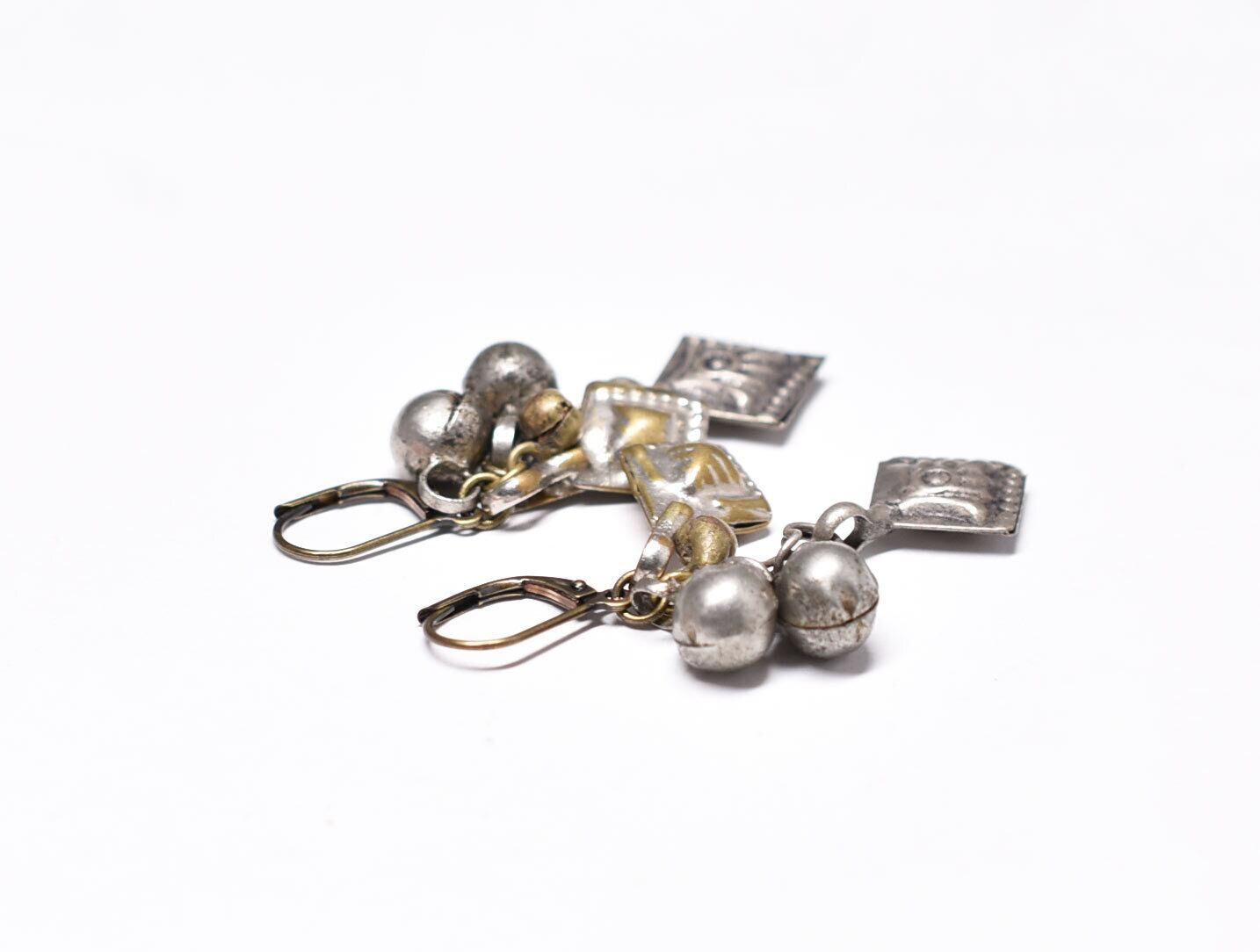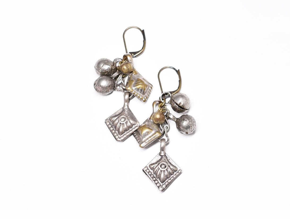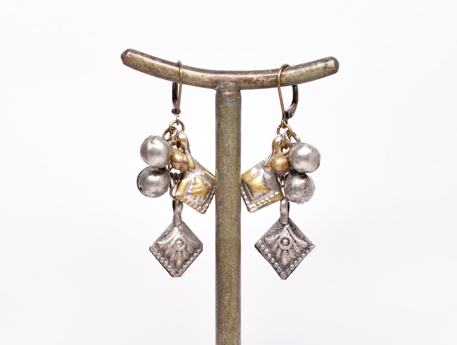 2種類の菱形oldアフガンメタルパーツと鈴のピアス