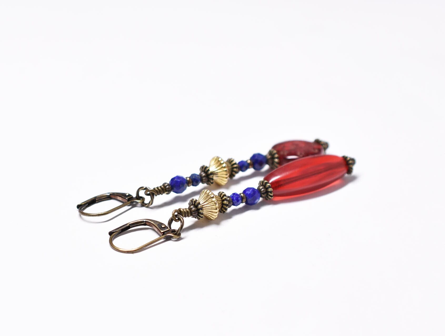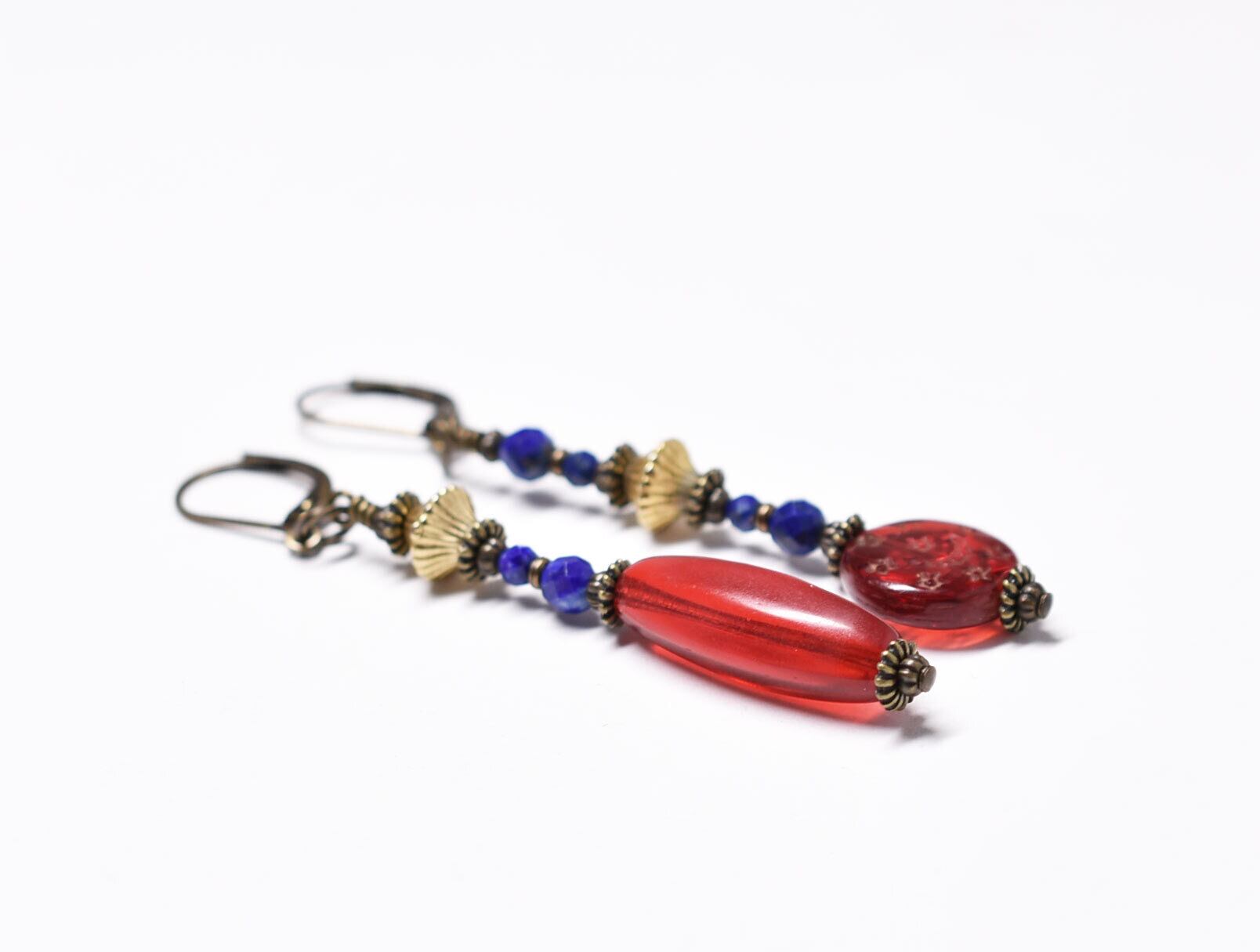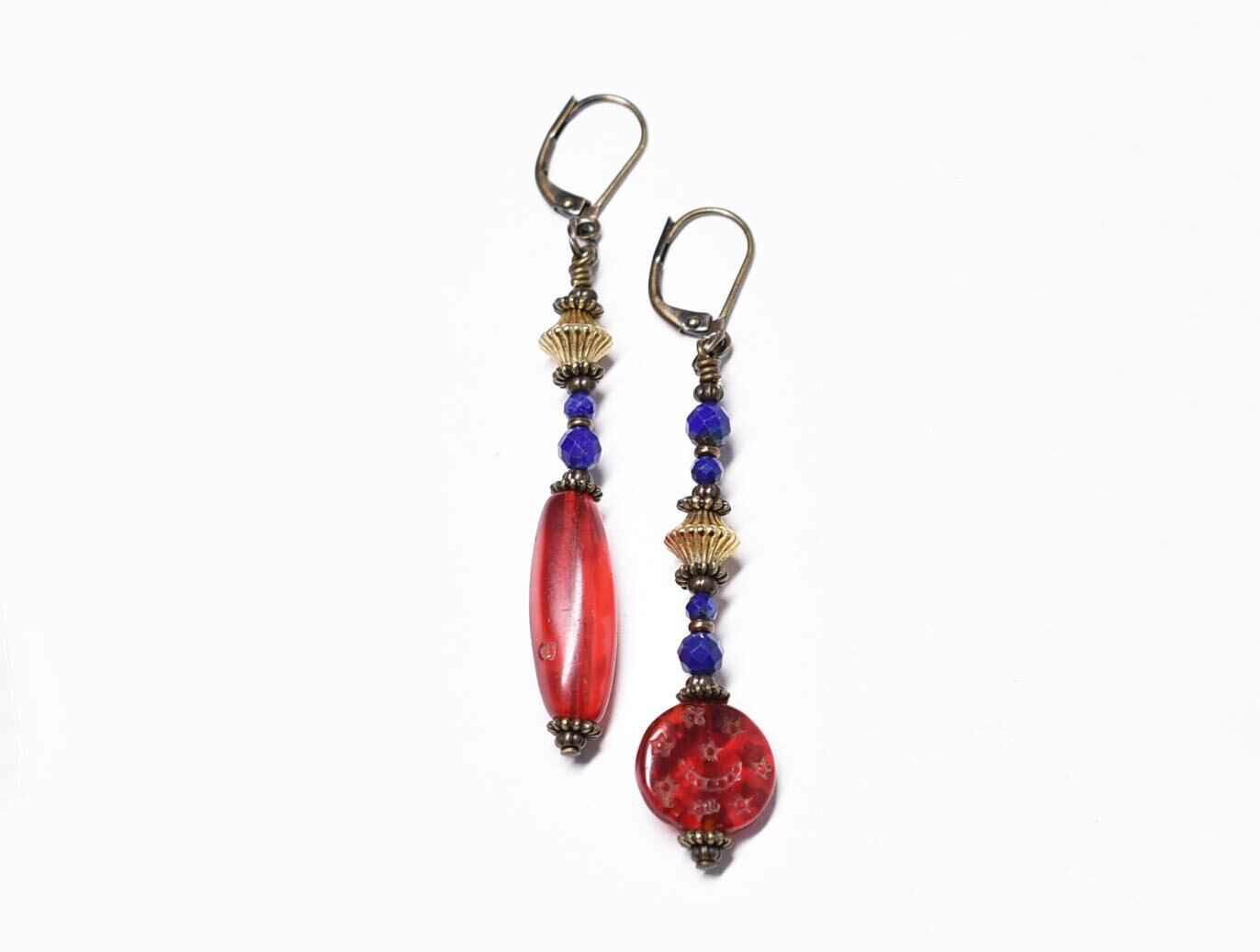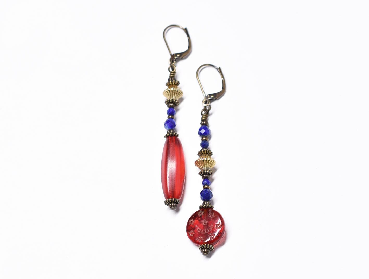 深紅アンティークボヘミアビーズと聖者のビーズ、ラピス、ヴィンテージブラスのアンシメトリーピアスリーピアス