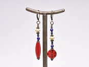 深紅アンティークボヘミアビーズと聖者のビーズ、ラピス、ヴィンテージブラスを繋いだやや長めなアンシメトリーのピアスです。