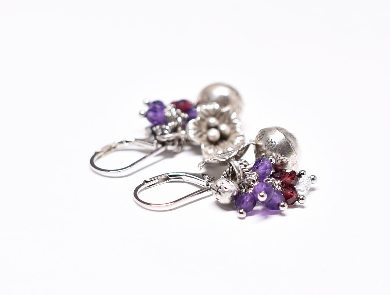 鈴とお花カレンシルバー、たわわなガーネットとアメジスト、クォーツ、インドシルバー鈴のピアス