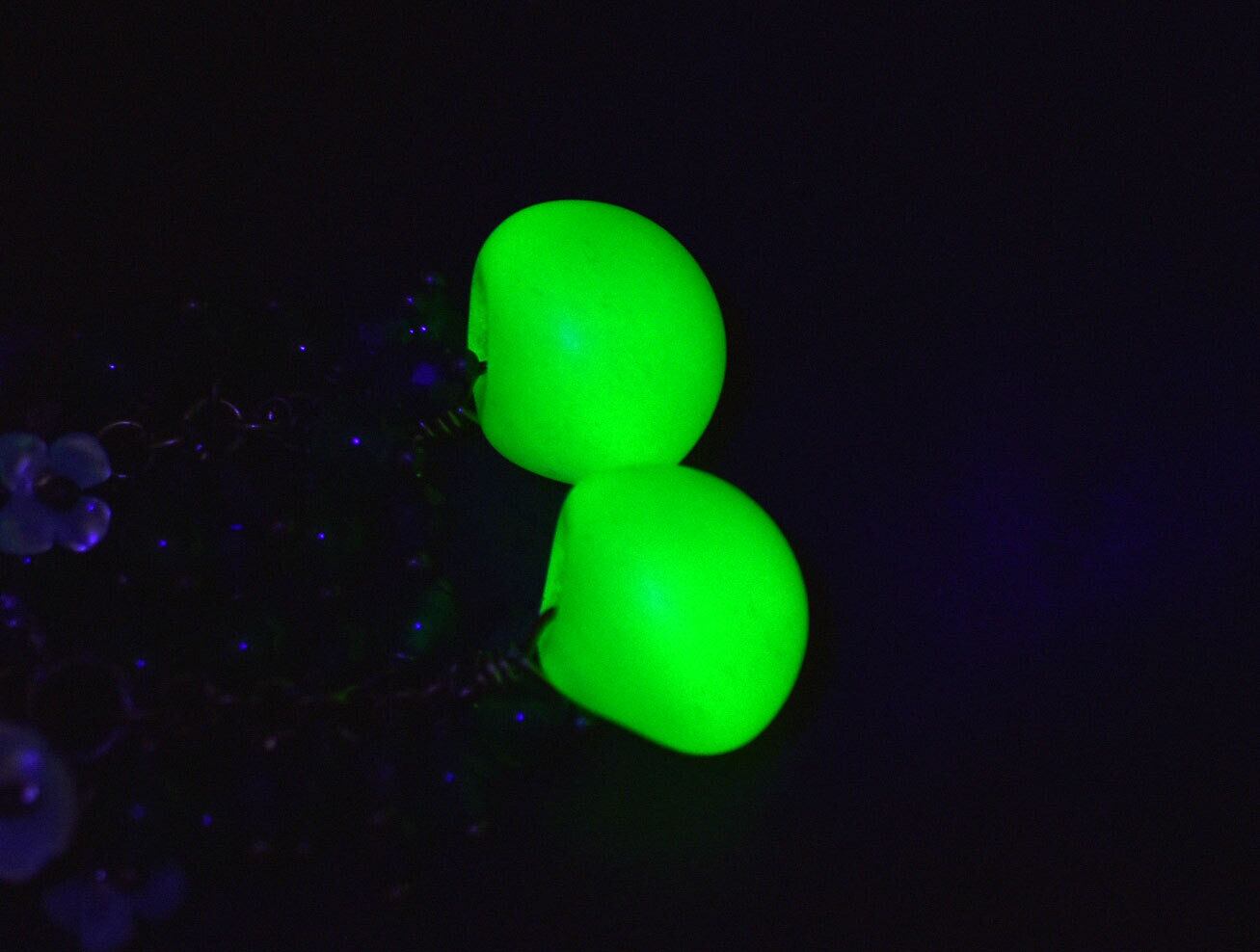 ぽってりとしたレモンイエローのビーズは、極々微量のウランで発色させています。ブラックライトを当てると光ります!