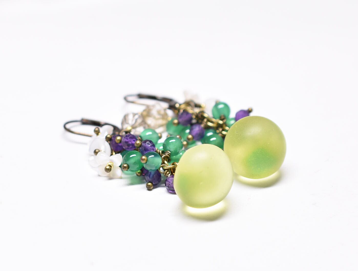 まん丸なグリーン瑪瑙と、カットが施されたアメジストをたわわに実らせました。